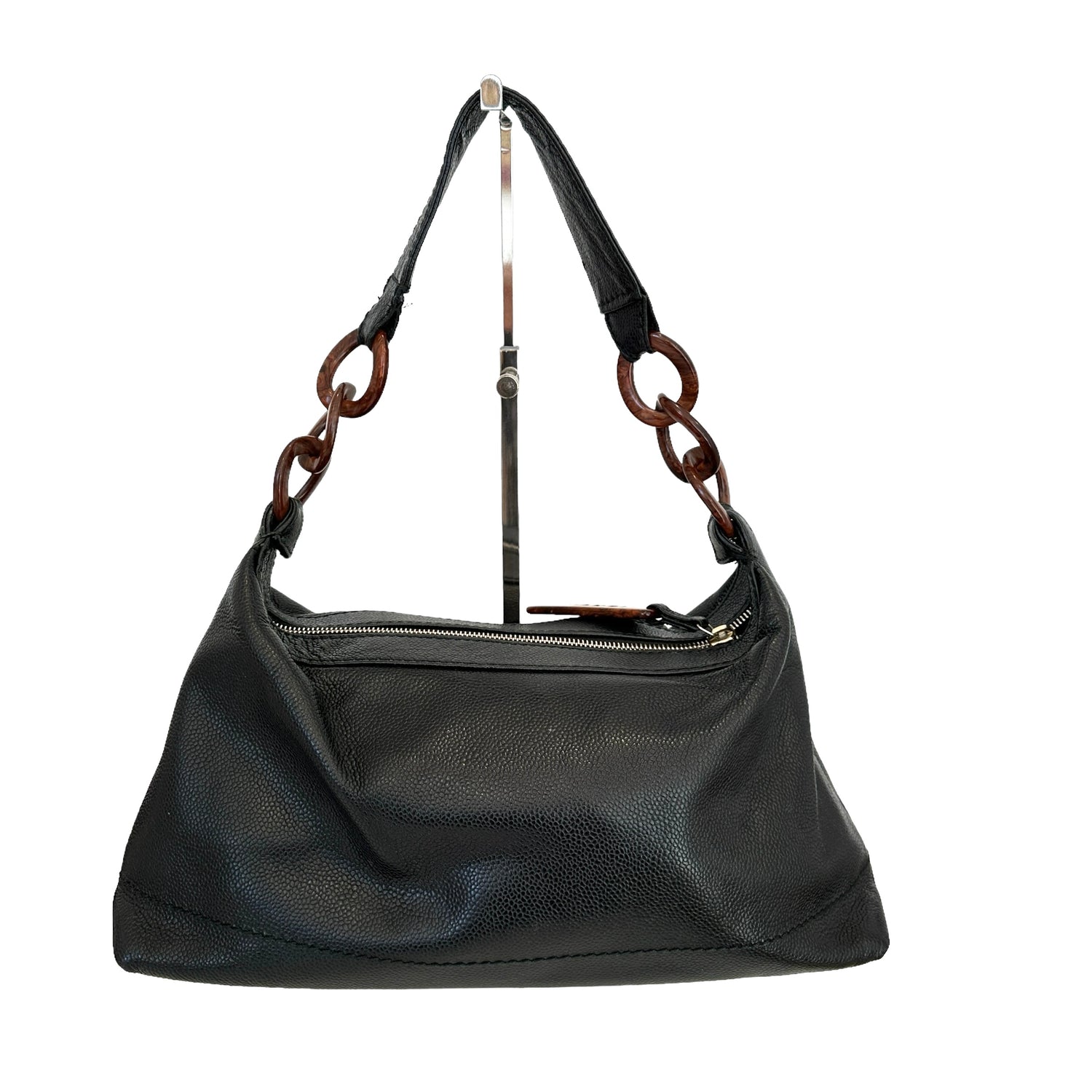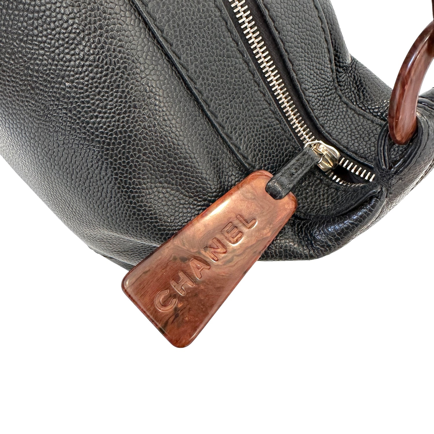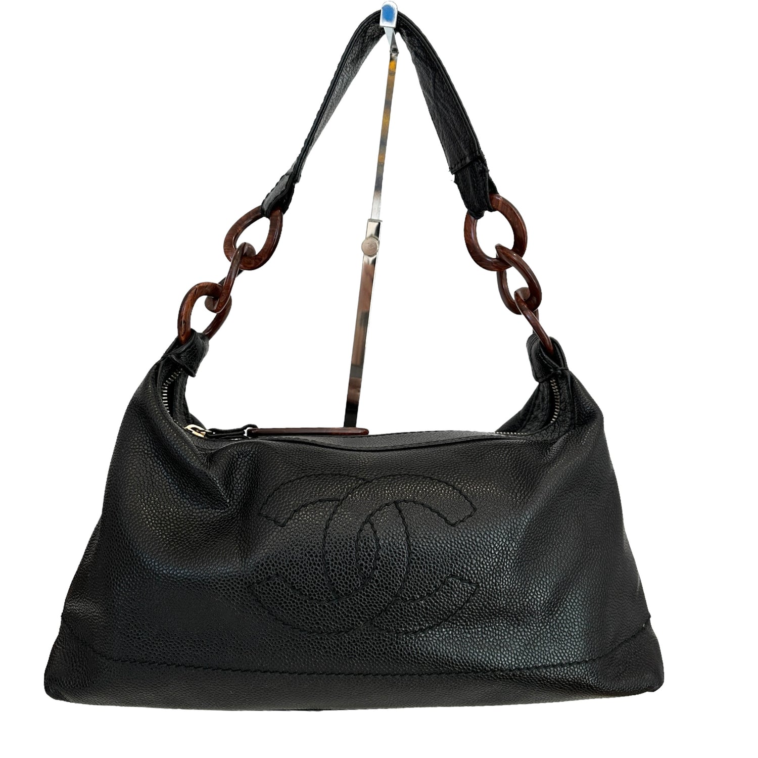 Chanel black caviar hobo bag. CC logo at front. Wooden zipper and chain. CC logo canvas lining. Two zipper interior pockets.