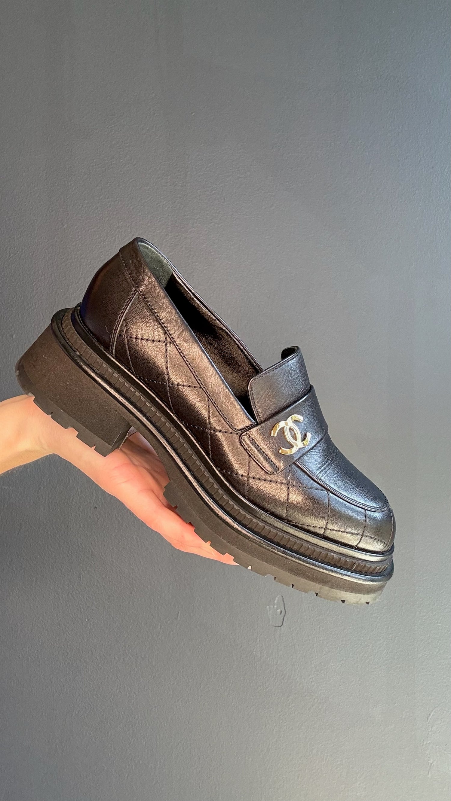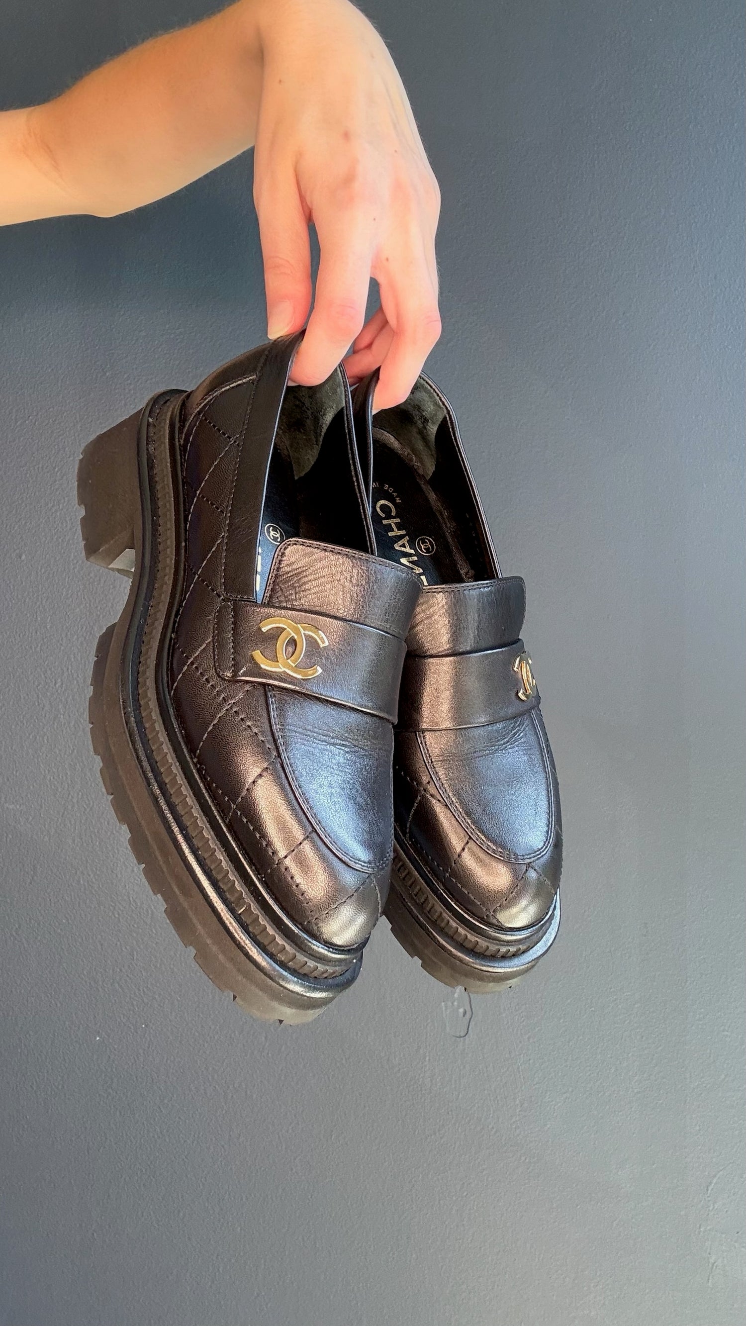 Chanel chunky black loafers. Gold CC logo on top. Designer size 35.5