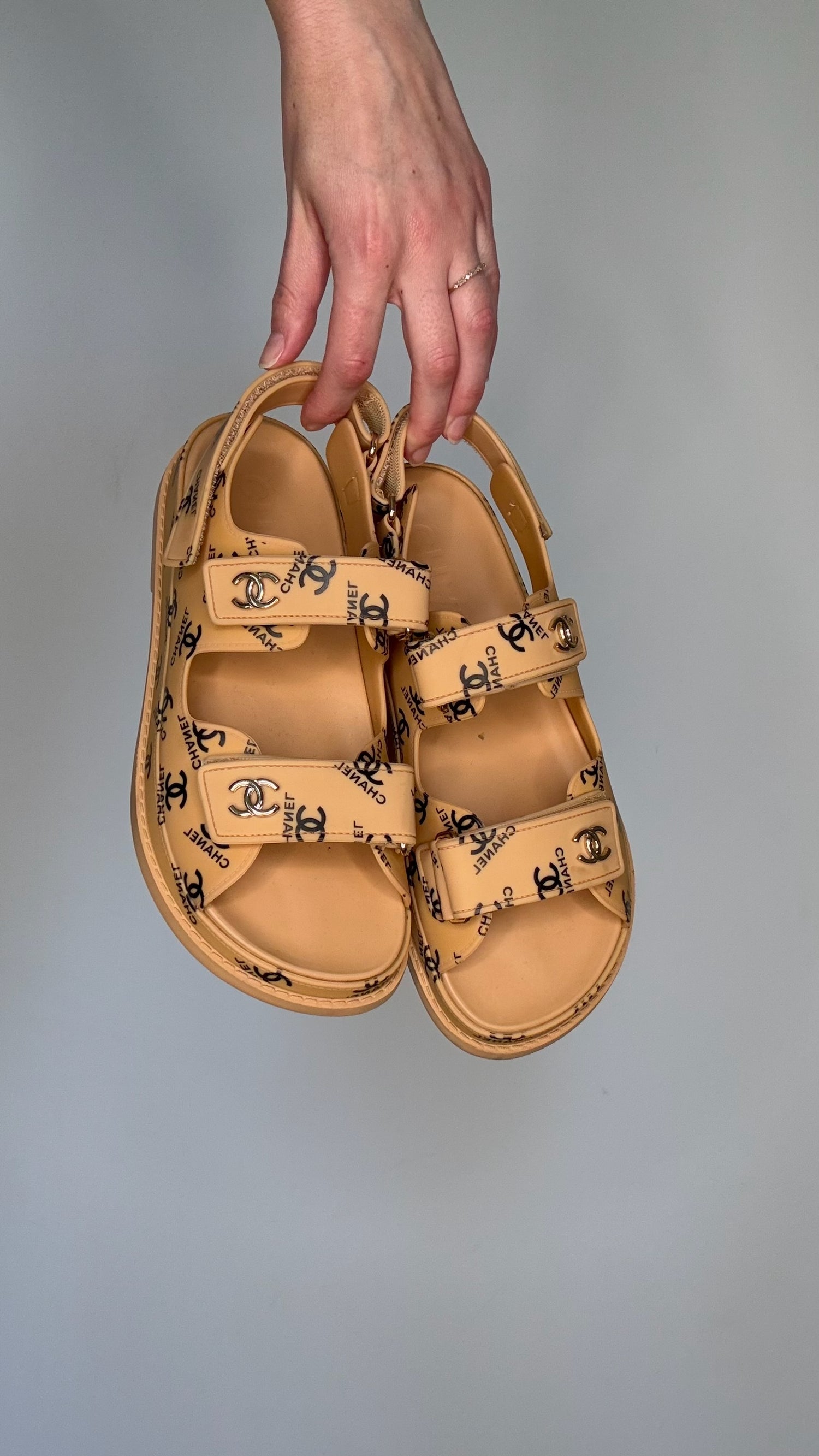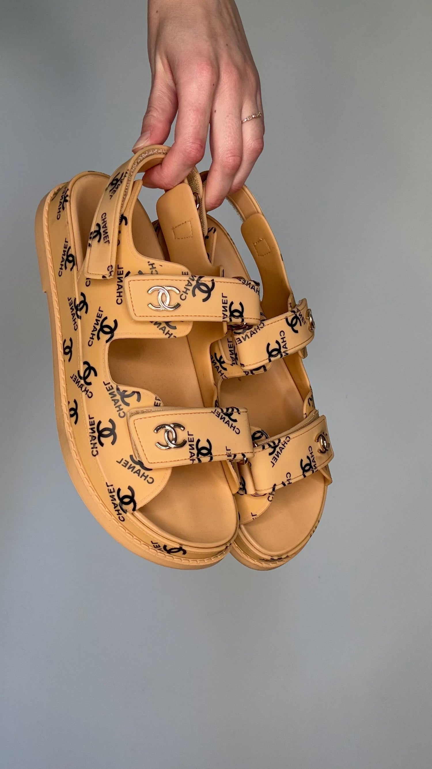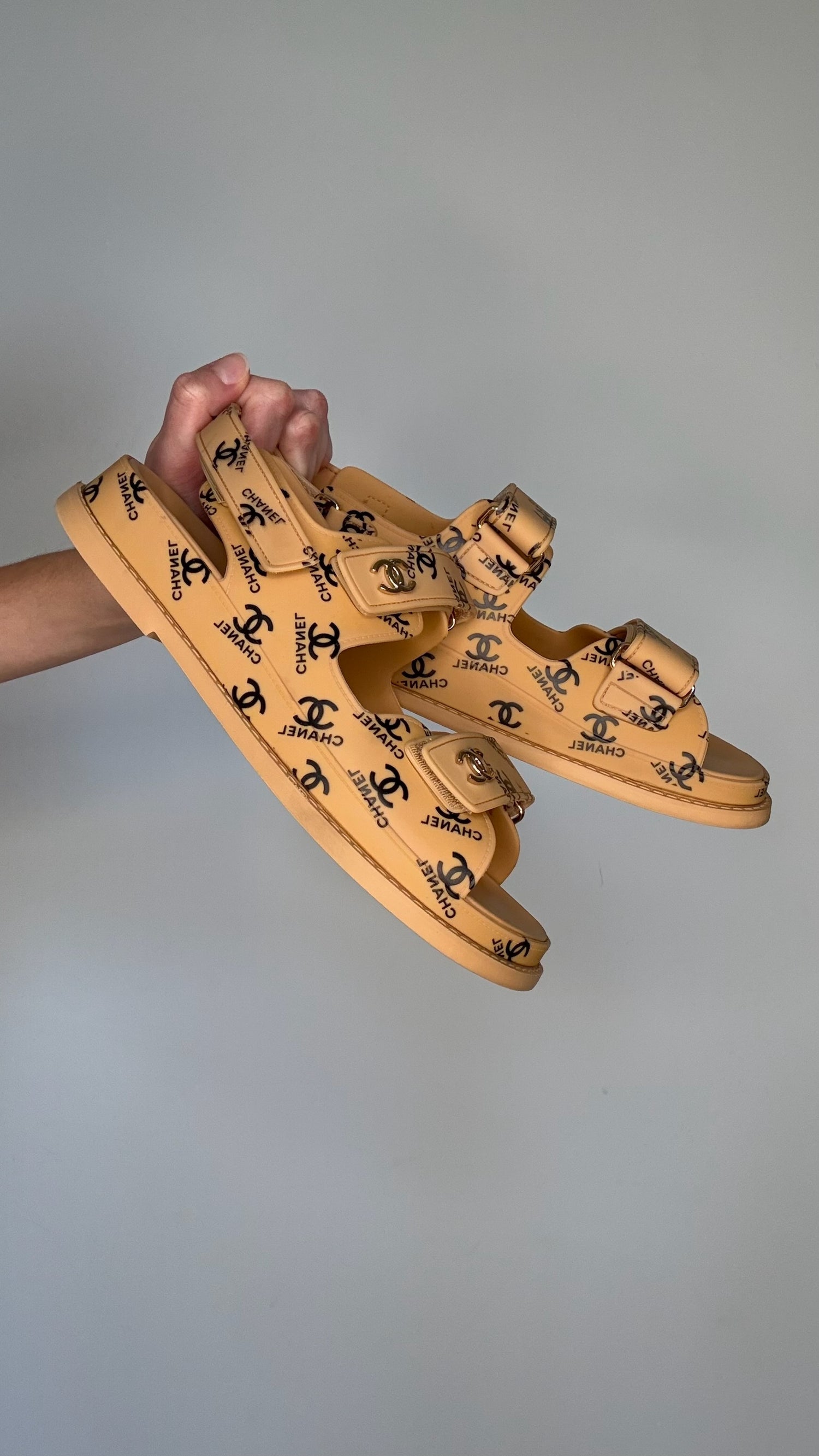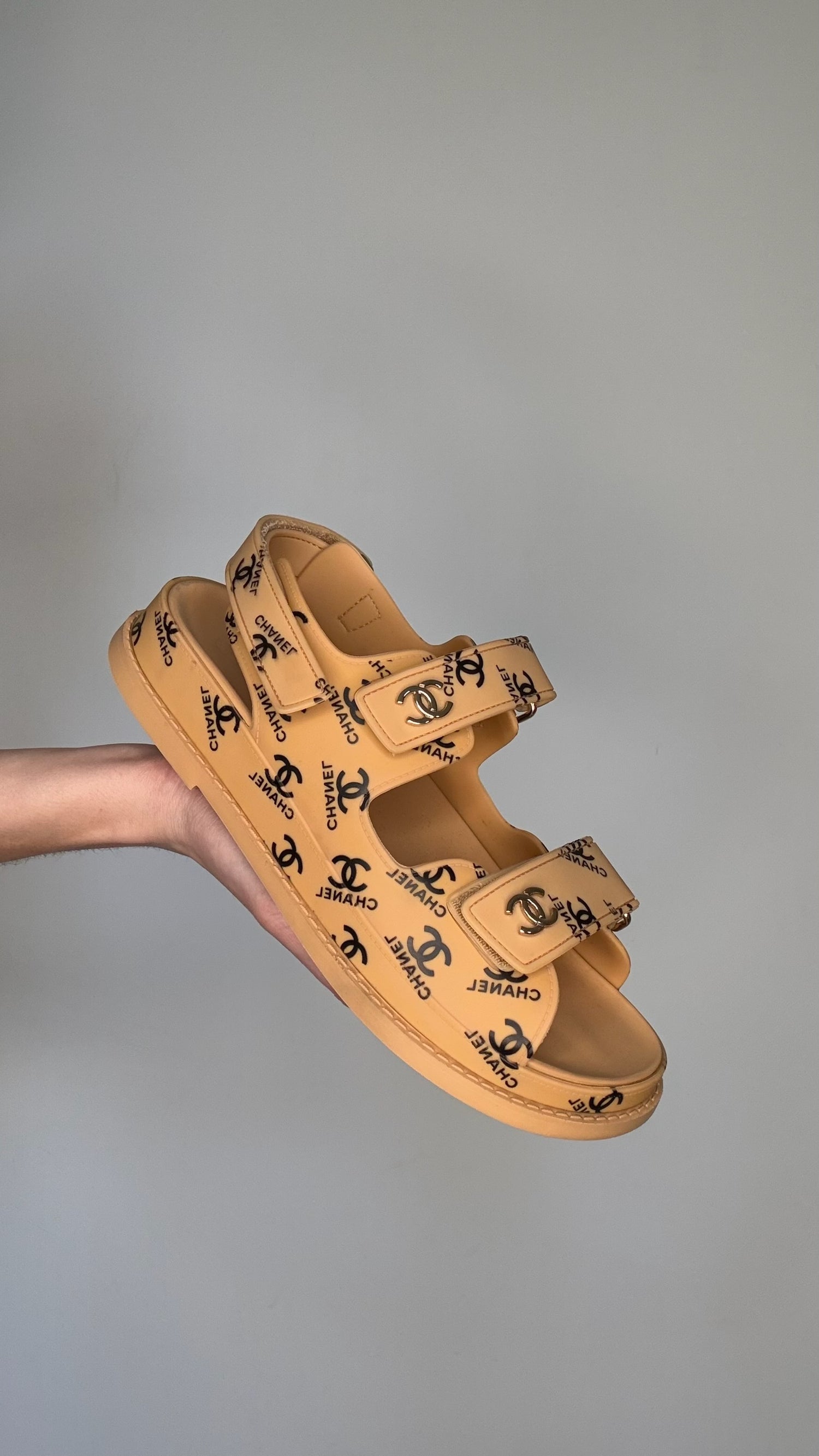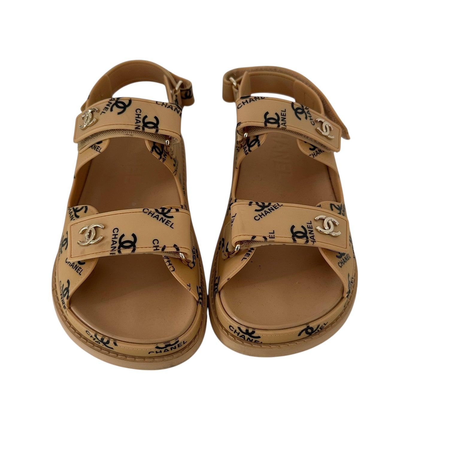 Chanel dad sandals. Caramel color rubber with black logo throughout. Gold-tone CC logo. Adjustable velcro straps. Designer size 37.