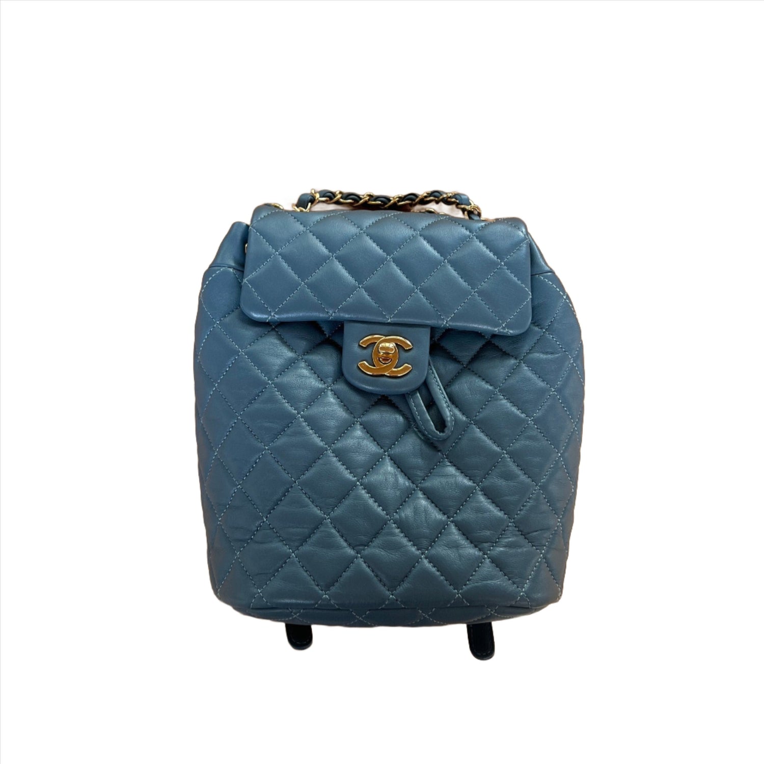 Chanel blue jeans leather backpack. Gold-tone hardware.
