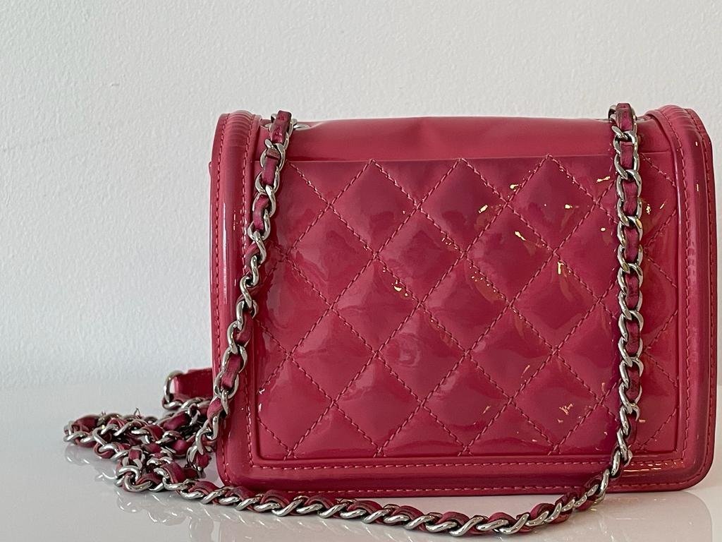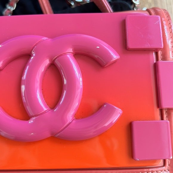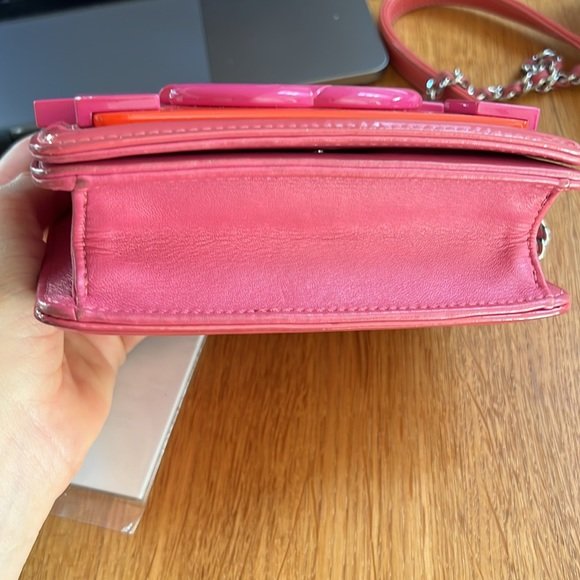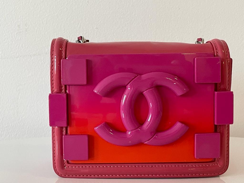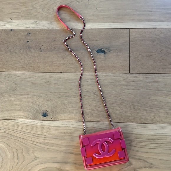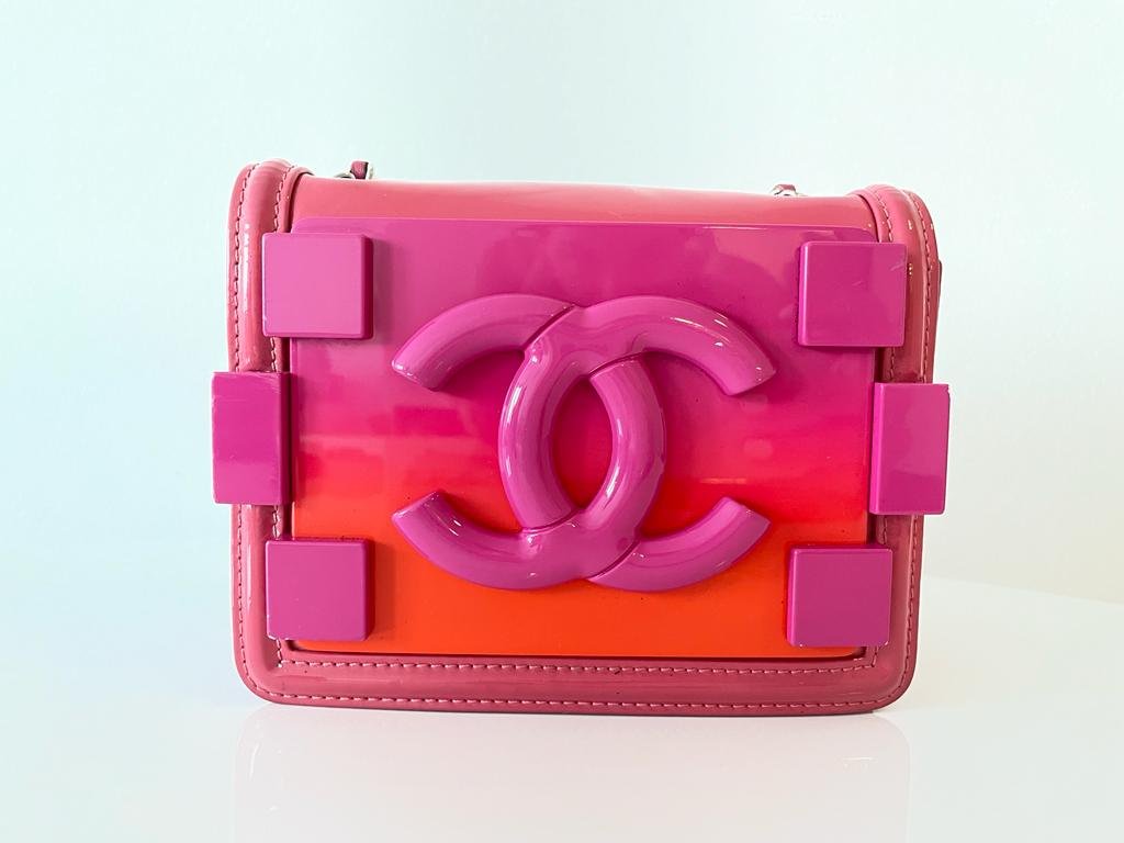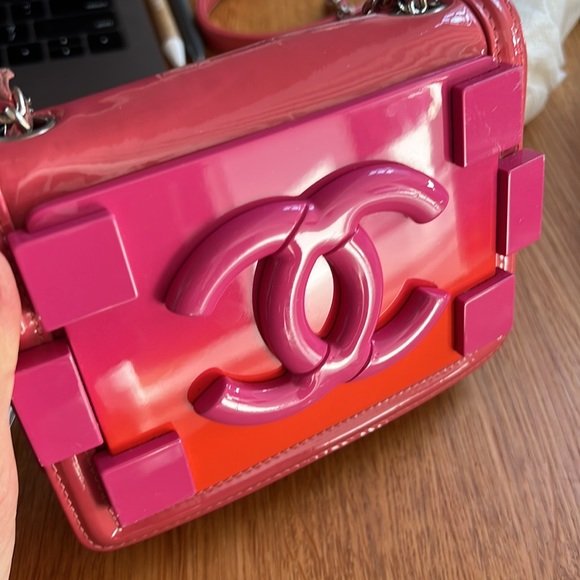 Plexiglass and Patent Leather. One single chain. Silver-tone hardware. Pink lambskin leather. CC logo at front.