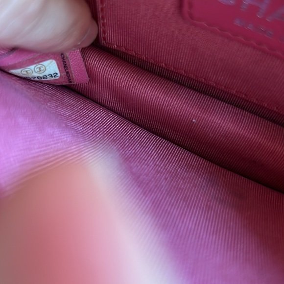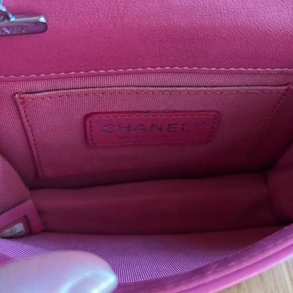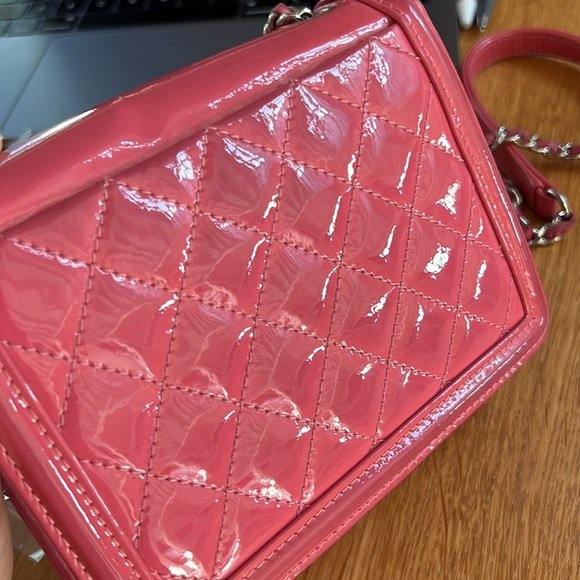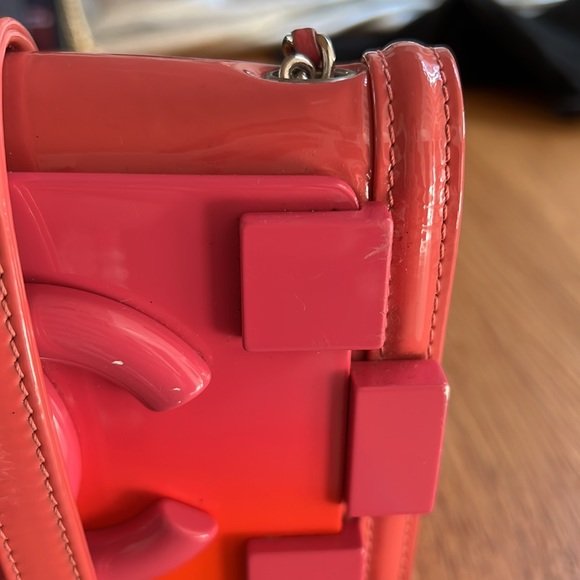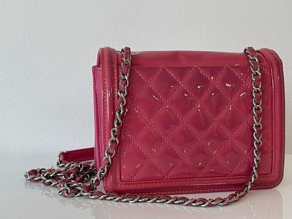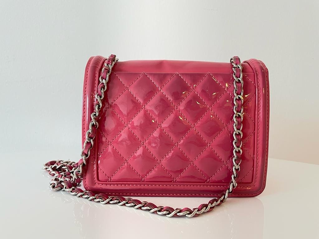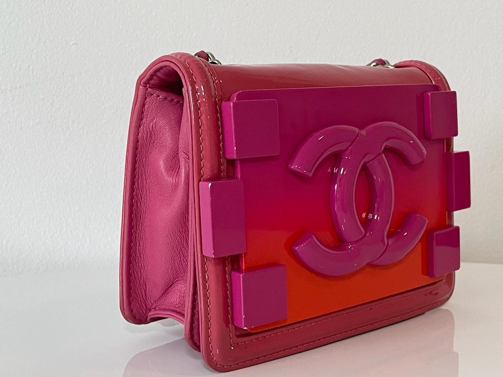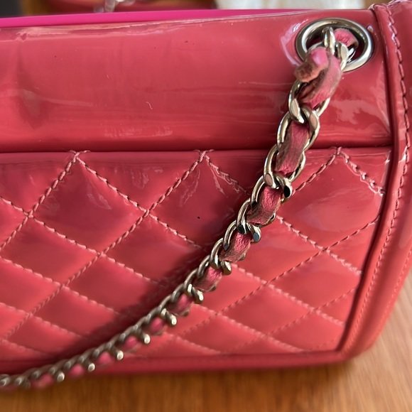 Plexiglass and Patent Leather. One single chain. Silver-tone hardware. Pink lambskin leather. CC logo at front.