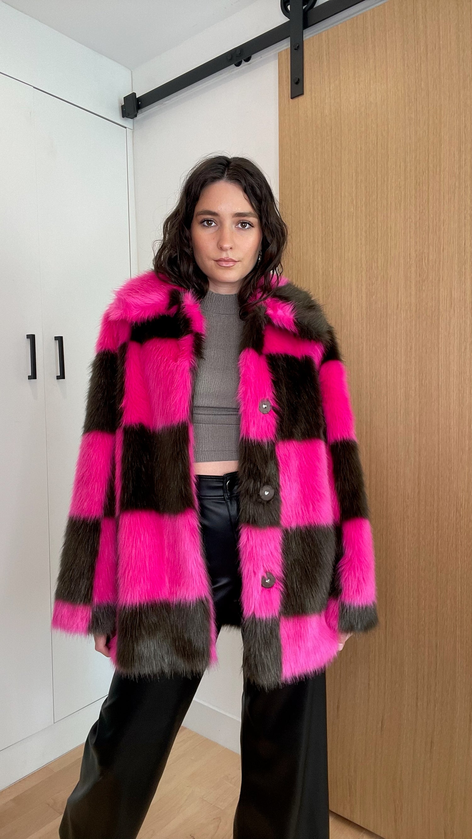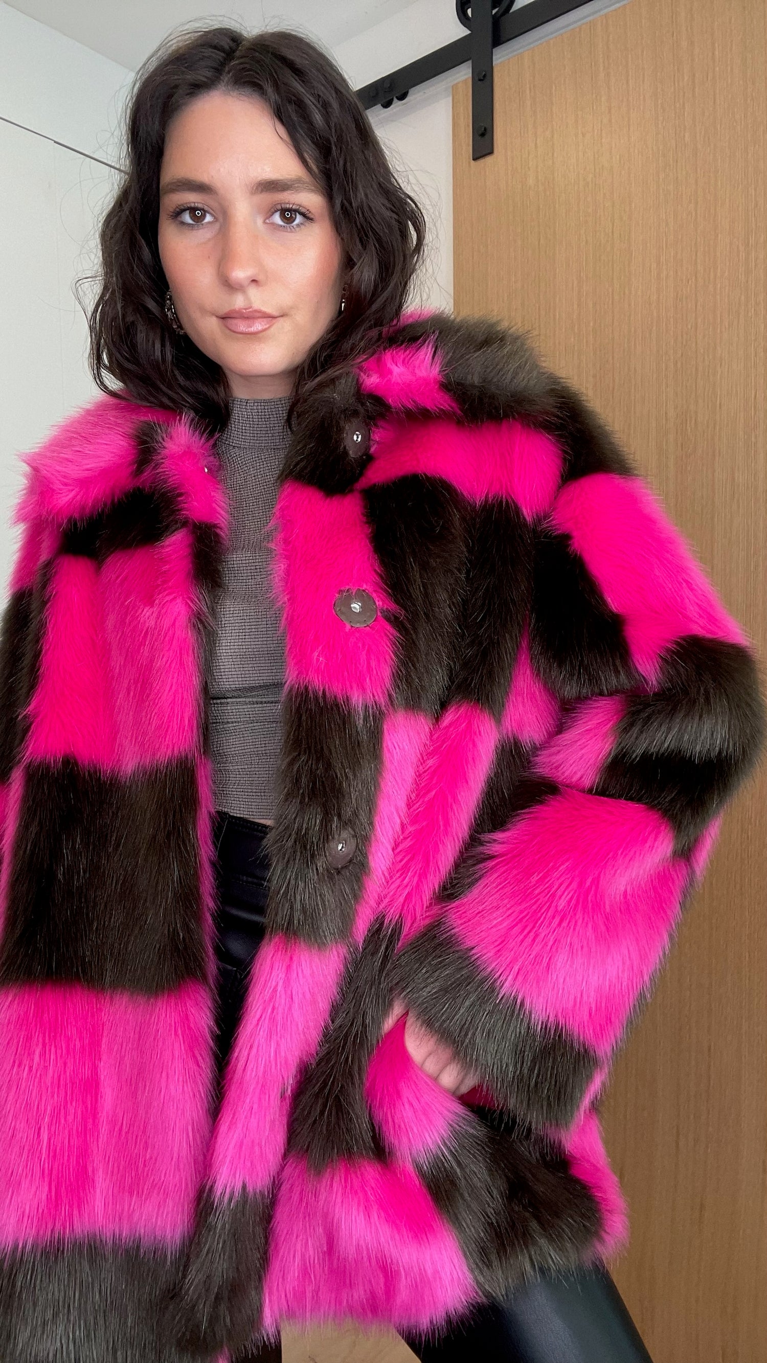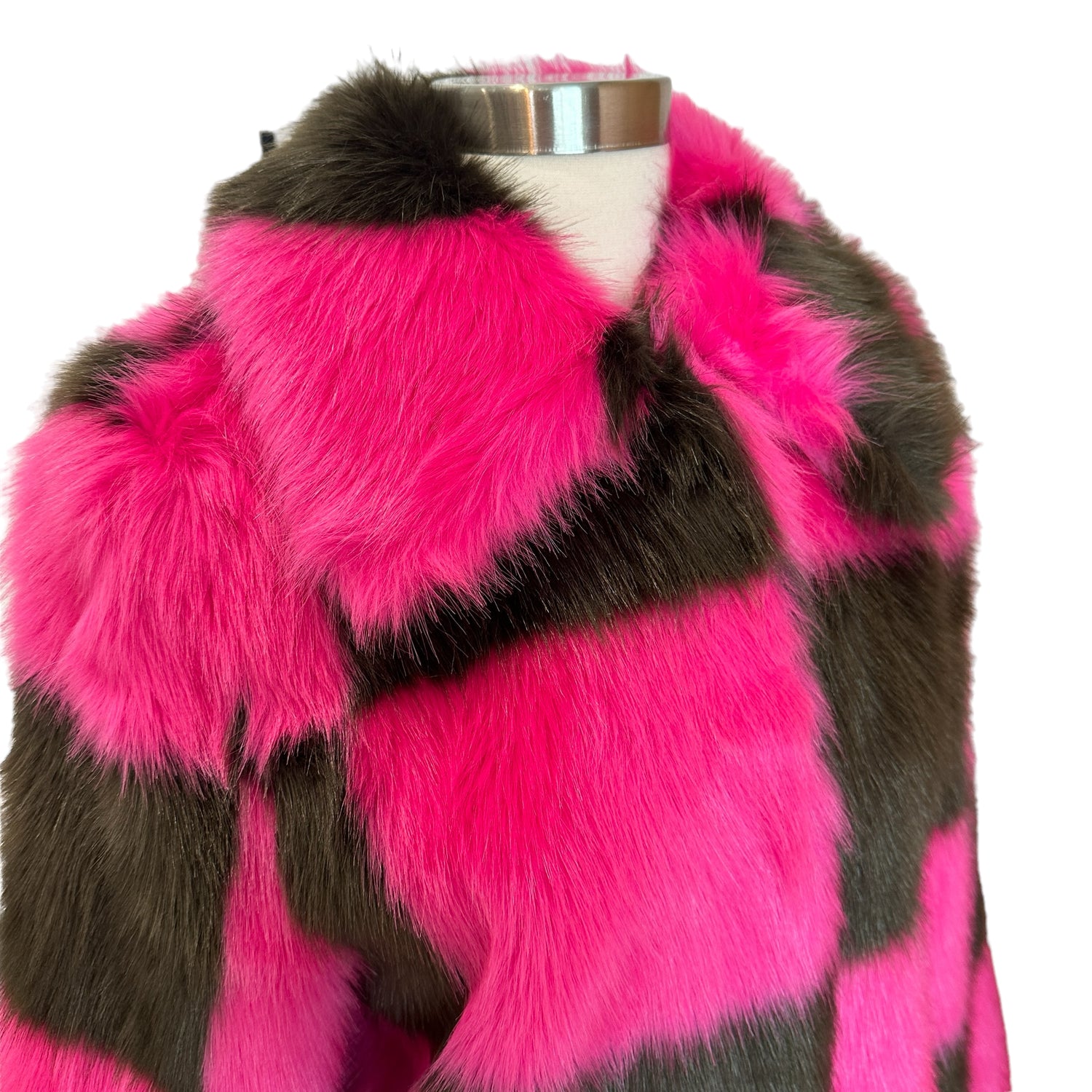 Stand Studio faux-fur jacket. Chocolate brown and fuchsia. Oversized. Pointed collar. Snap buttons closure at front. Slit pockets. Designer size 34.