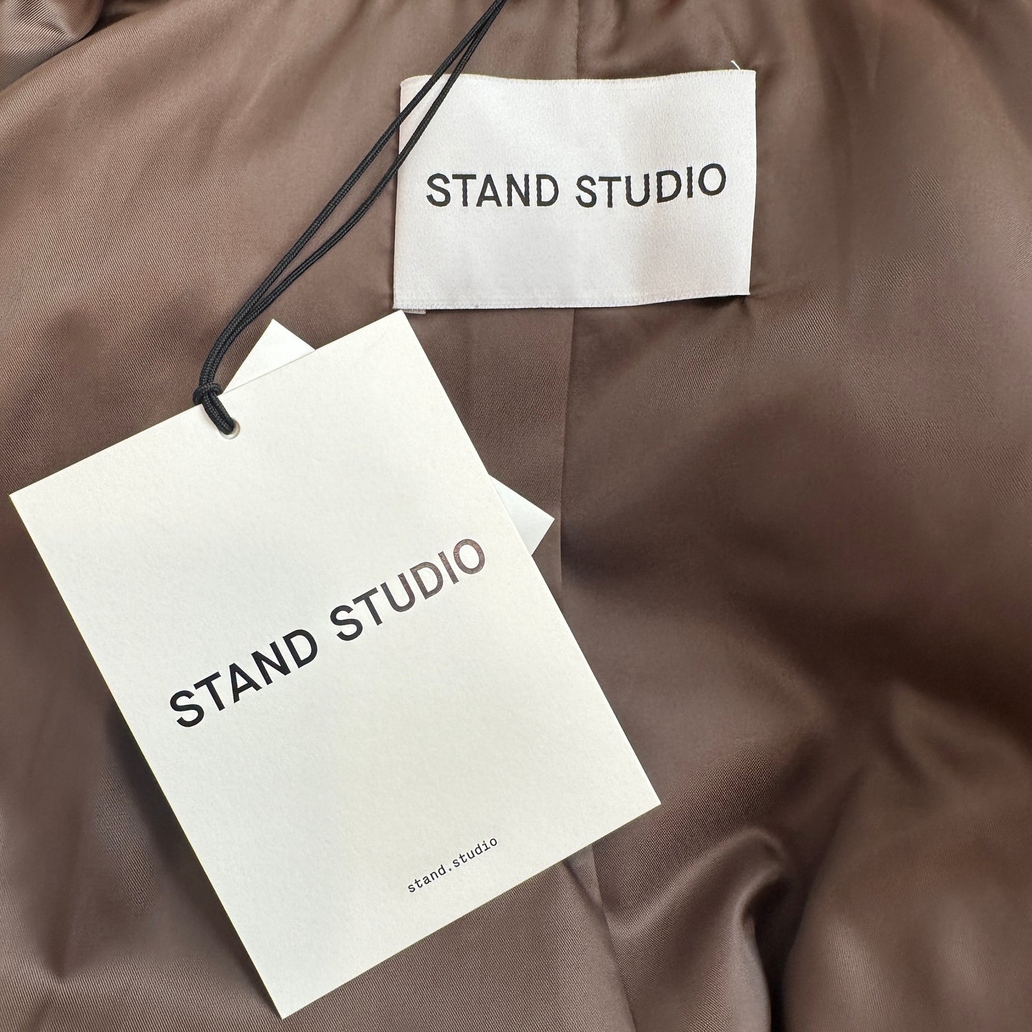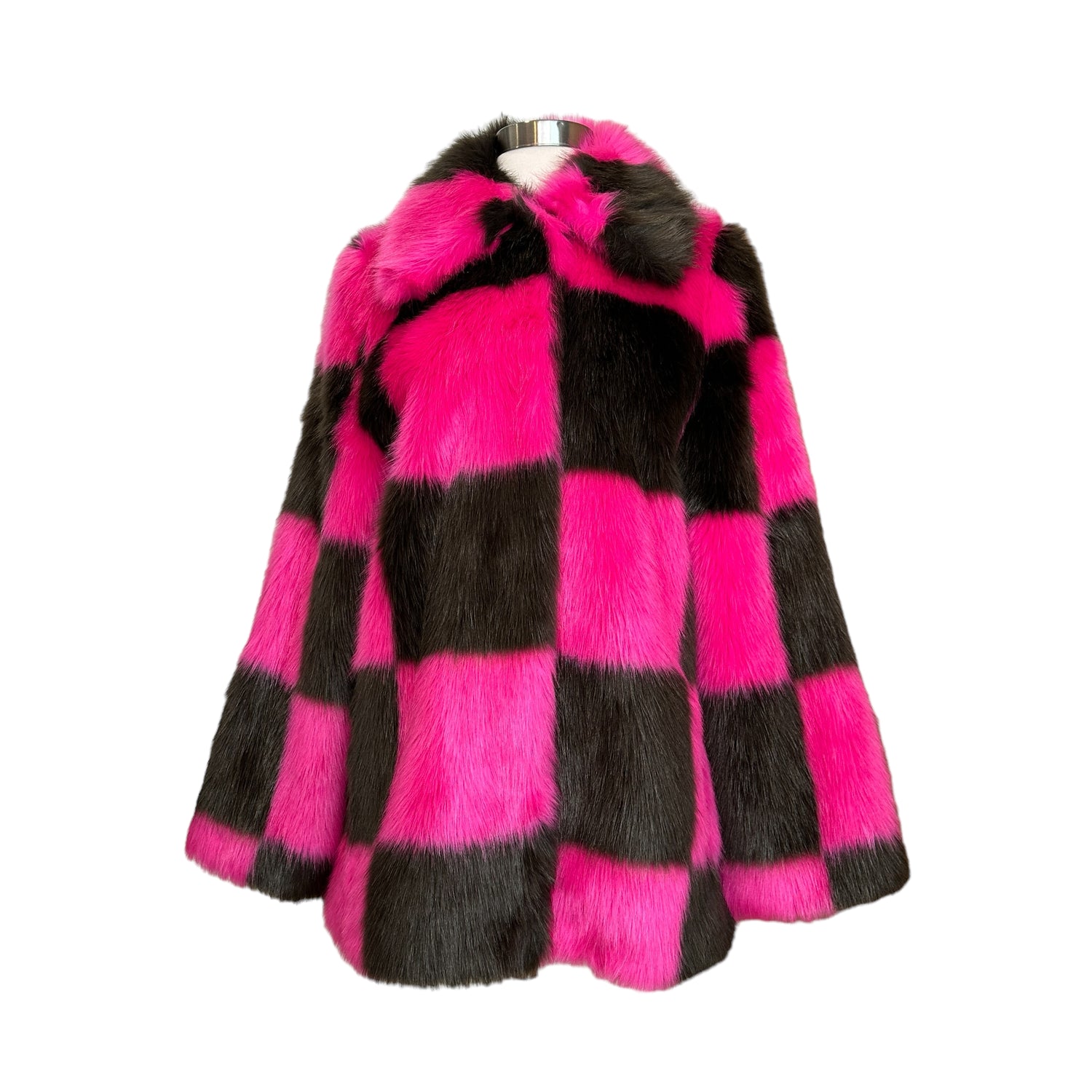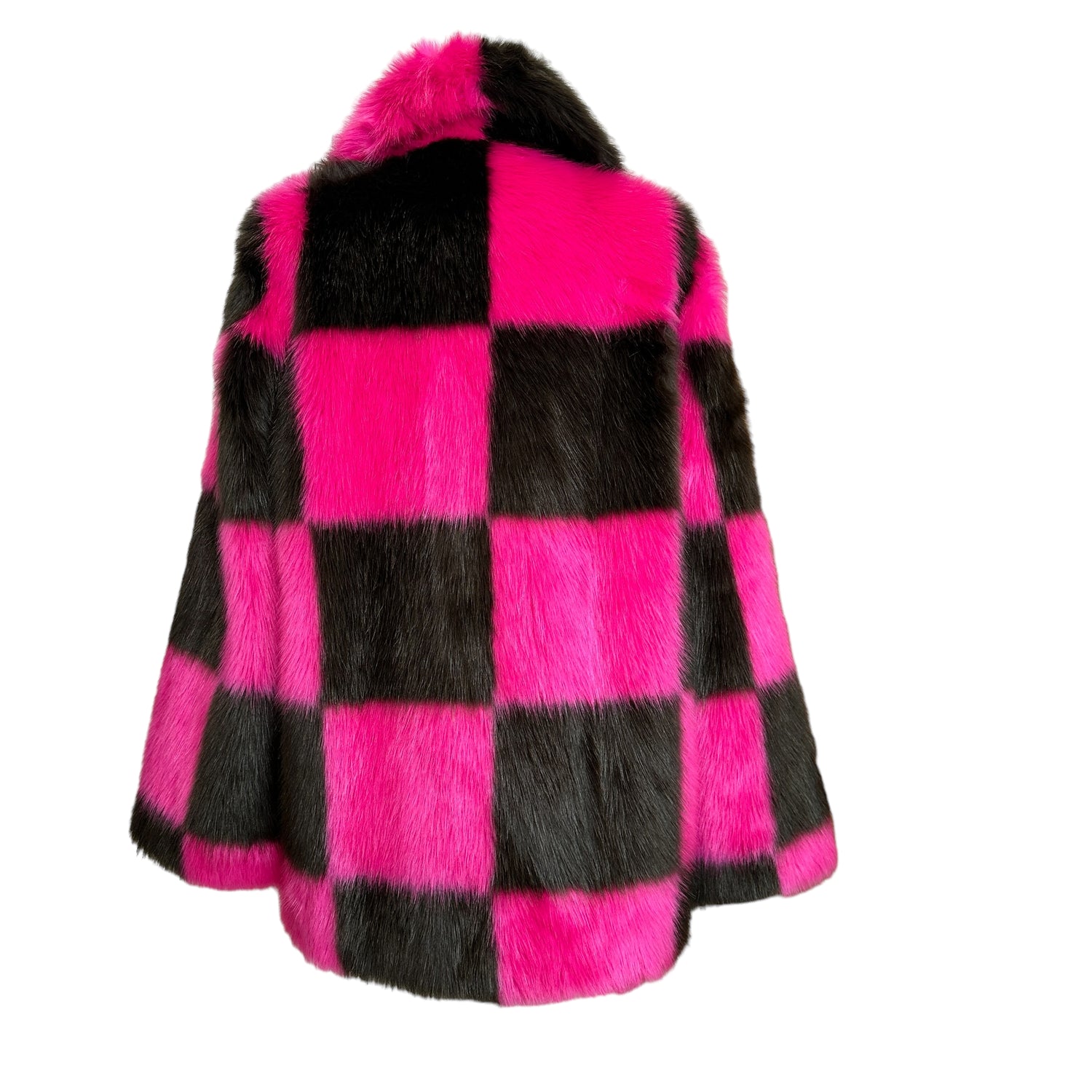 Stand Studio faux-fur jacket. Chocolate brown and fuchsia. Oversized. Pointed collar. Snap buttons closure at front. Slit pockets. Designer size 34.