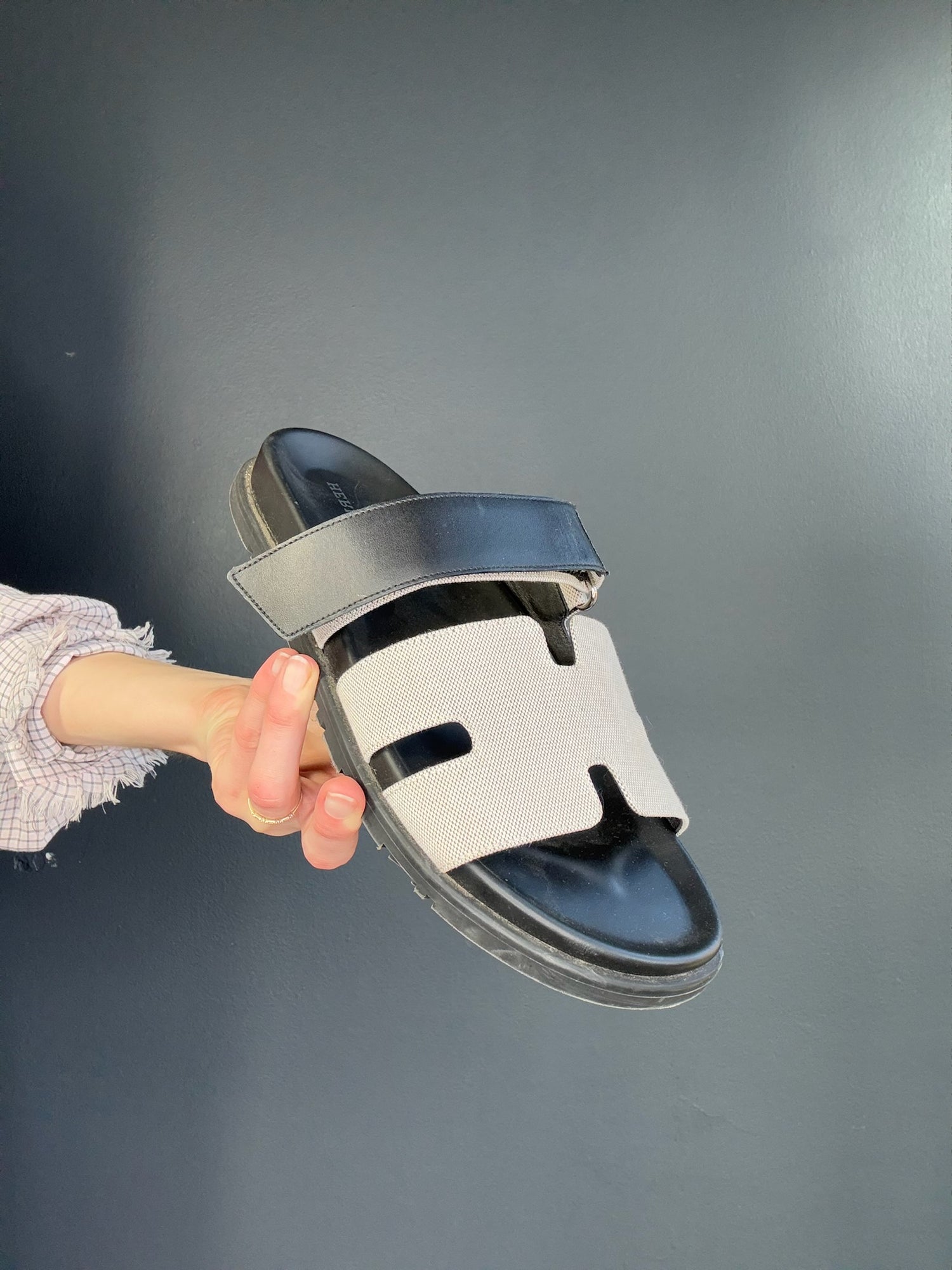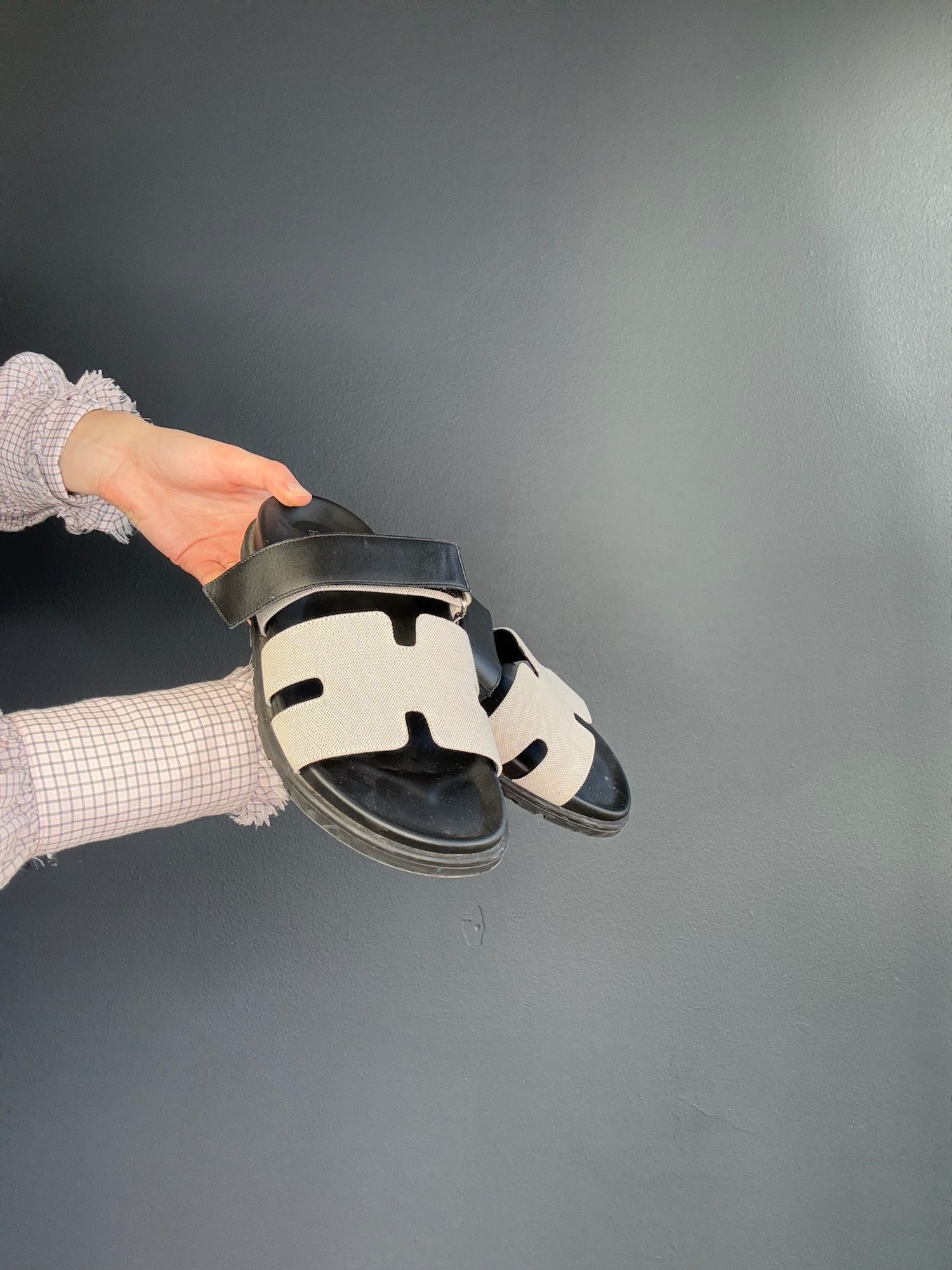 Hermes Chypre beige and black sandals. Adjustable velcro strap. Designer size 41.