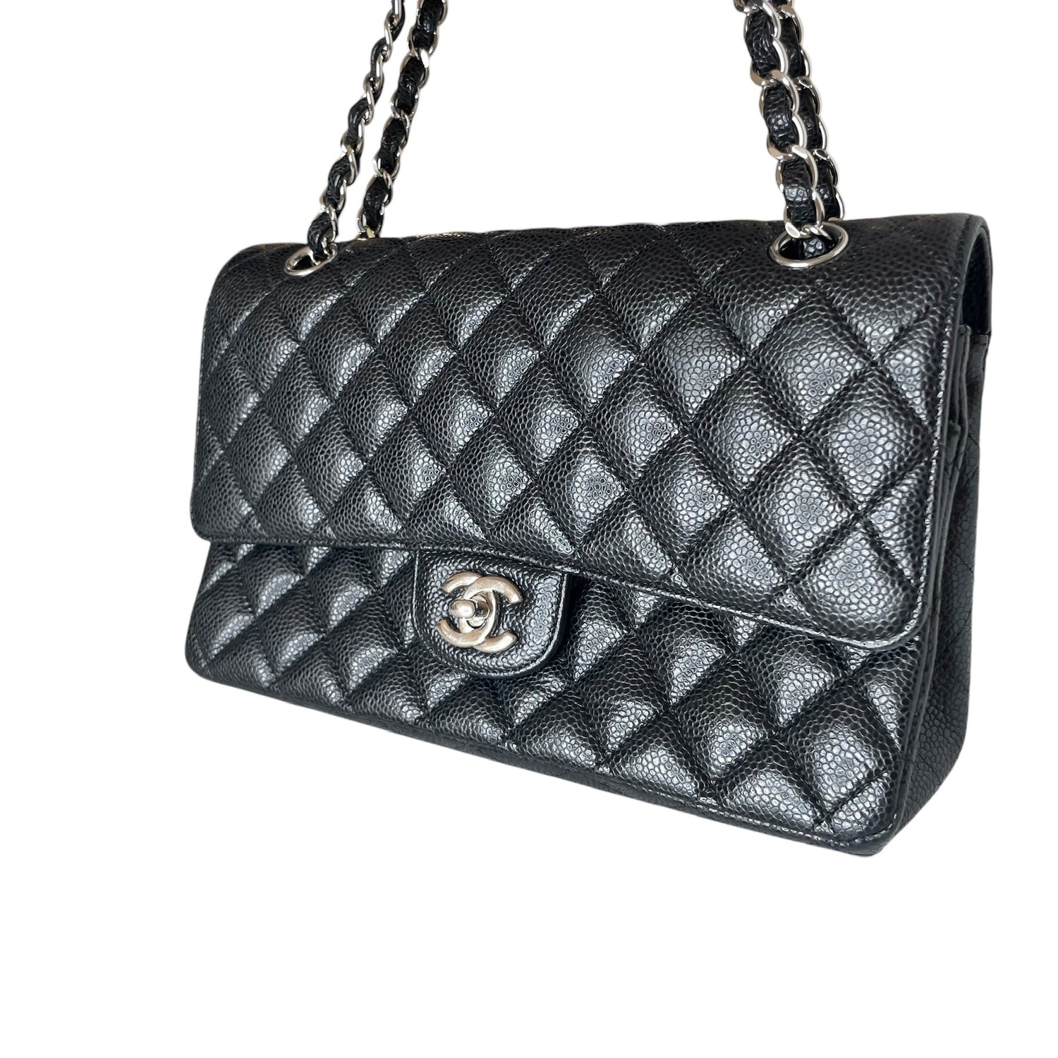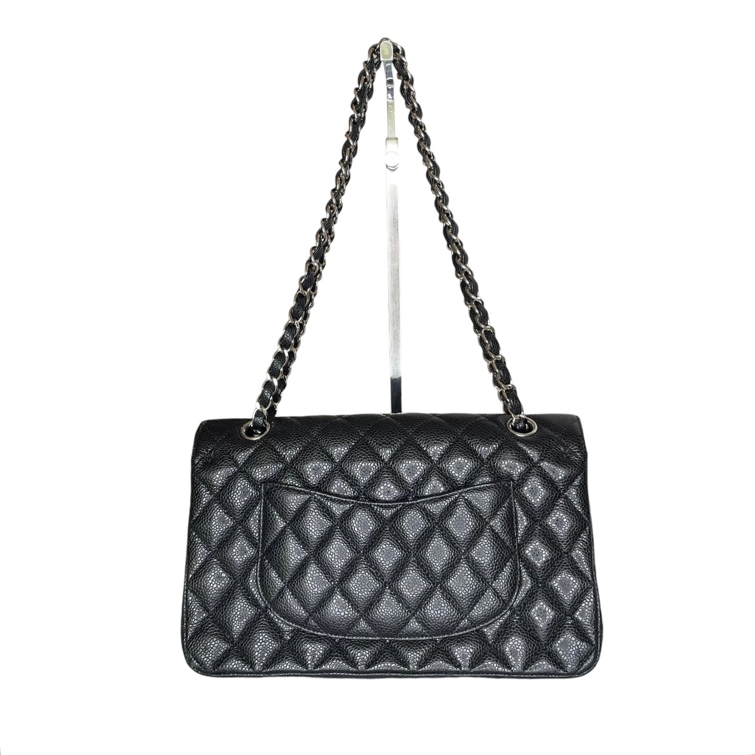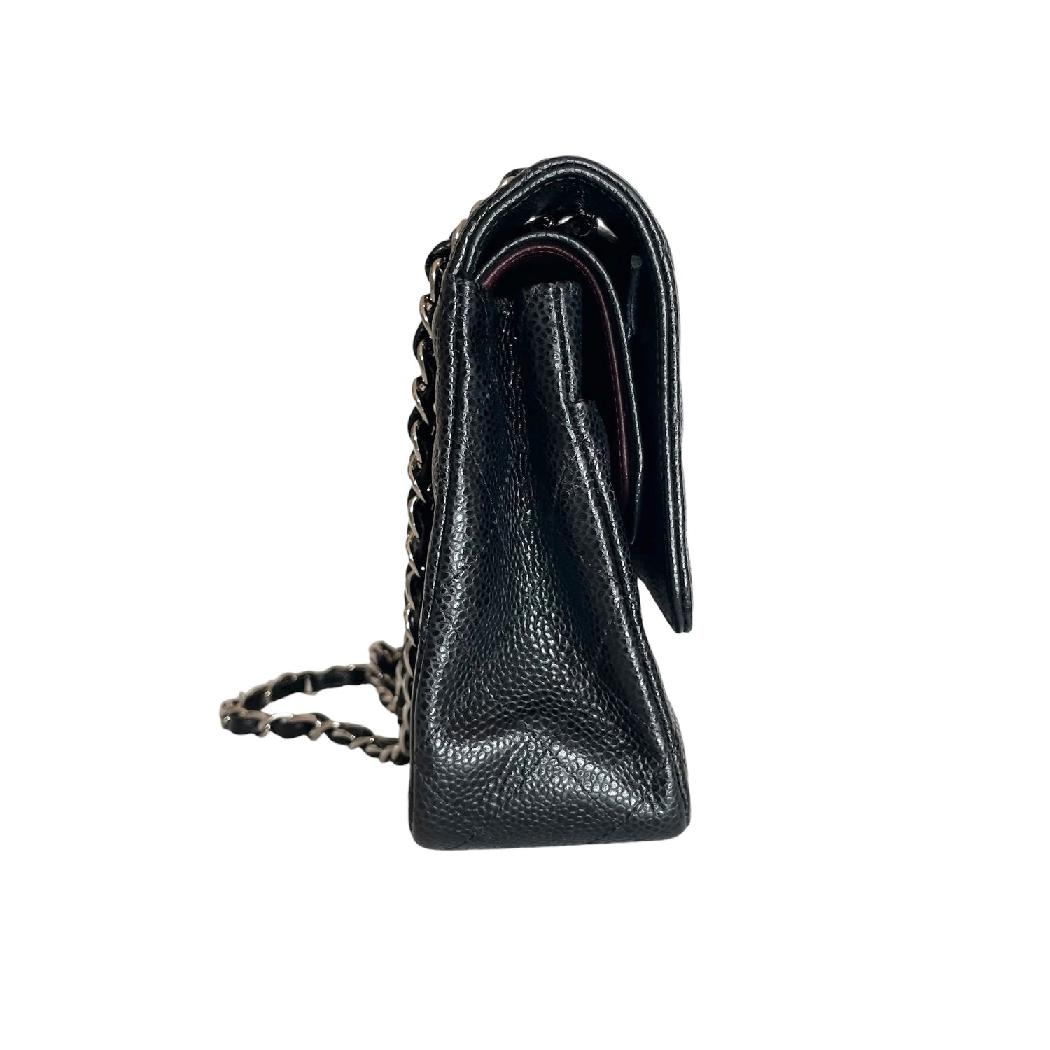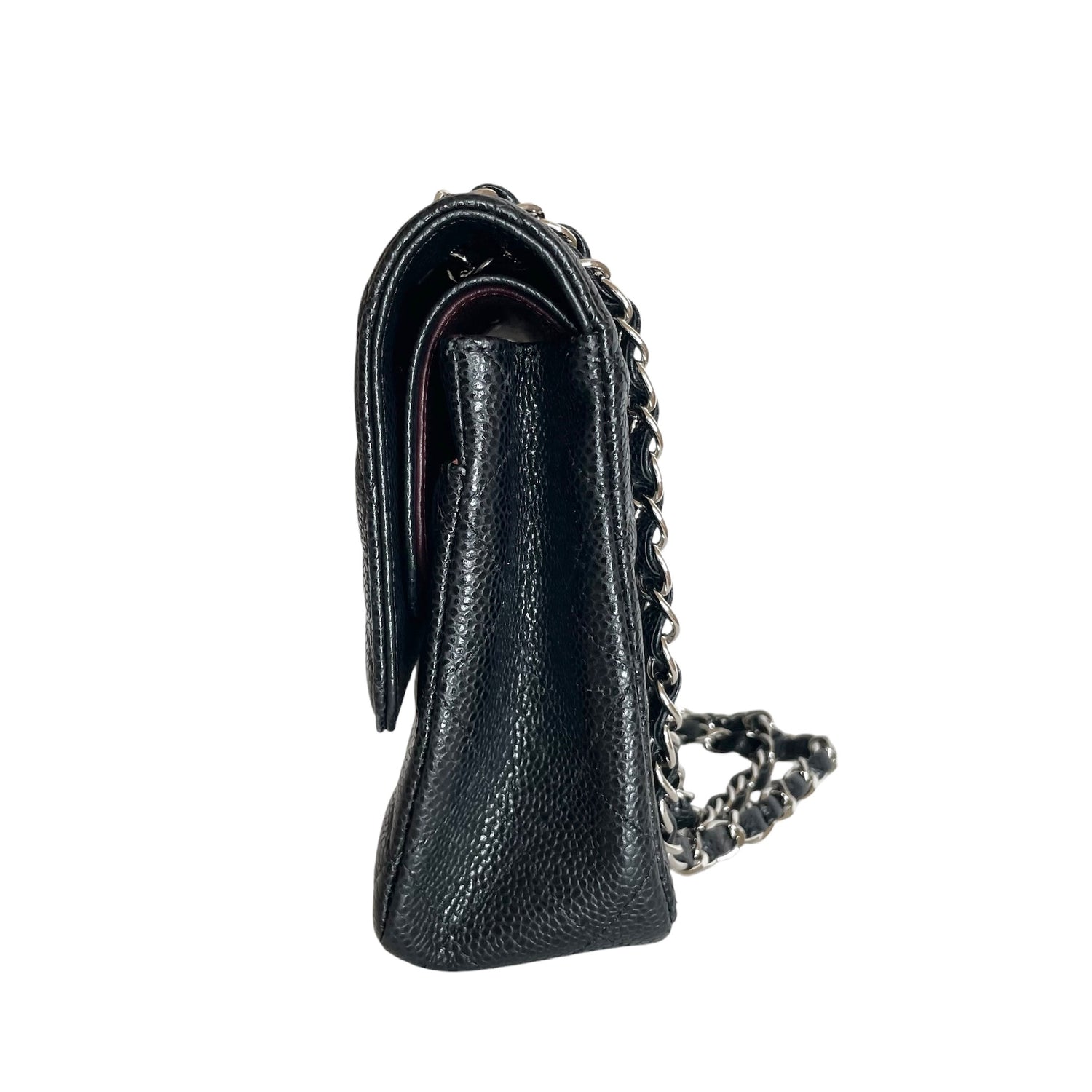 Chanel classic double flap bag. Black caviar leather. Double chain strap. Silver-tone hardware. Burgundy lambskin leather interior.