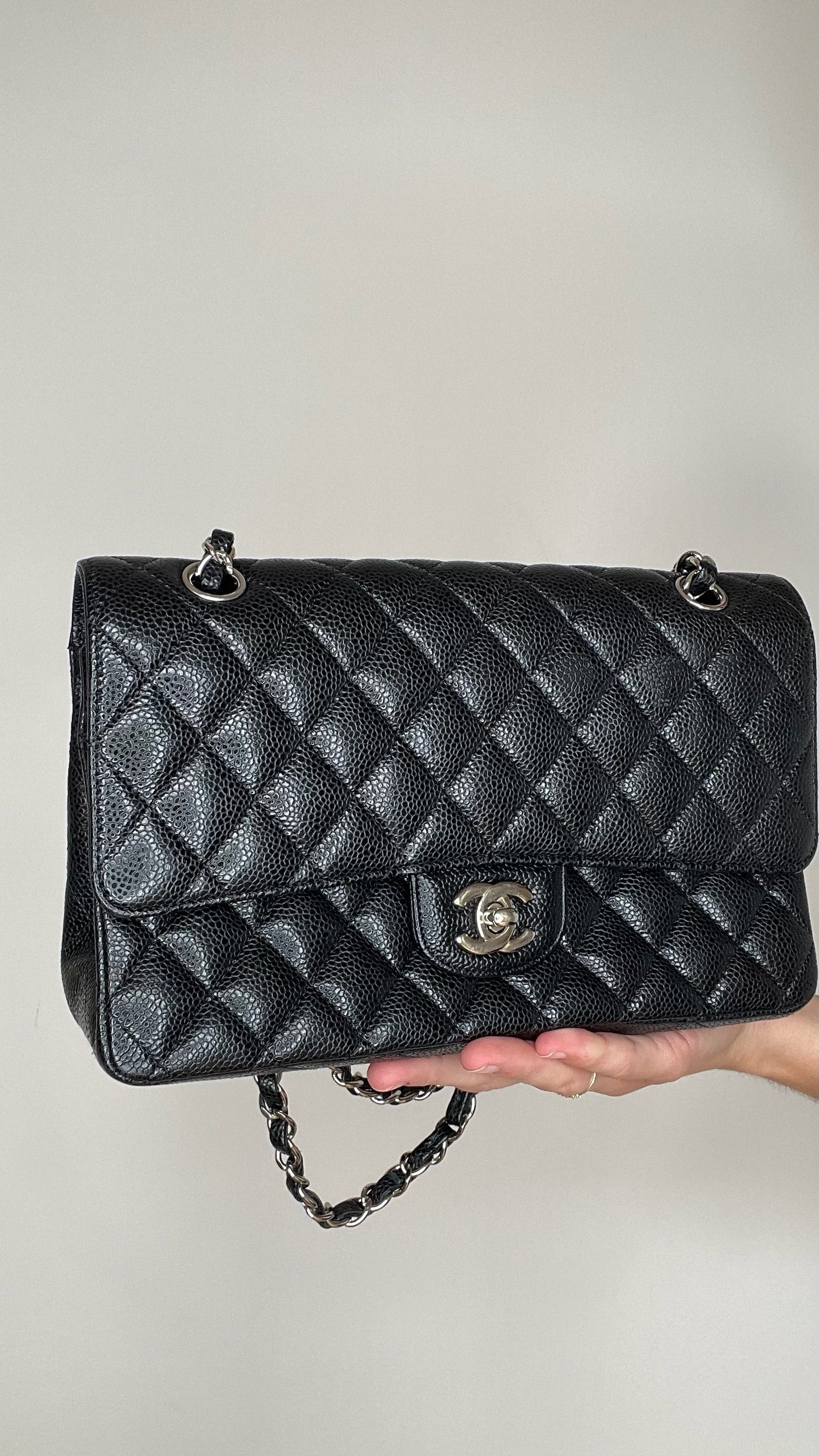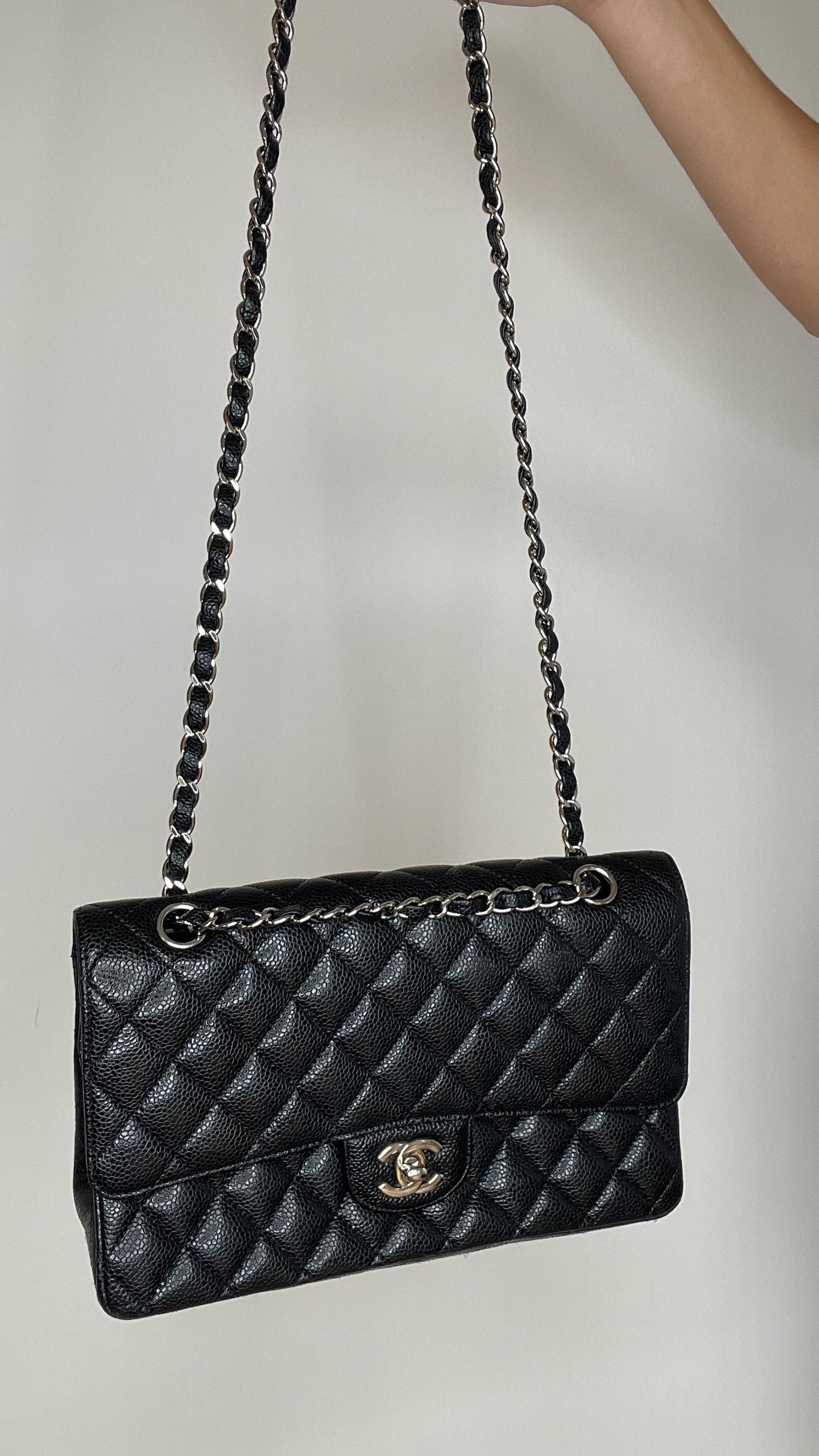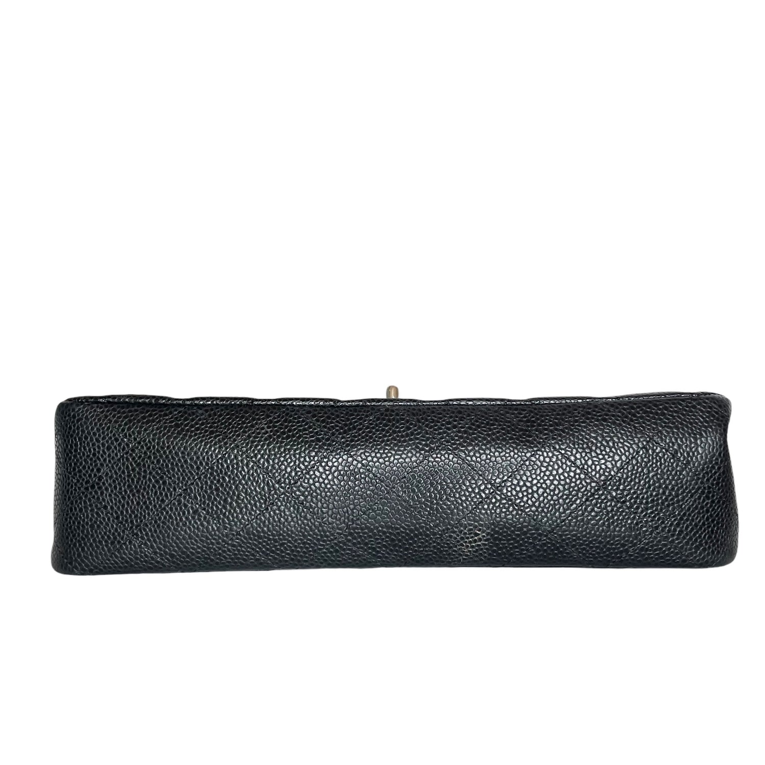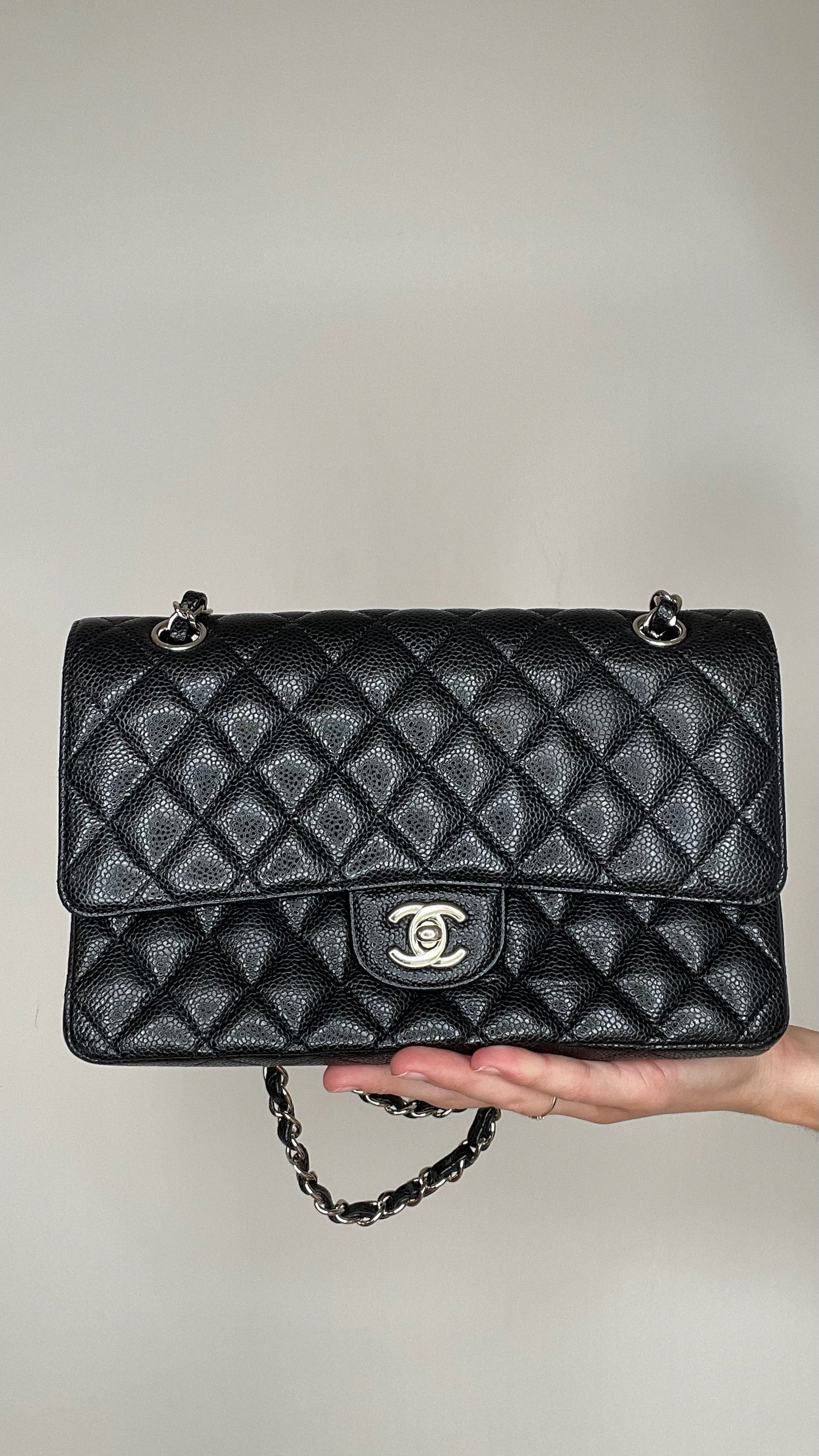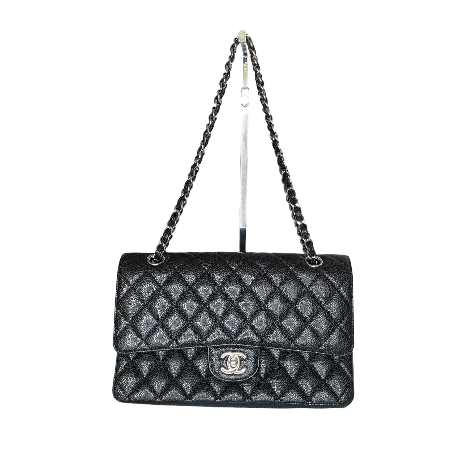 Chanel classic double flap bag. Black caviar leather. Double chain strap. Silver-tone hardware. Burgundy lambskin leather interior.