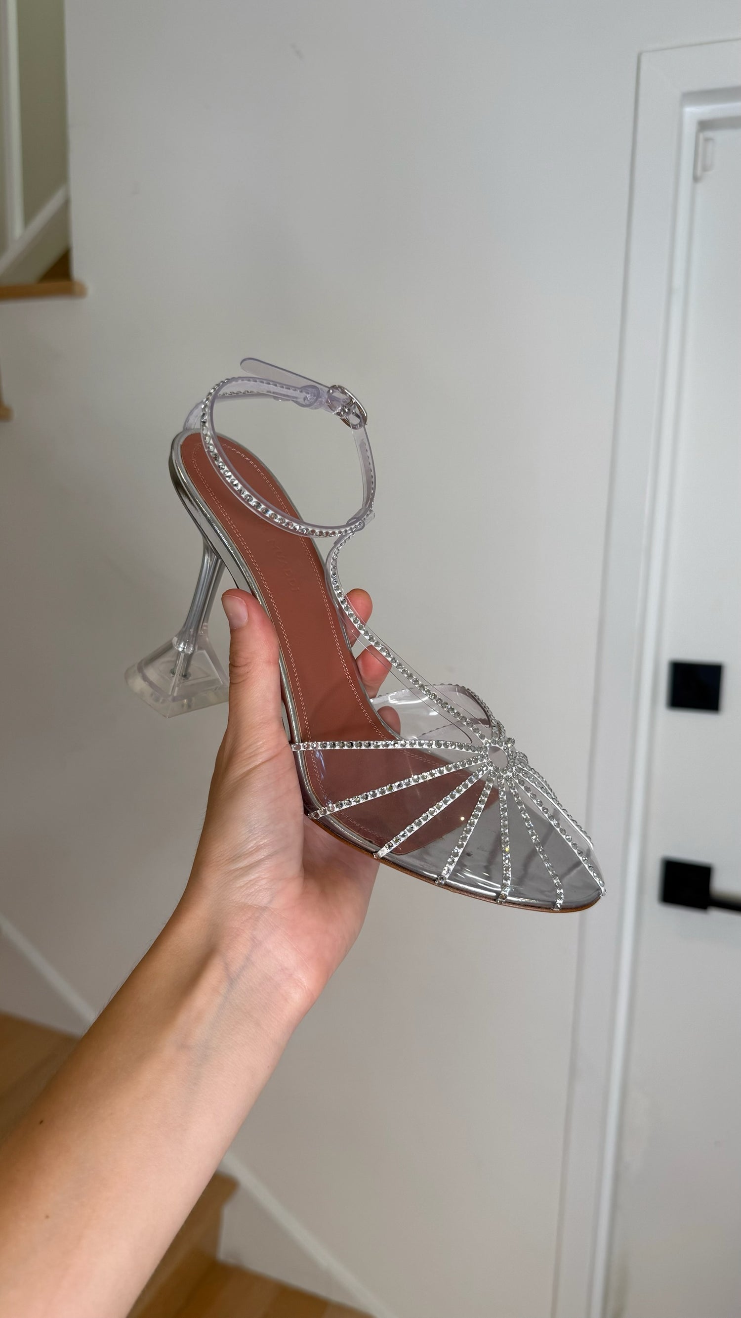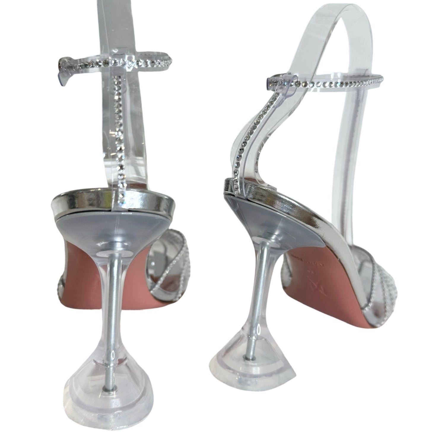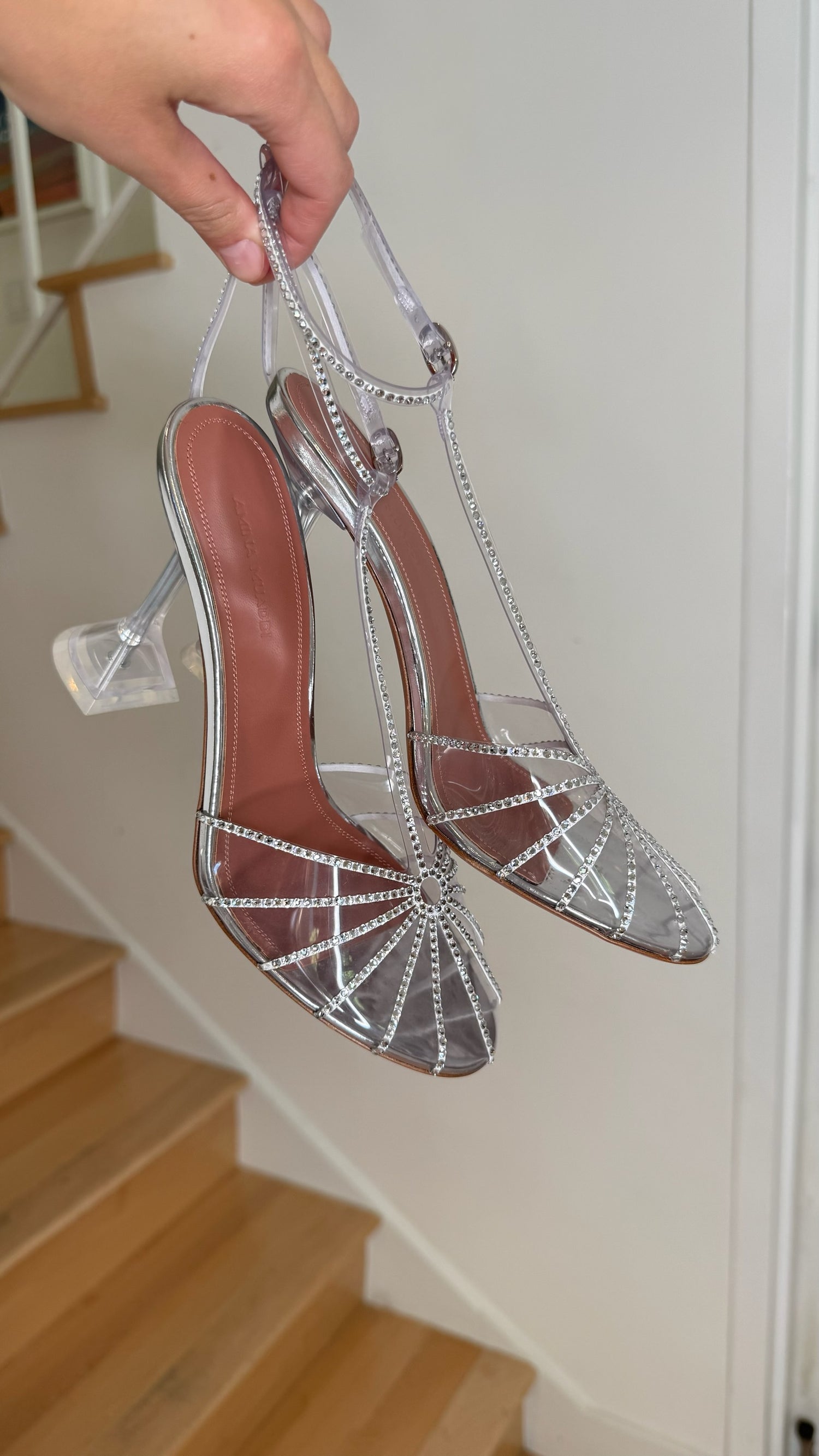 Amina Muaddi clear high heels. Crystal embellishments. Ankle strap closure. Round toe. Designer size 38.