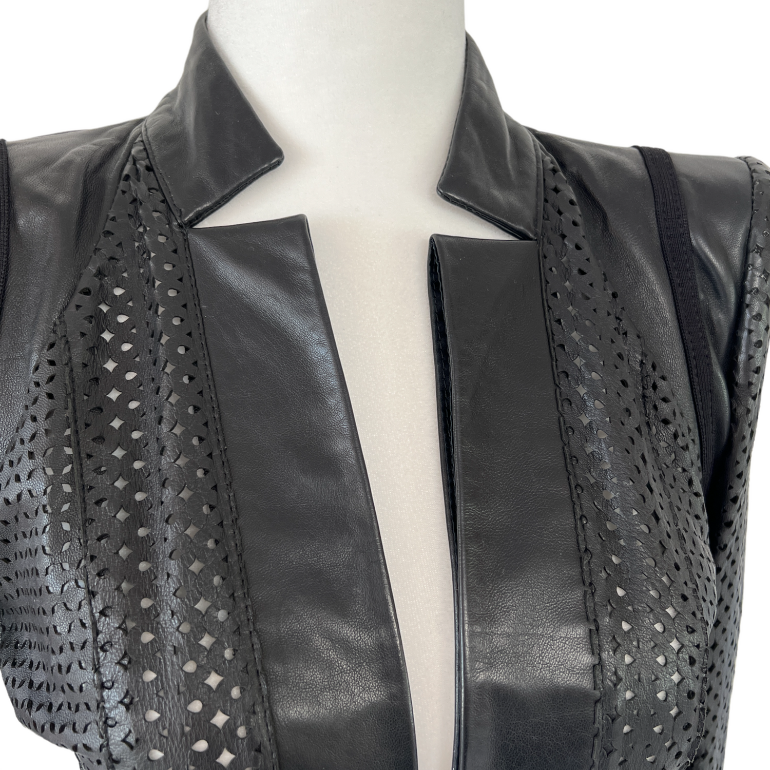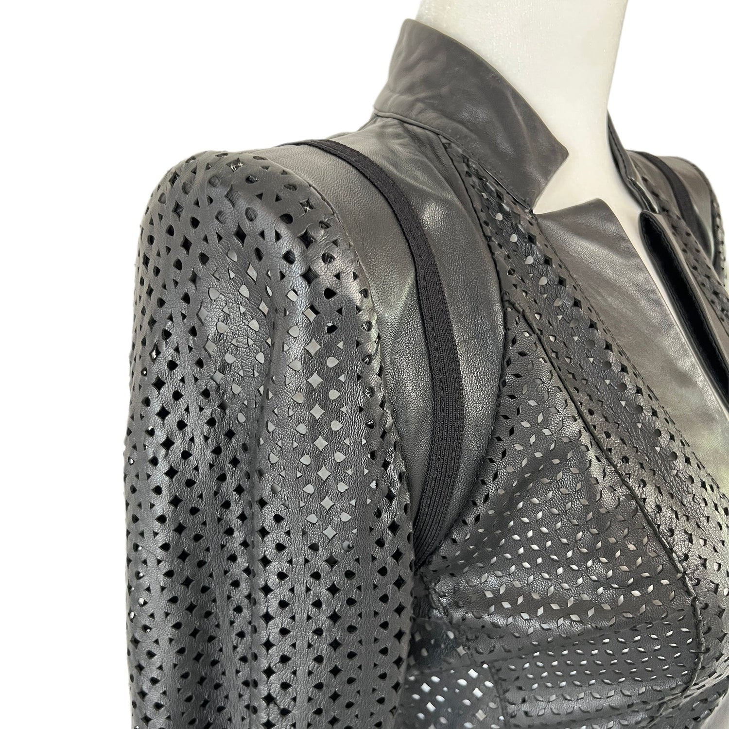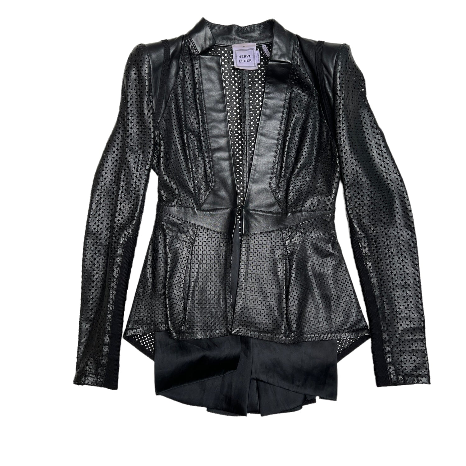 Herver Leger black leather jacket. Perforated leather details. Hook closure at front. Structured shoulders. From 2011 Collection and very rare.