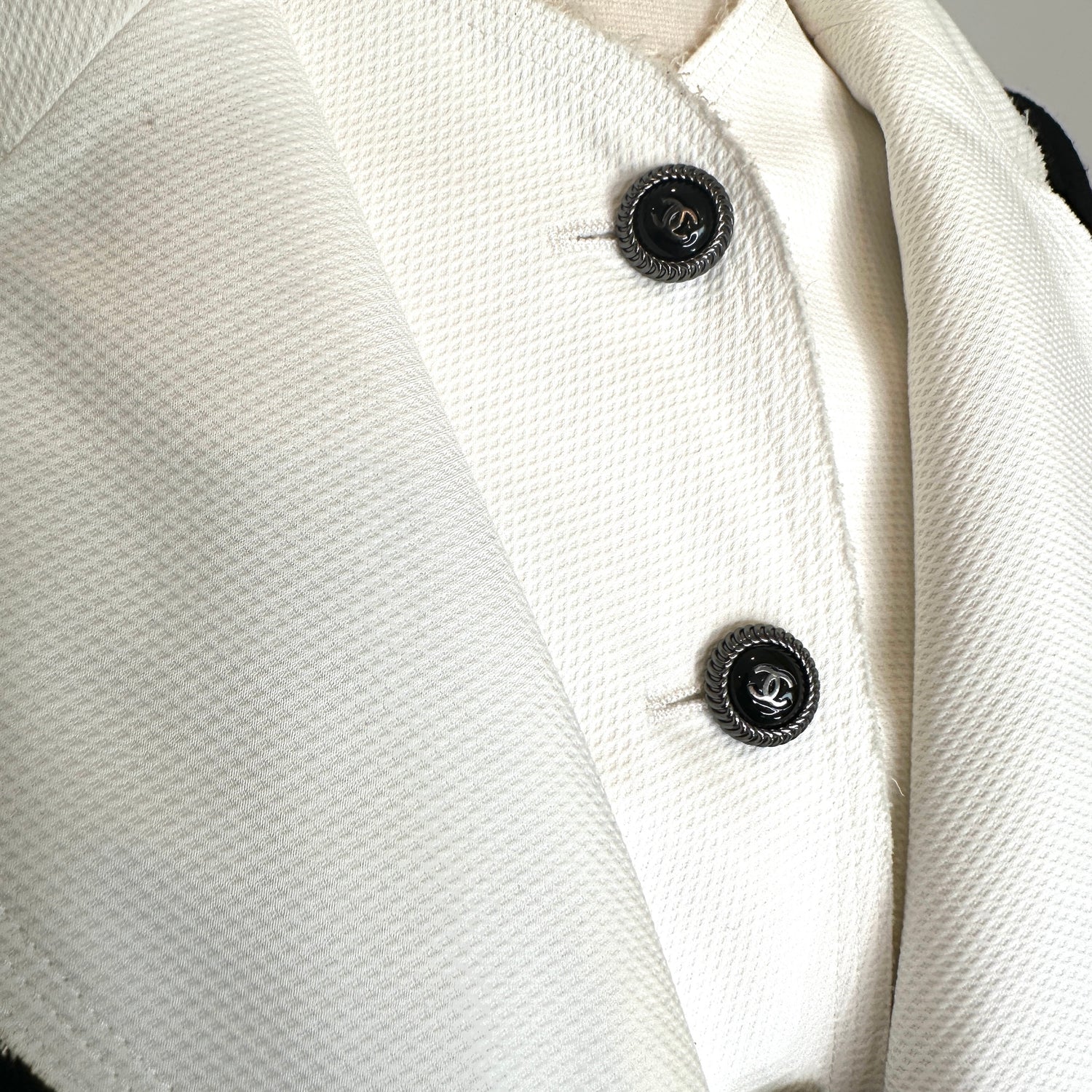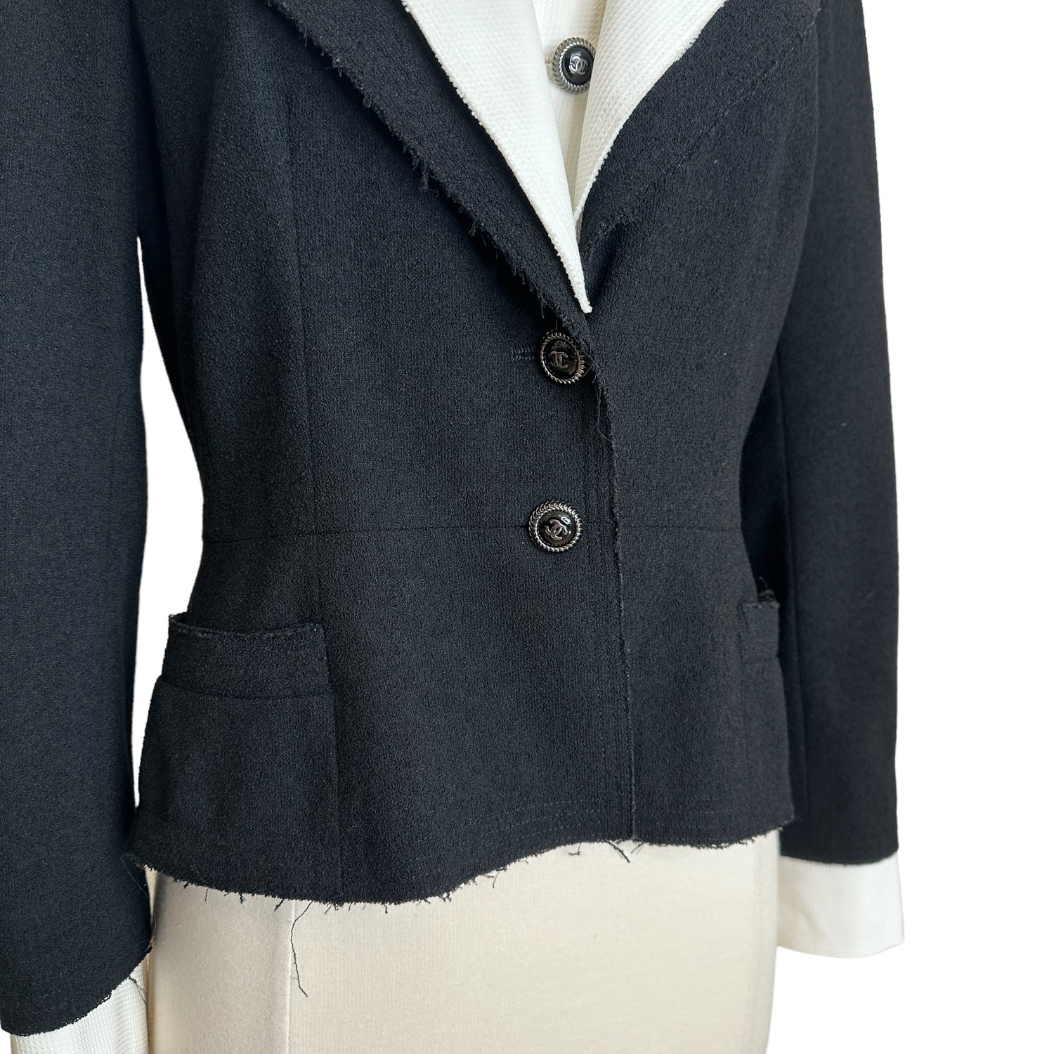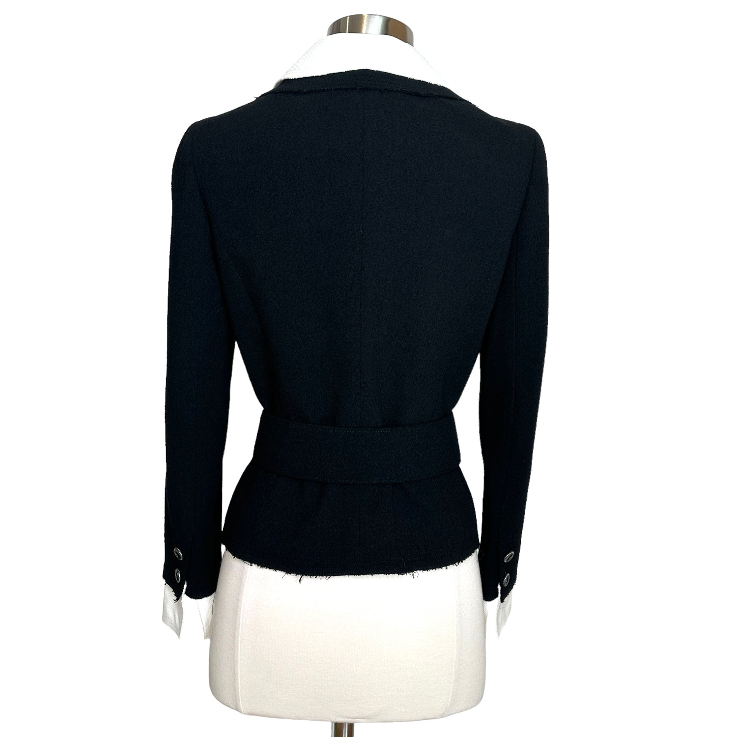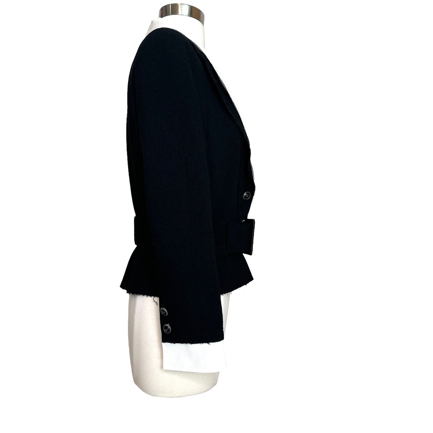 Chanel black and white blazer with belt. I like to call this one the "3 in 1" blazer. With this piece, you are really getting multiple looks and use. The white panels with buttons are removable. The white rounded collar is removable separately. Beautiful CC logo buttons. Raw hem. Waffled white panels. Removable and adjustable belt. Silk lining with camelia print. Designer size 38.