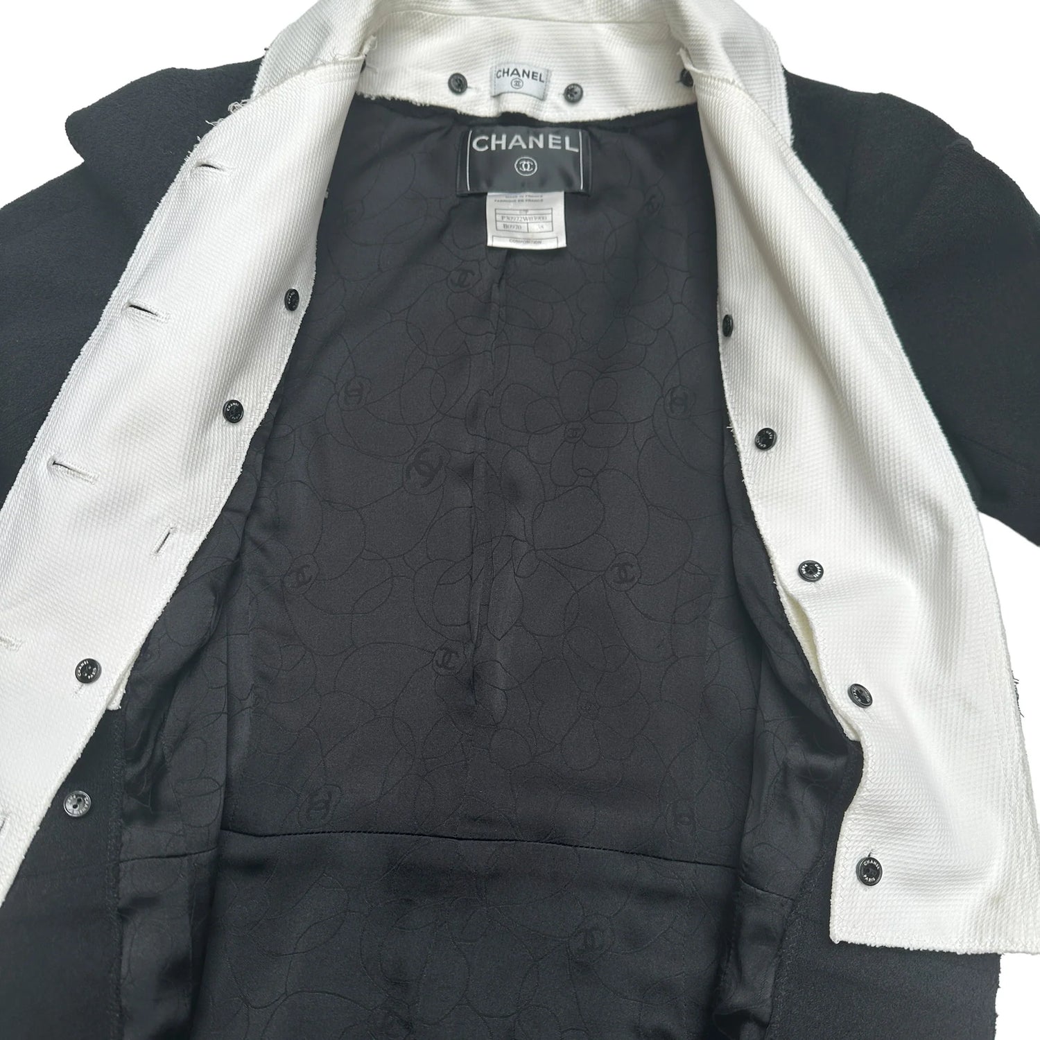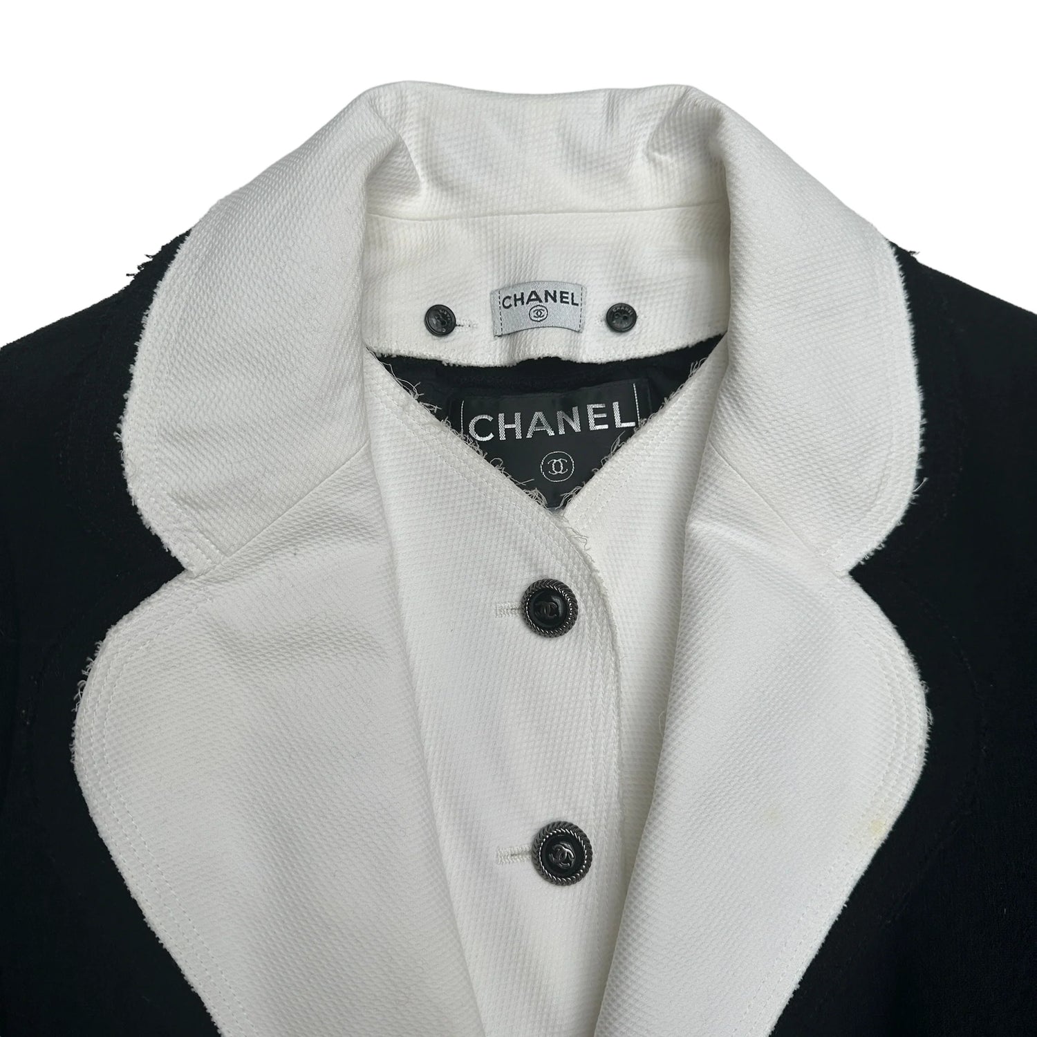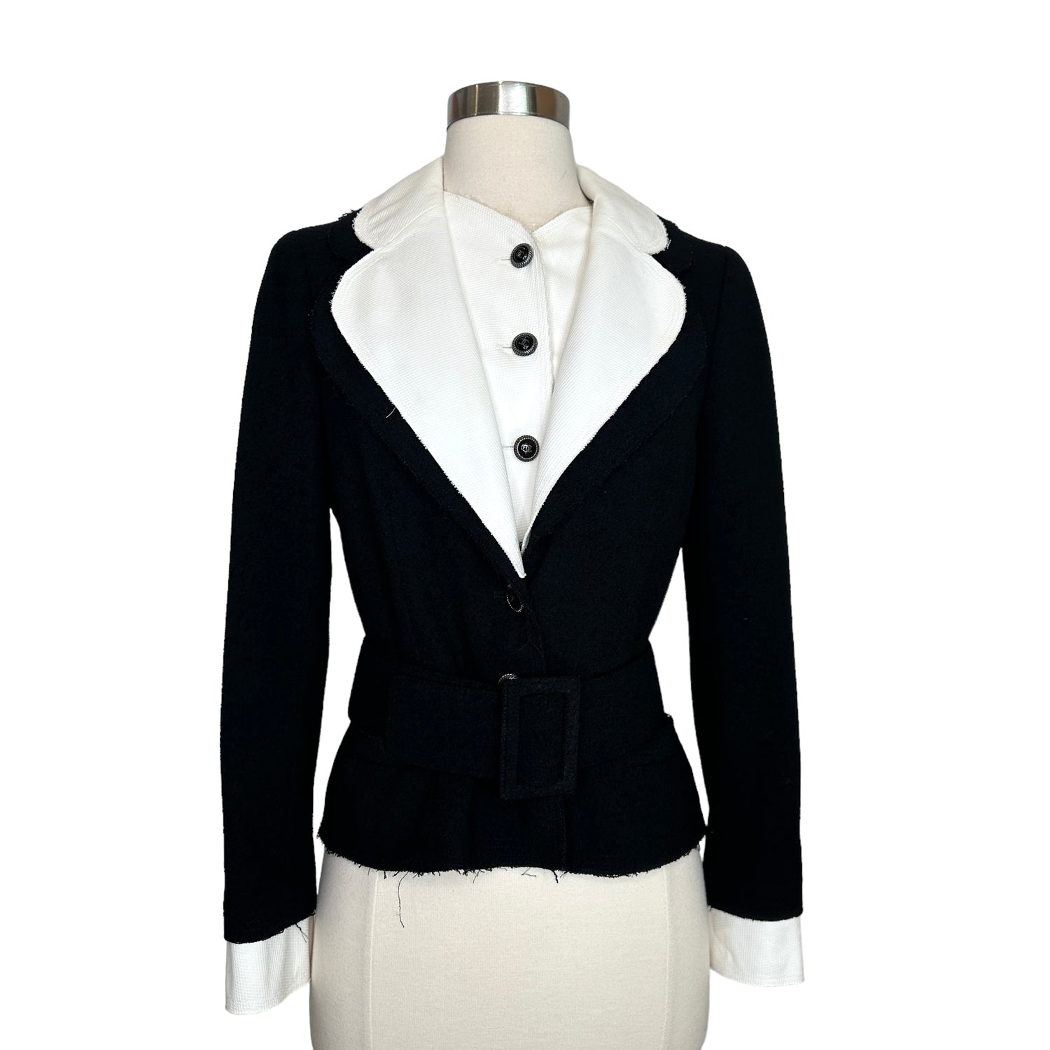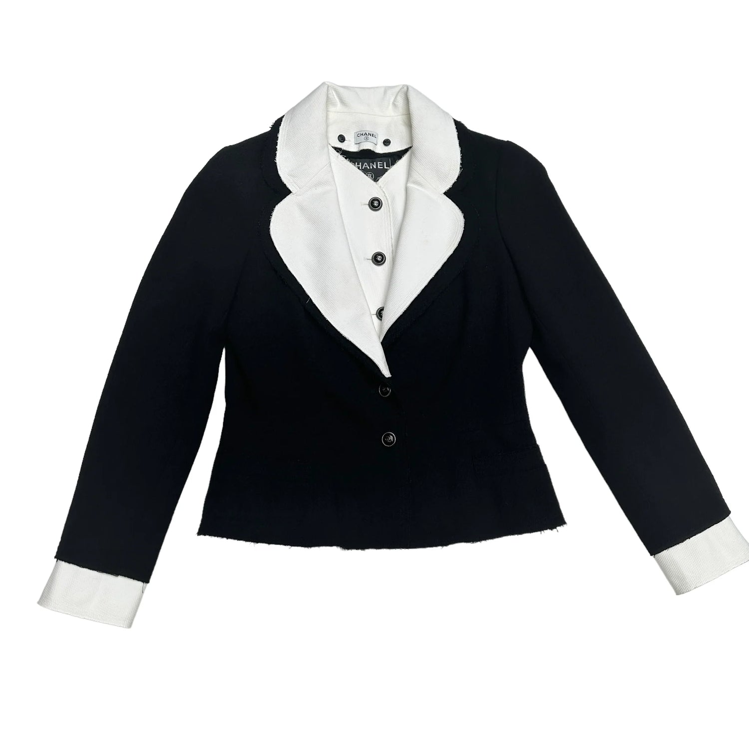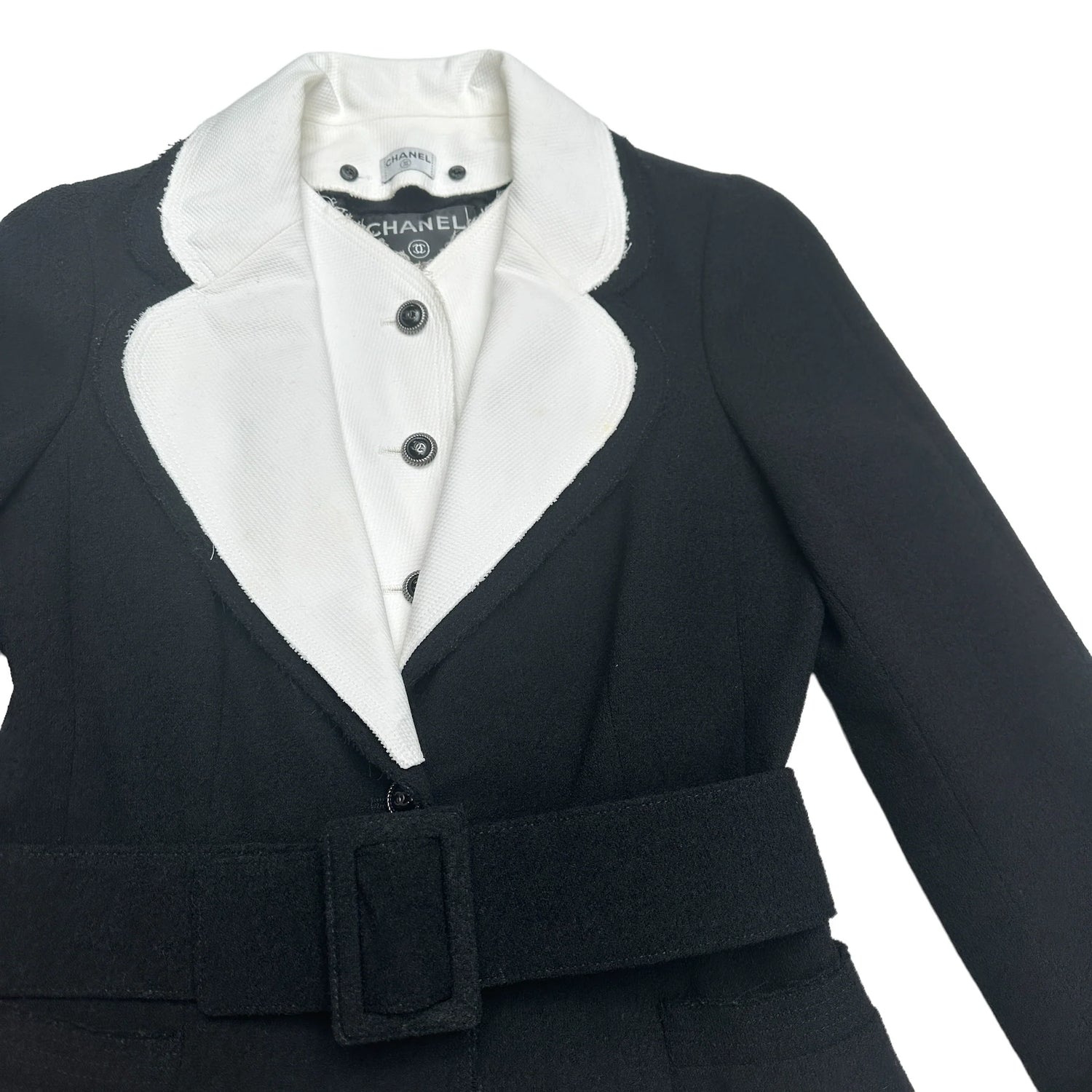 Chanel black and white blazer with belt. I like to call this one the "3 in 1" blazer. With this piece, you are really getting multiple looks and use. The white panels with buttons are removable. The white rounded collar is removable separately. Beautiful CC logo buttons. Raw hem. Waffled white panels. Removable and adjustable belt. Silk lining with camelia print. Designer size 38.