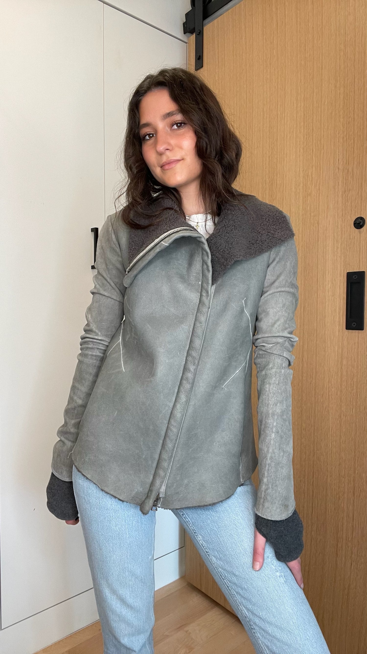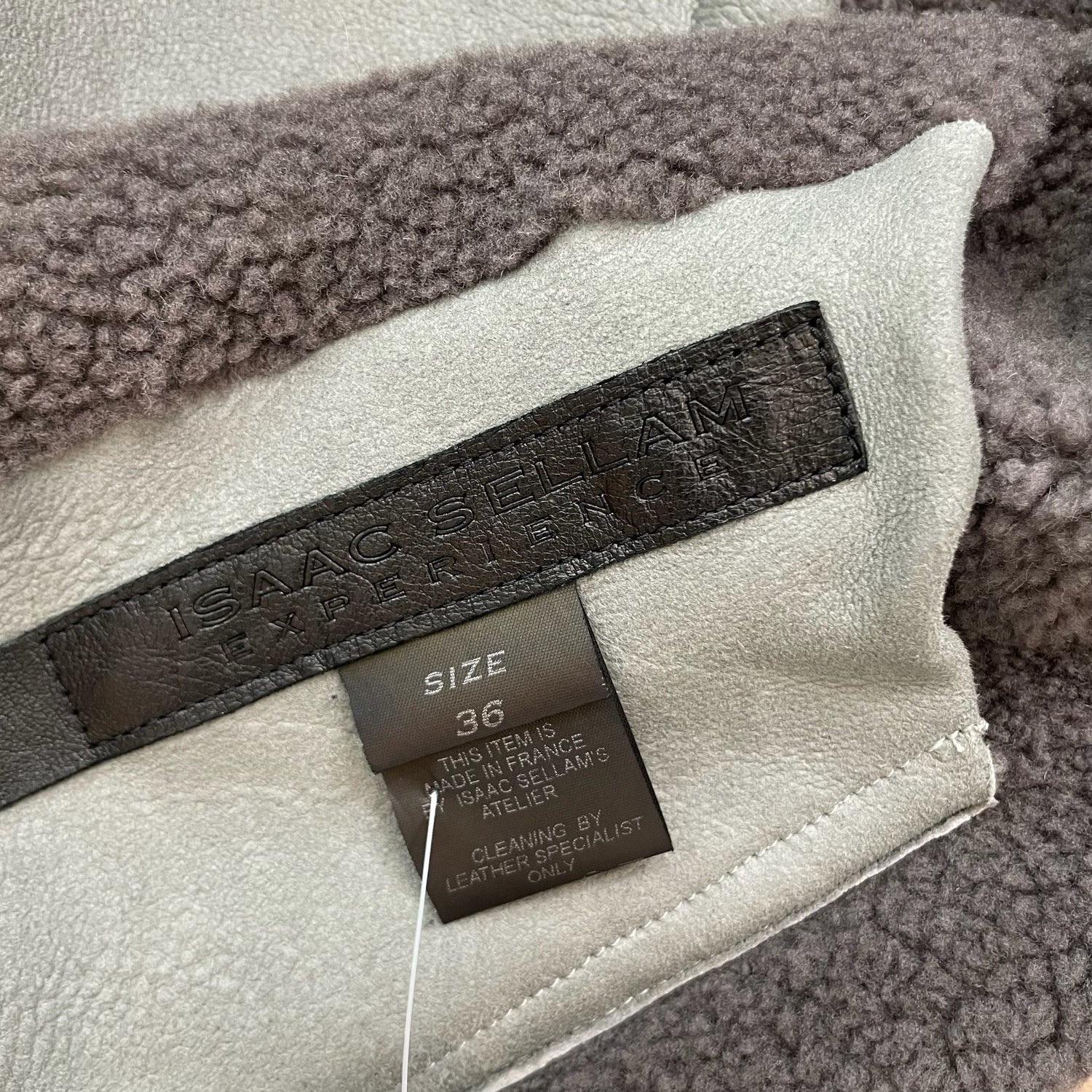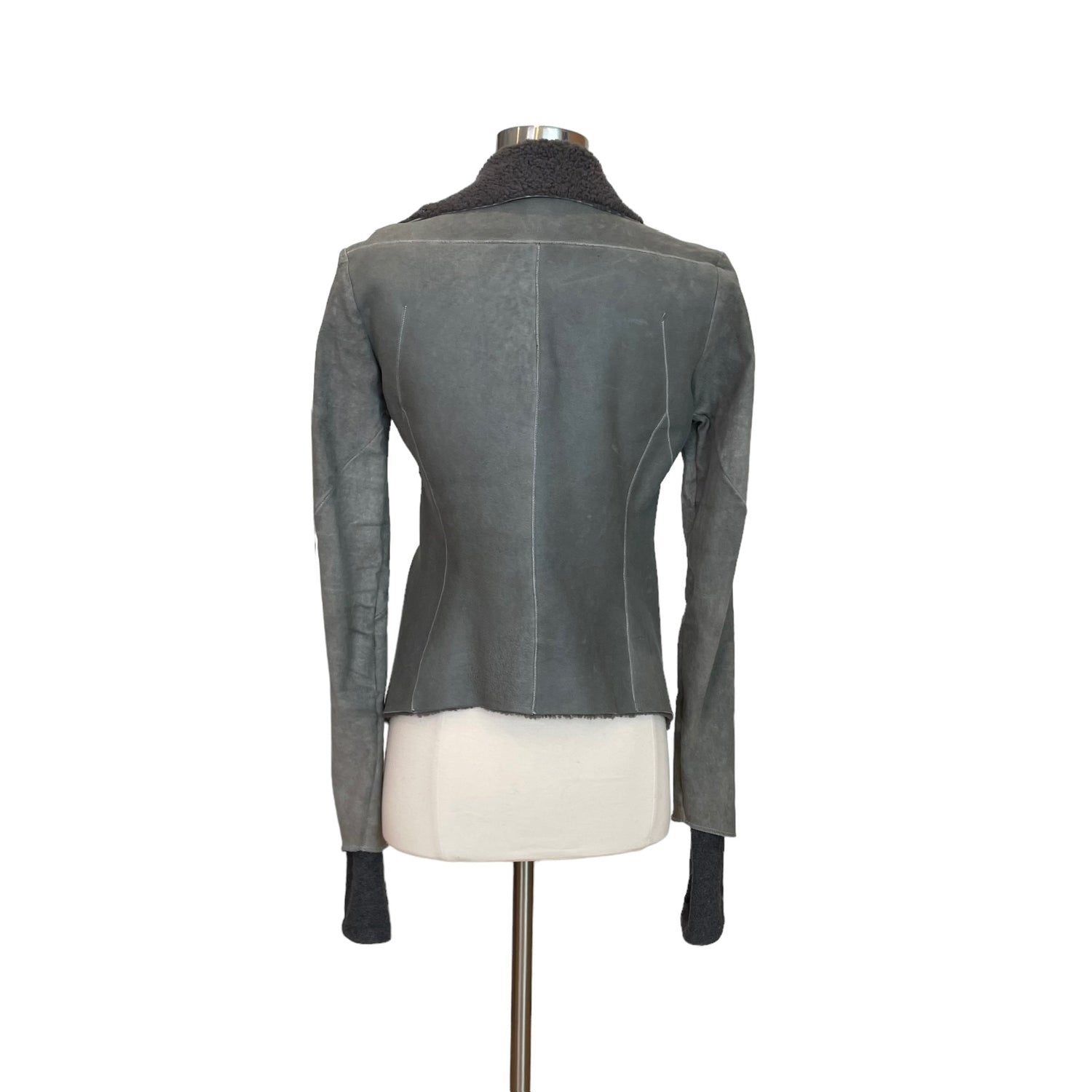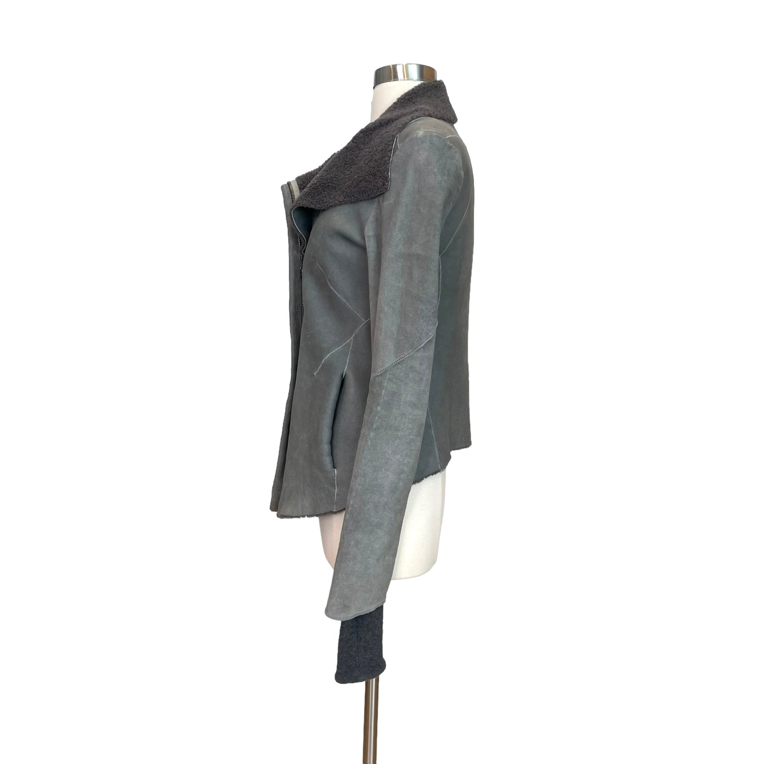 Isaac Sellam grey suede and shearling jacket. Long lined sleeves. Zipper closure at front. Slit pockets. Designer size 36