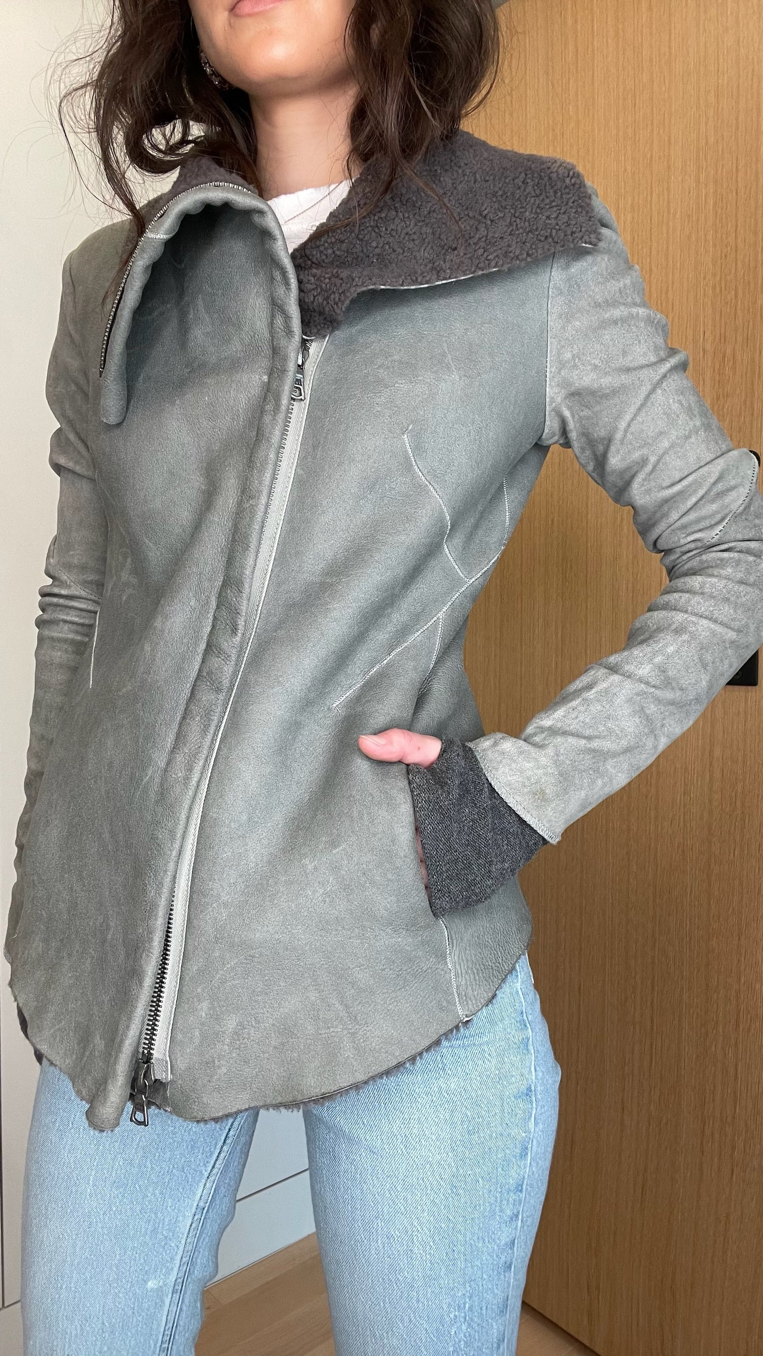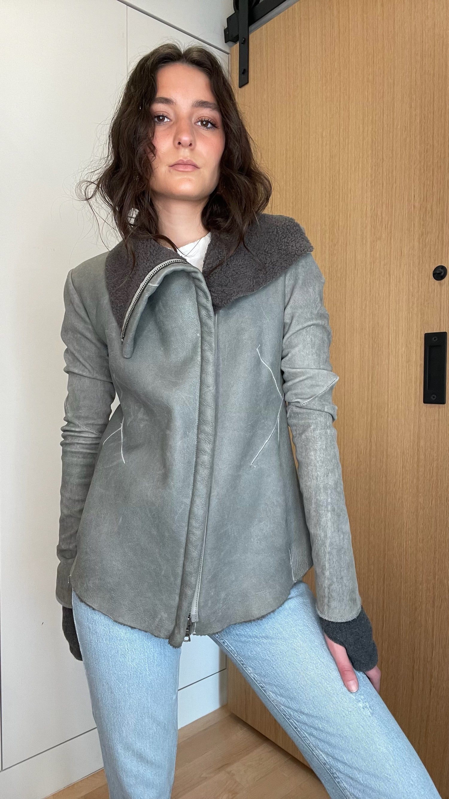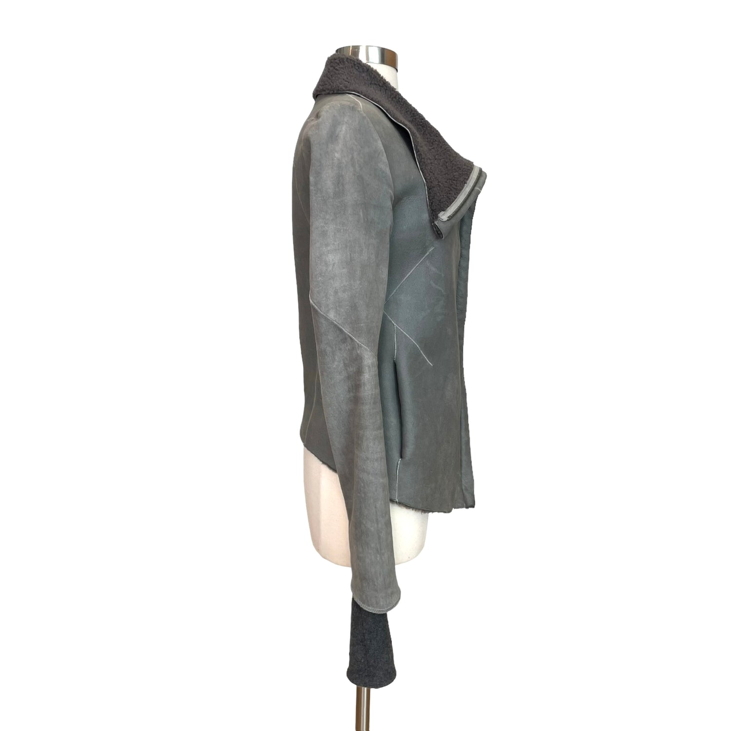 Isaac Sellam grey suede and shearling jacket. Long lined sleeves. Zipper closure at front. Slit pockets. Designer size 36