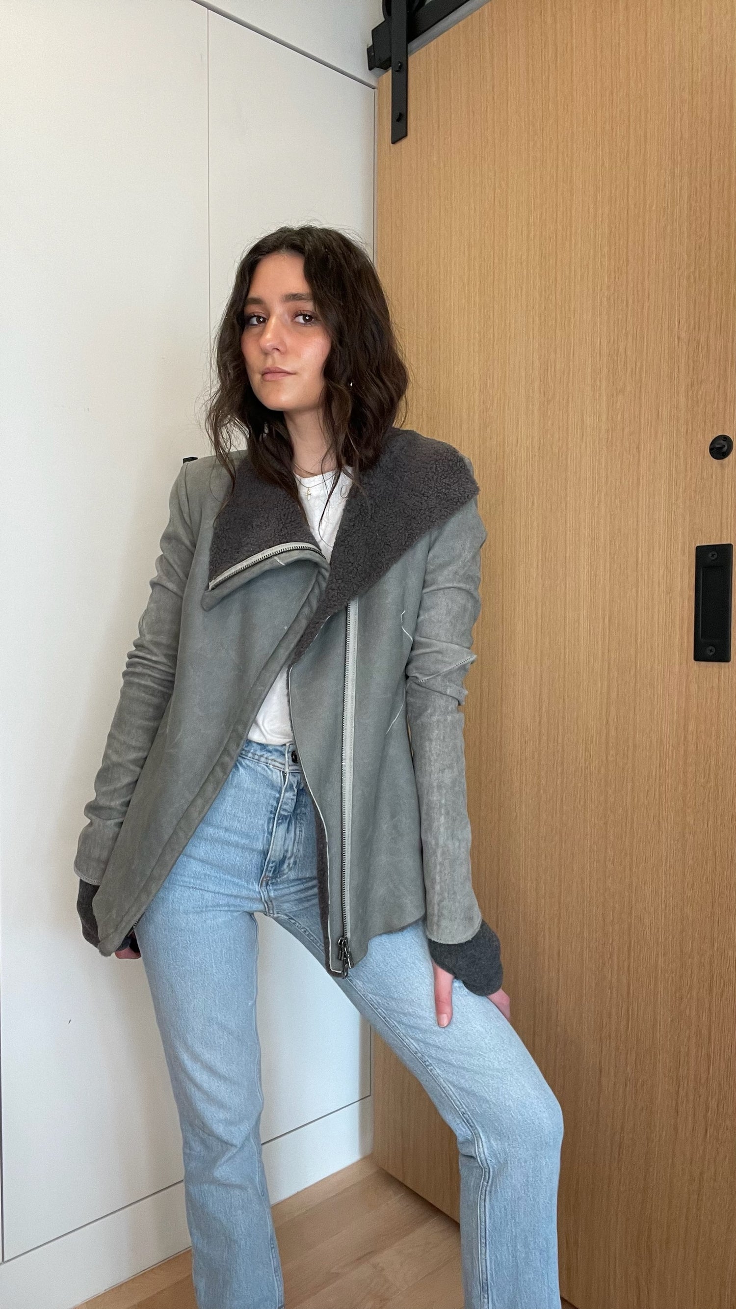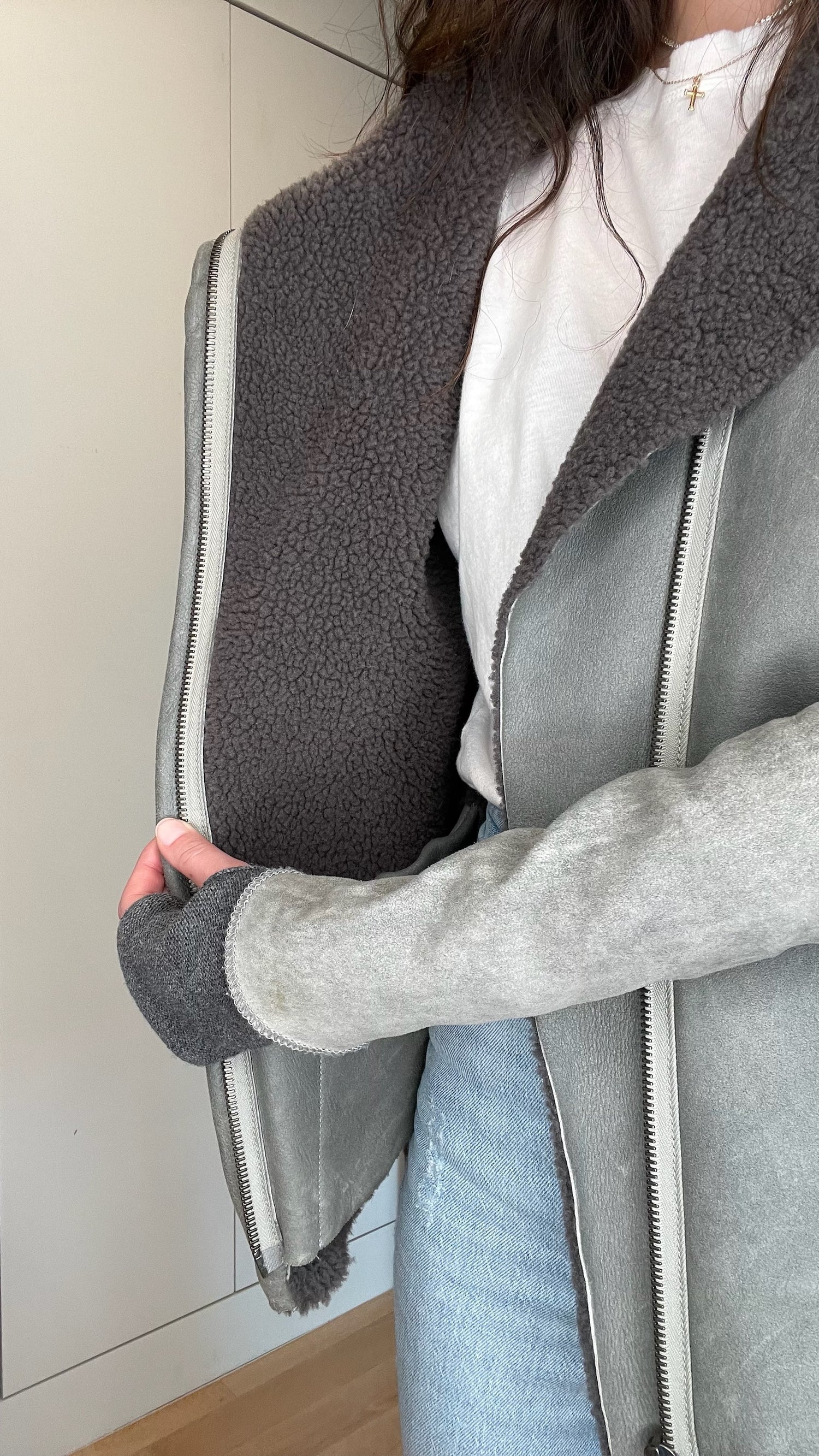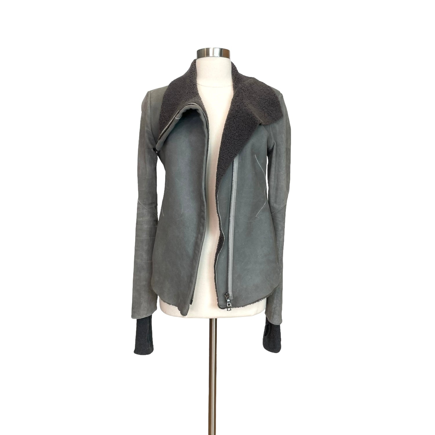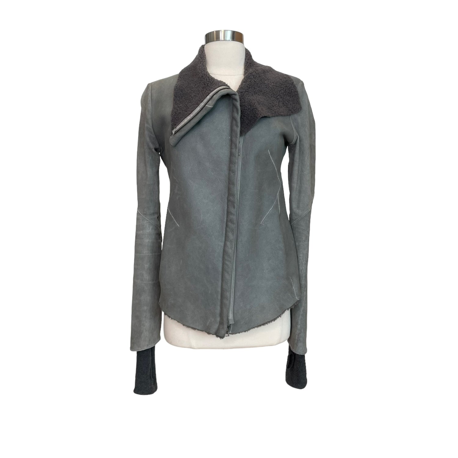 Isaac Sellam grey suede and shearling jacket. Long lined sleeves. Zipper closure at front. Slit pockets. Designer size 36