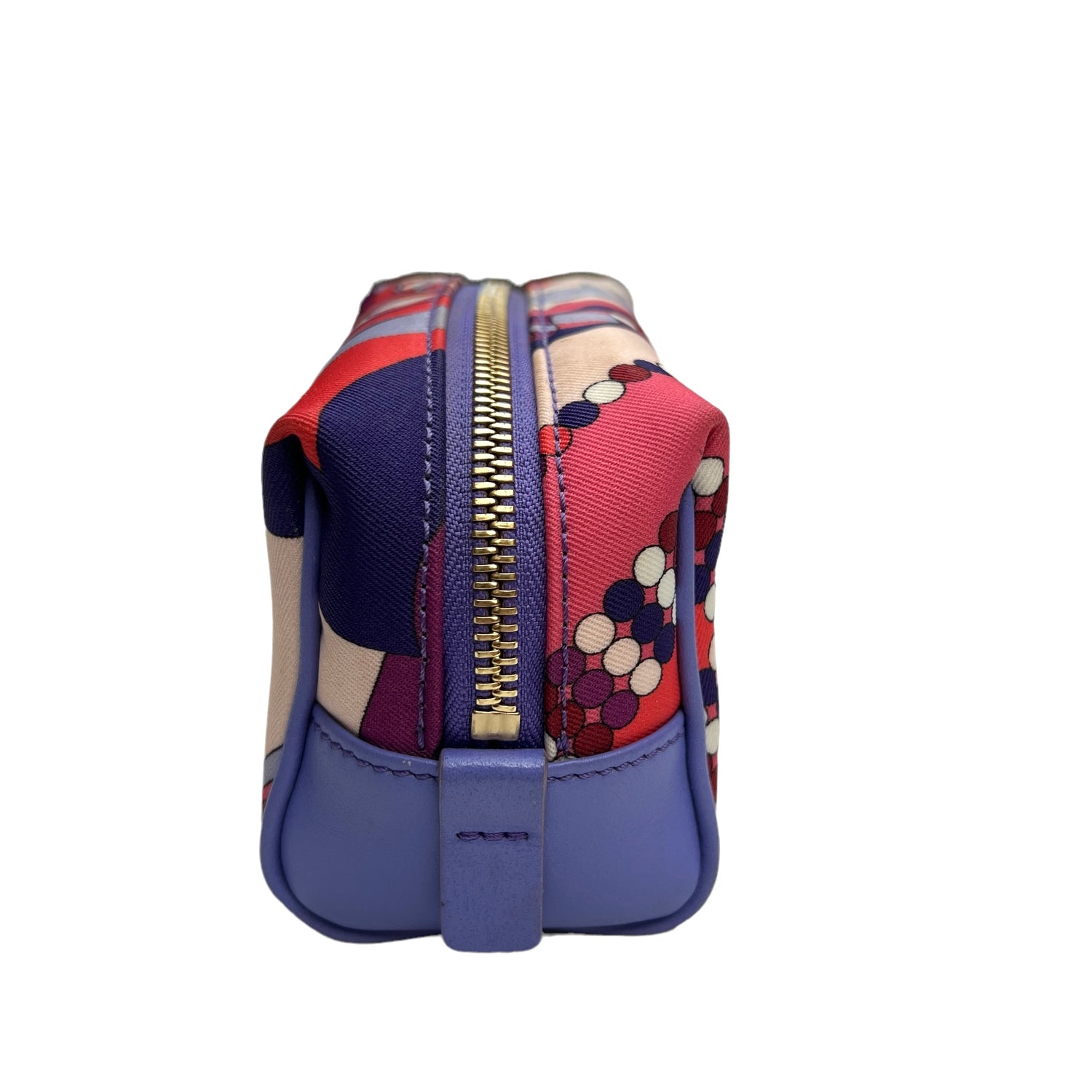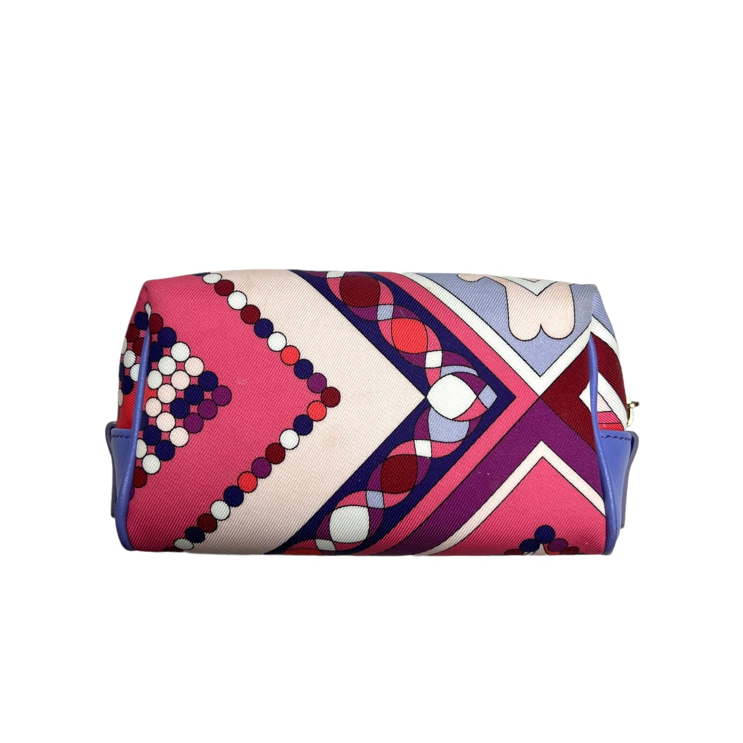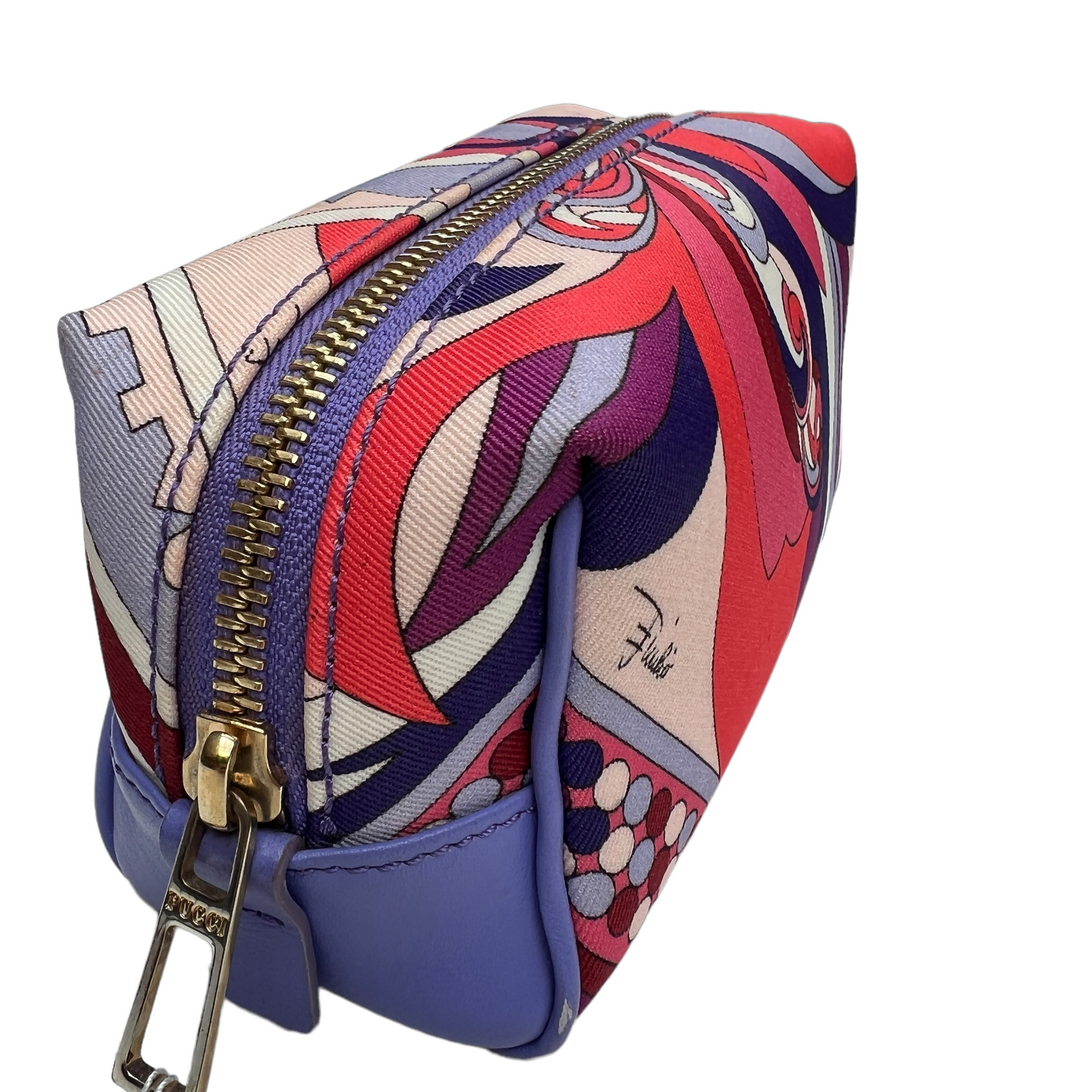 Emilio Pucci purple and pink cosmetic bag. Gold-tone zipper. One slit pocket inside. Leather corners.