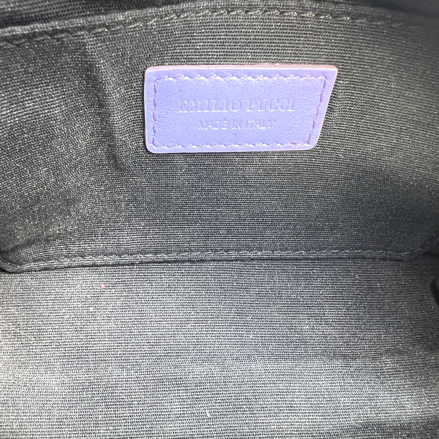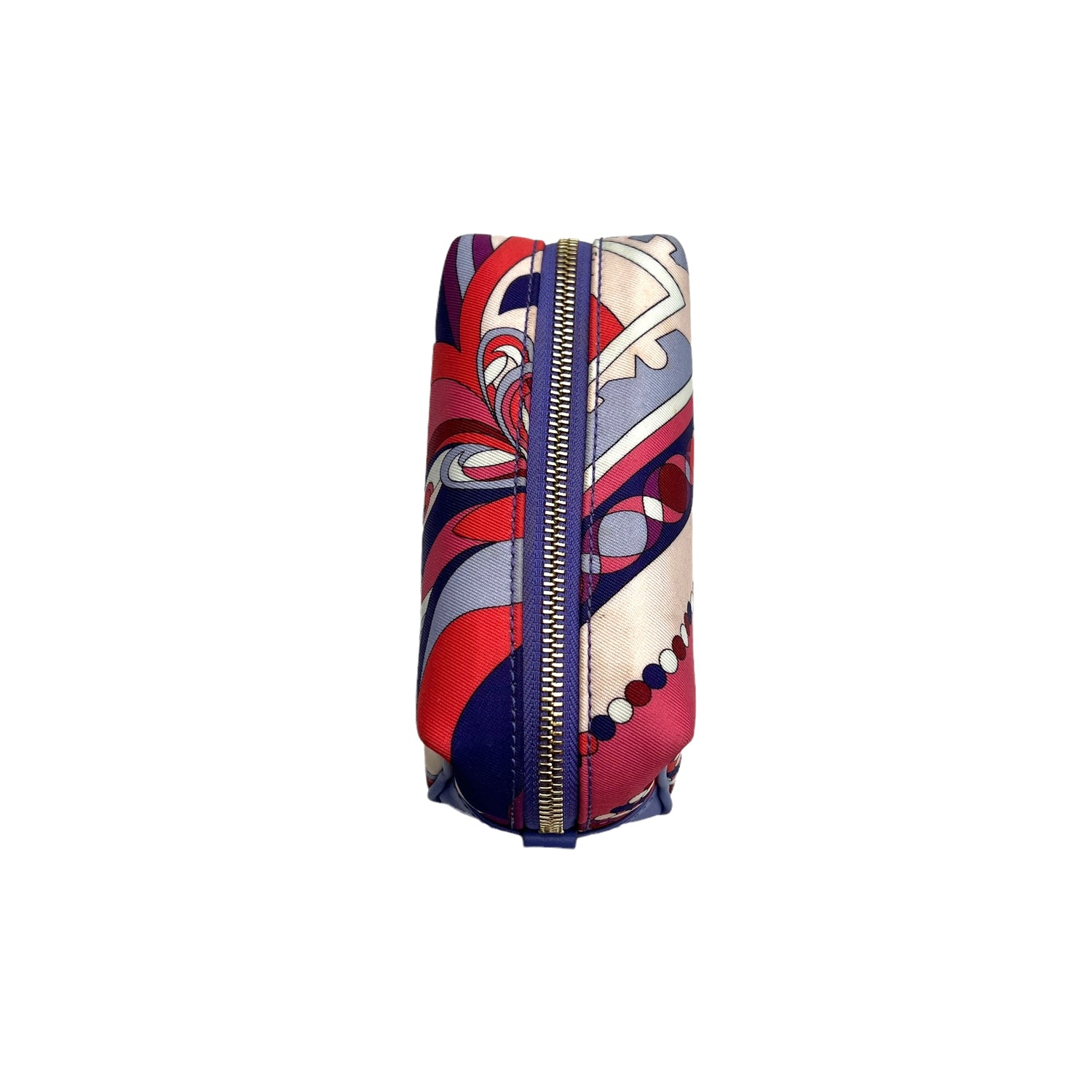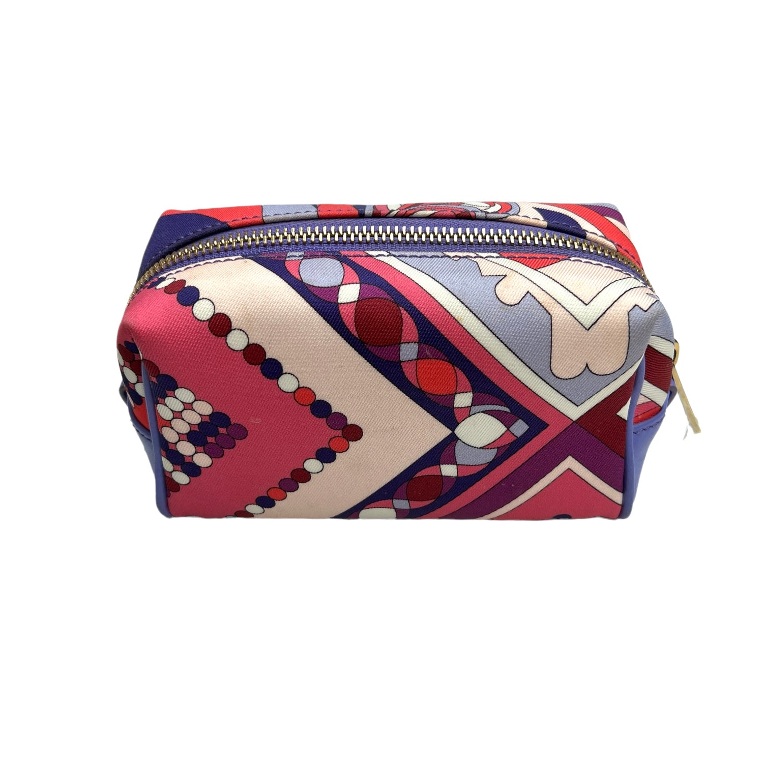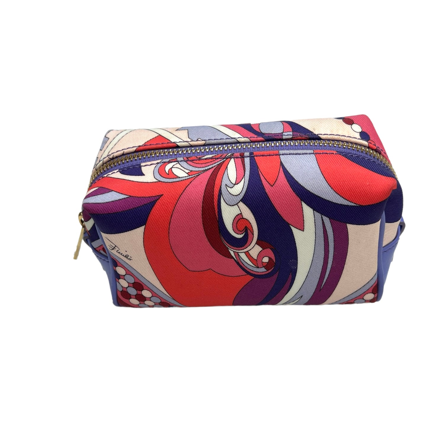 Emilio Pucci purple and pink cosmetic bag. Gold-tone zipper. One slit pocket inside. Leather corners.