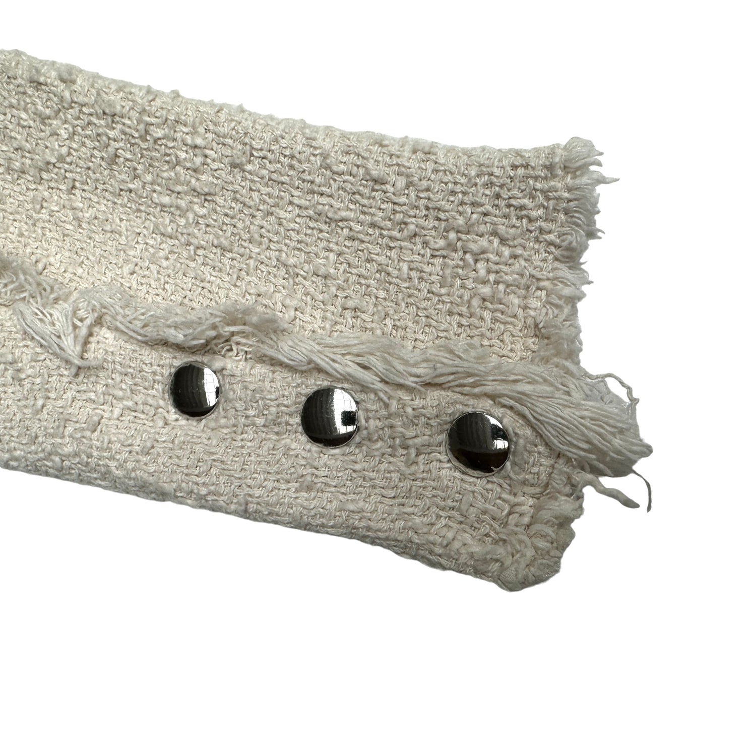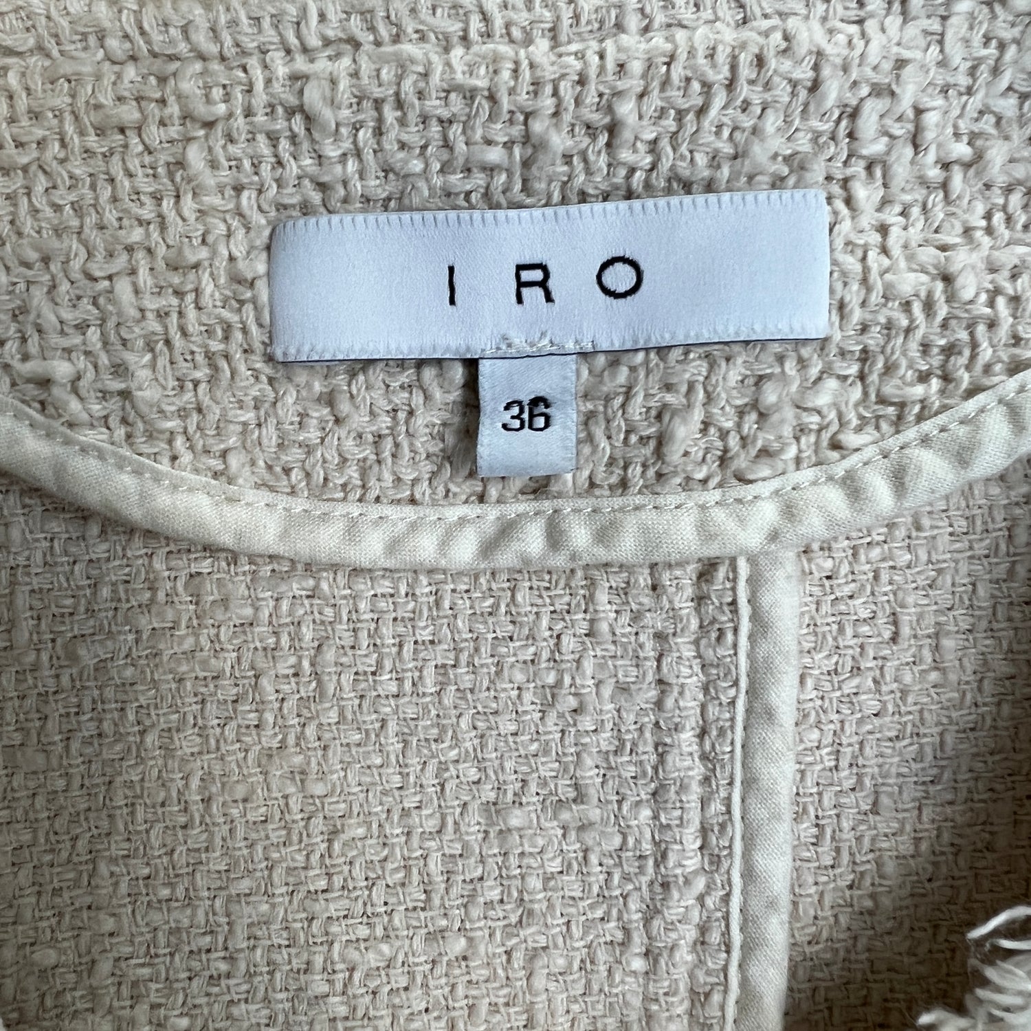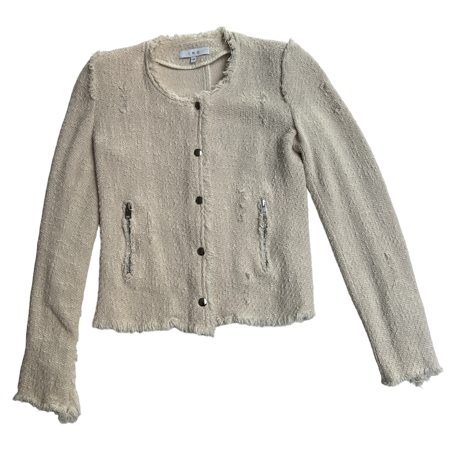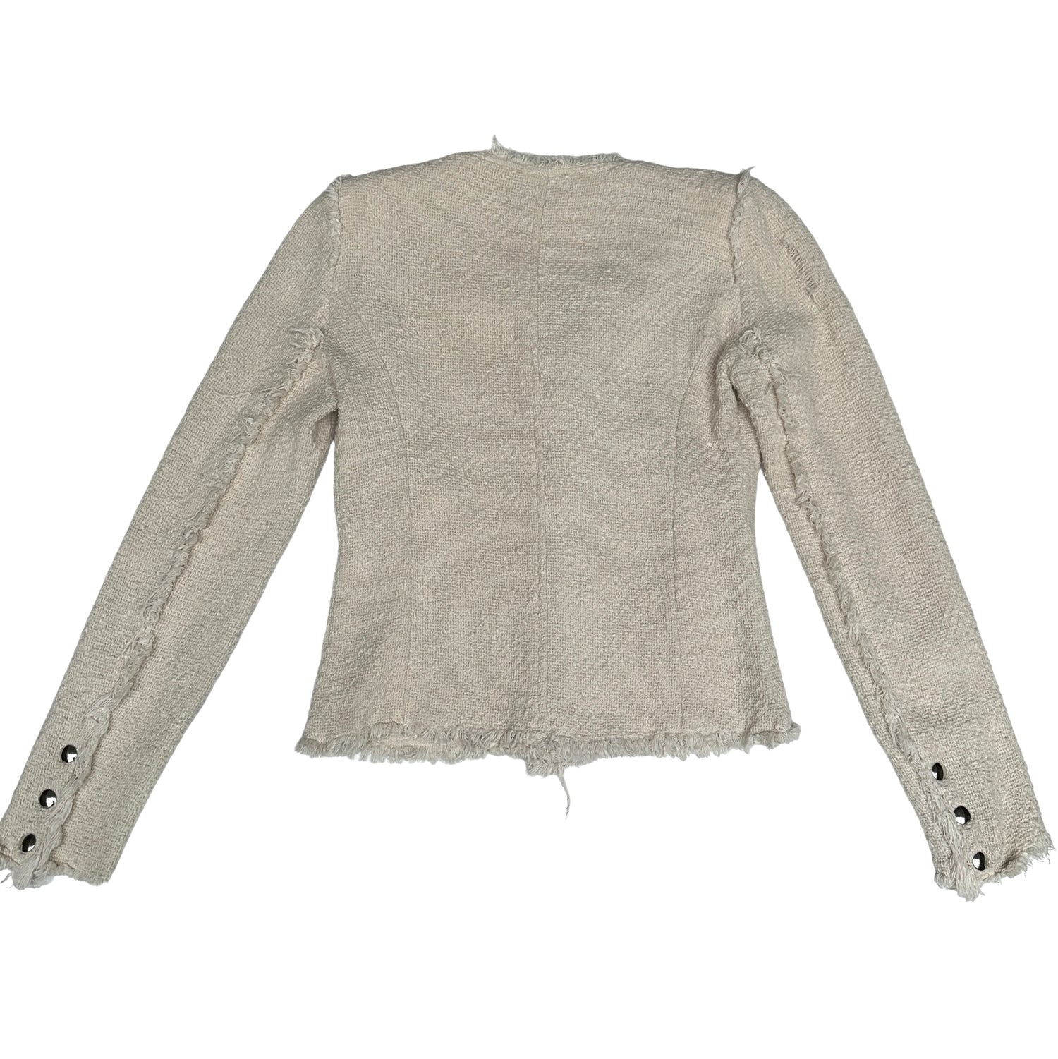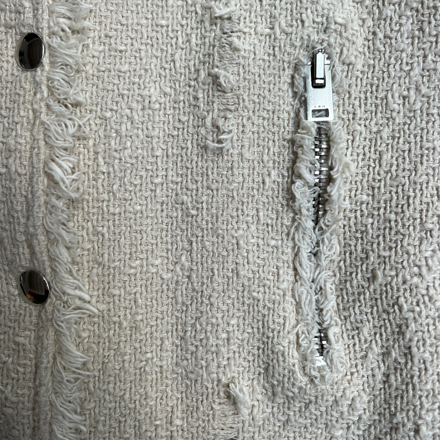 IRO cream cotton jacket. Tweed like woven fabric: Distressed details. Silver-tone hardware. Buttons at front. Zipper pockets. Round collar. Designer size 36.