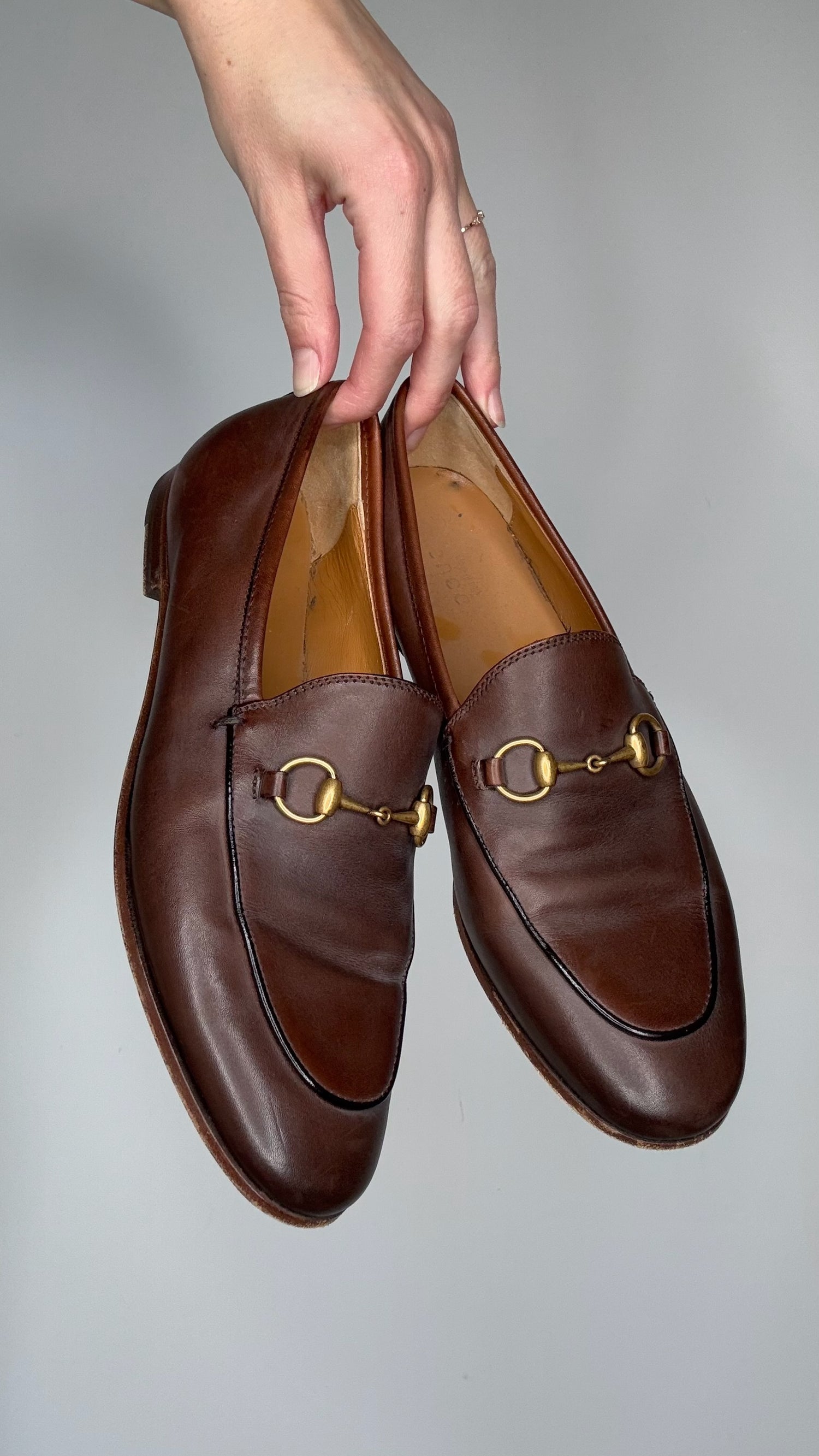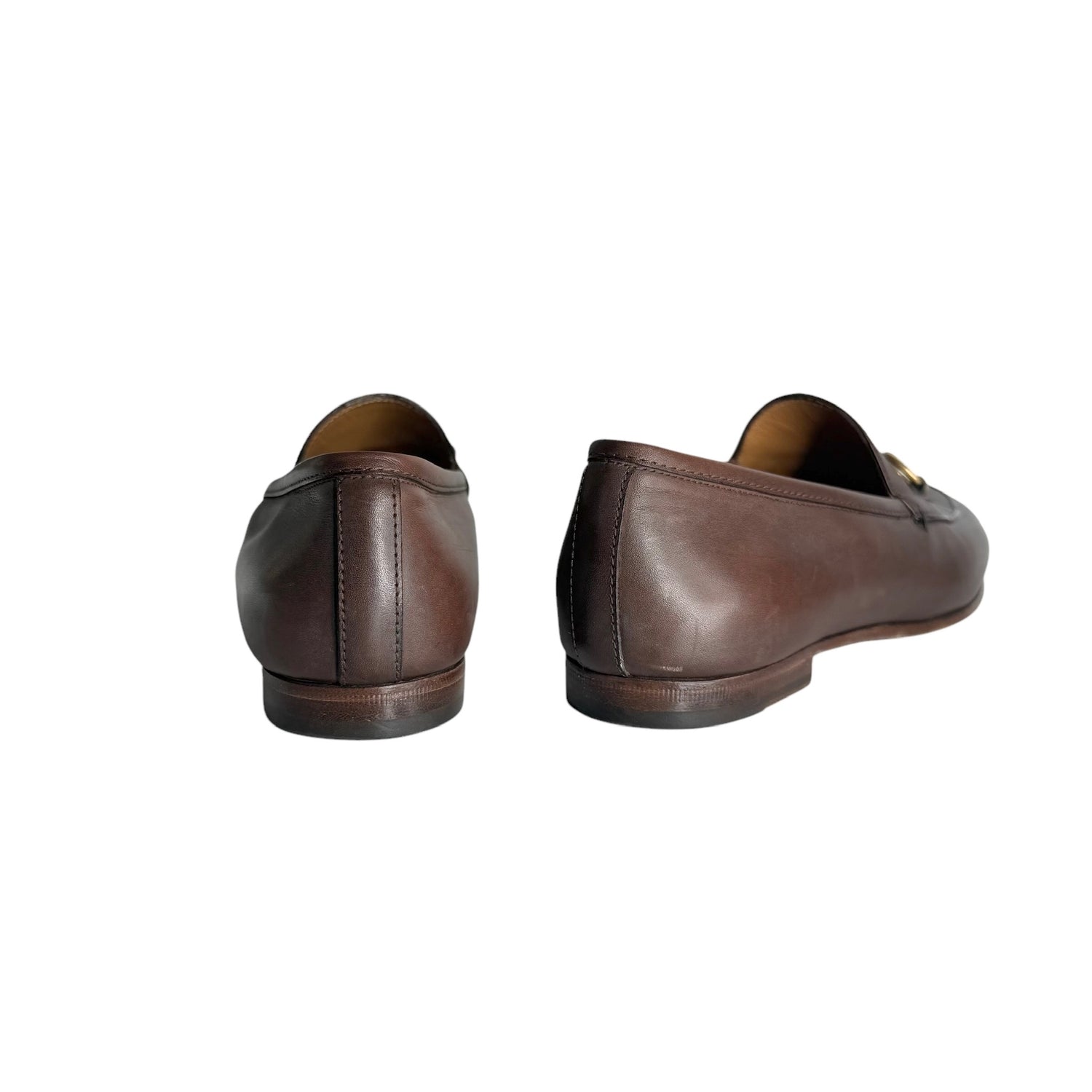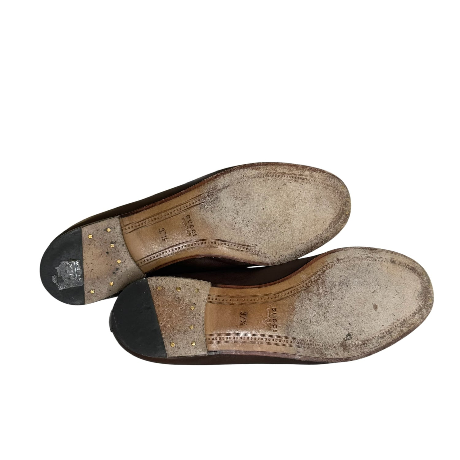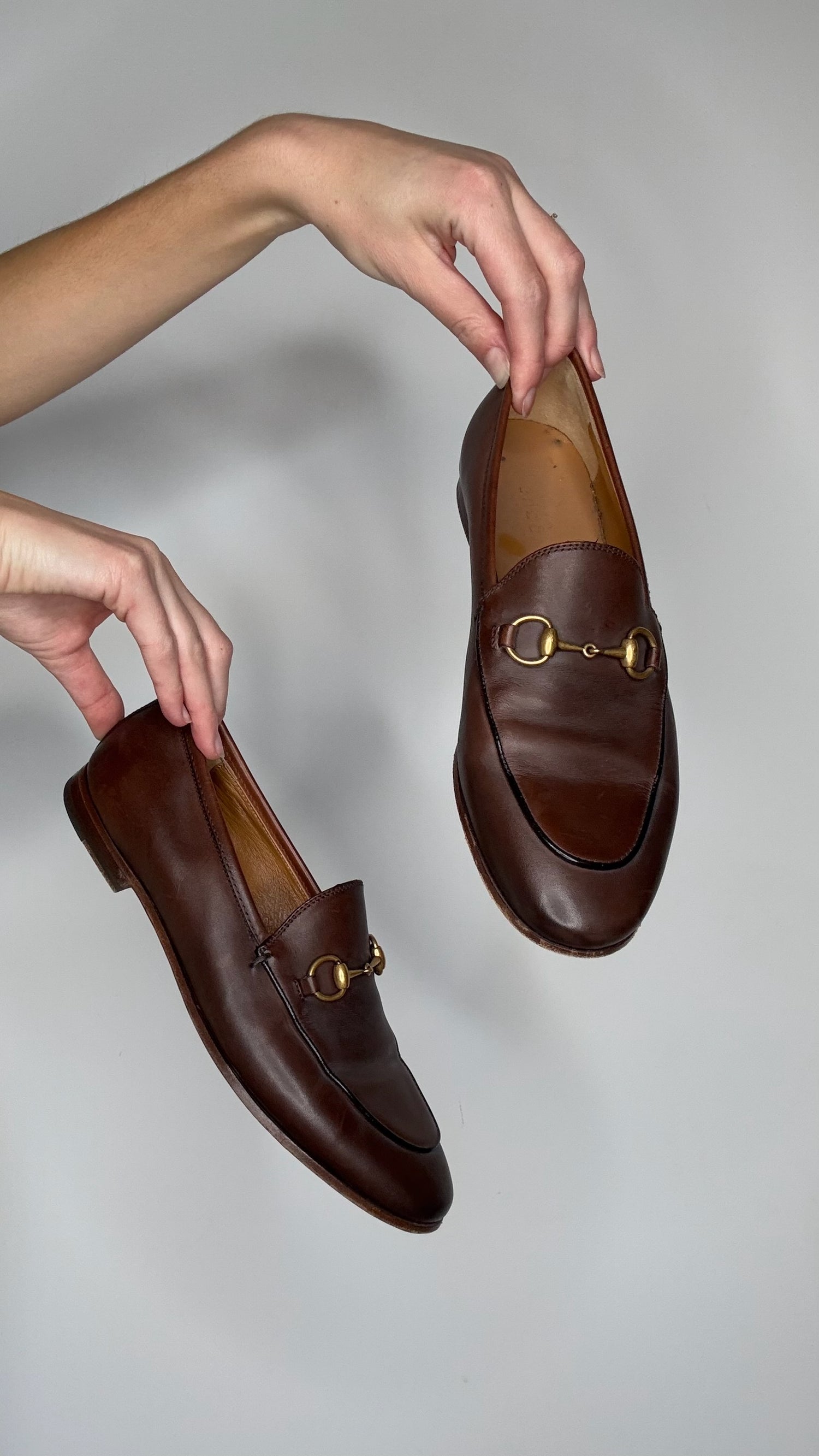 Gucci brown leather loafers. Gold-tone horse bite at top. Round toe. Designer size 37.5