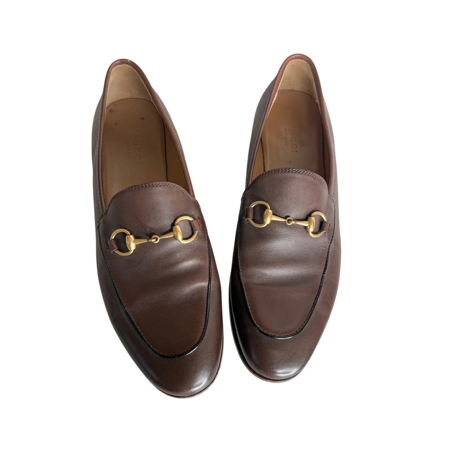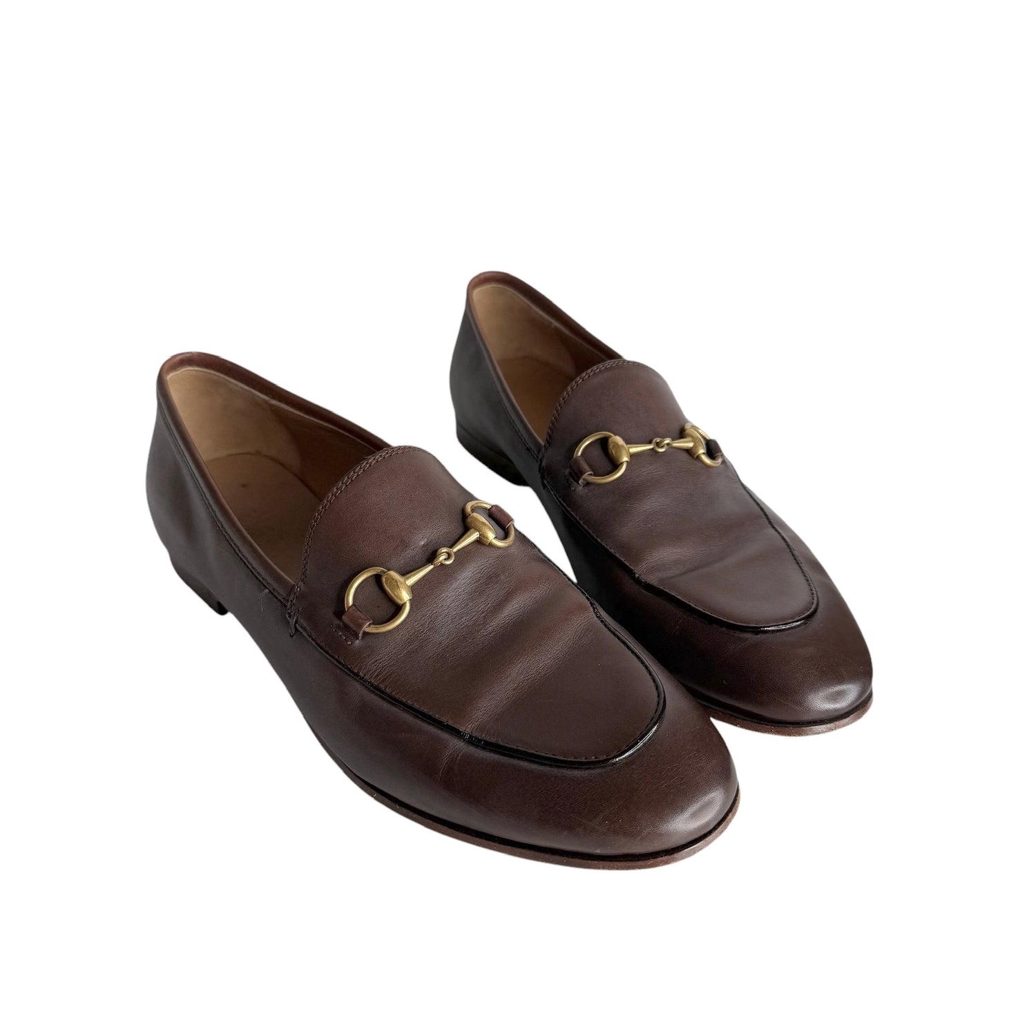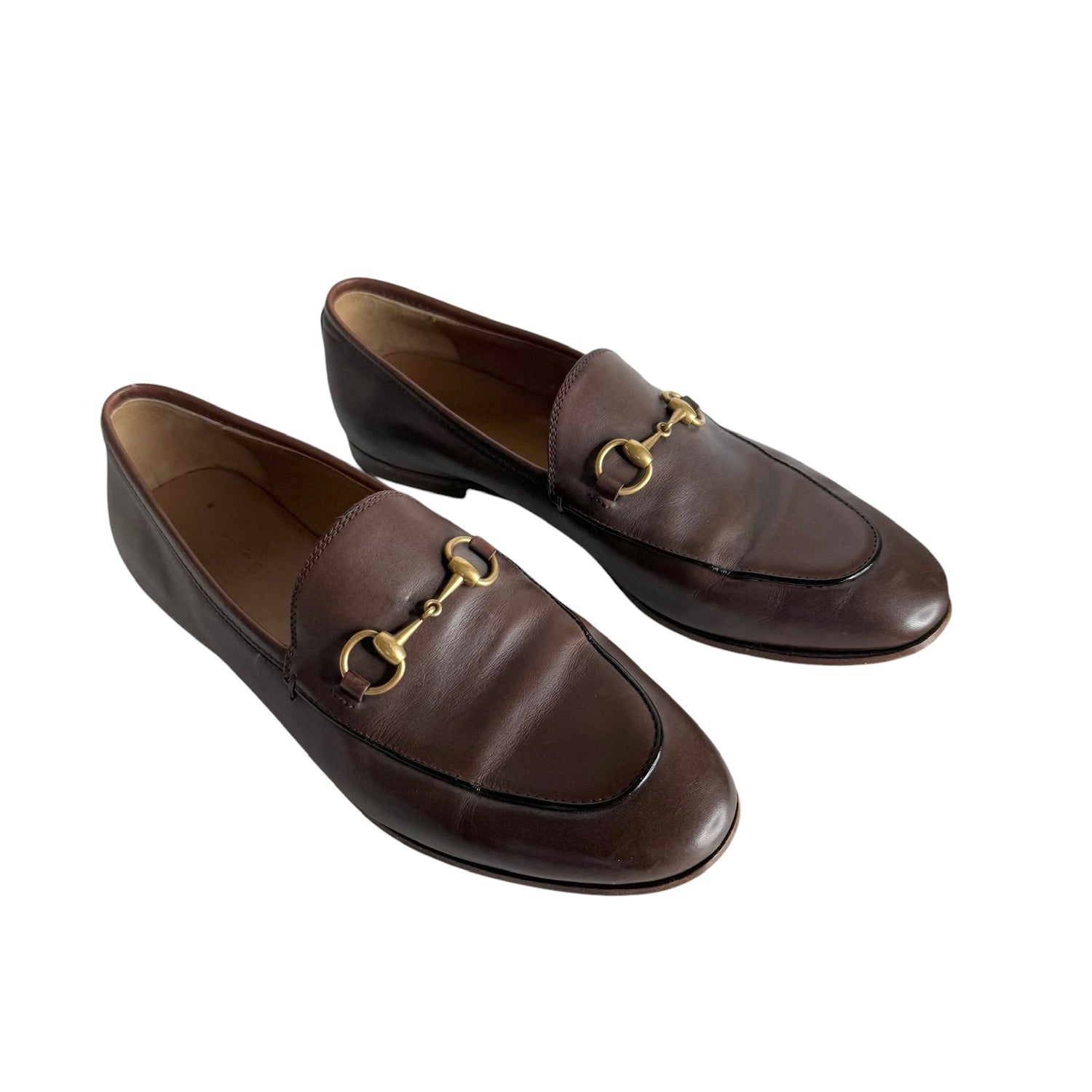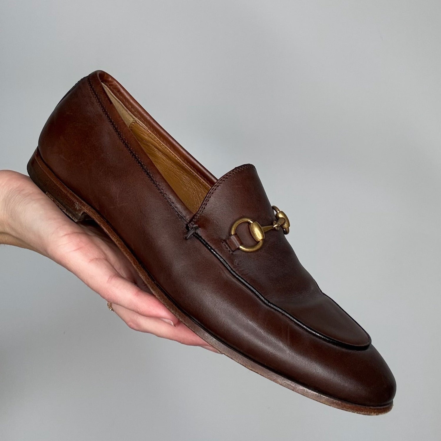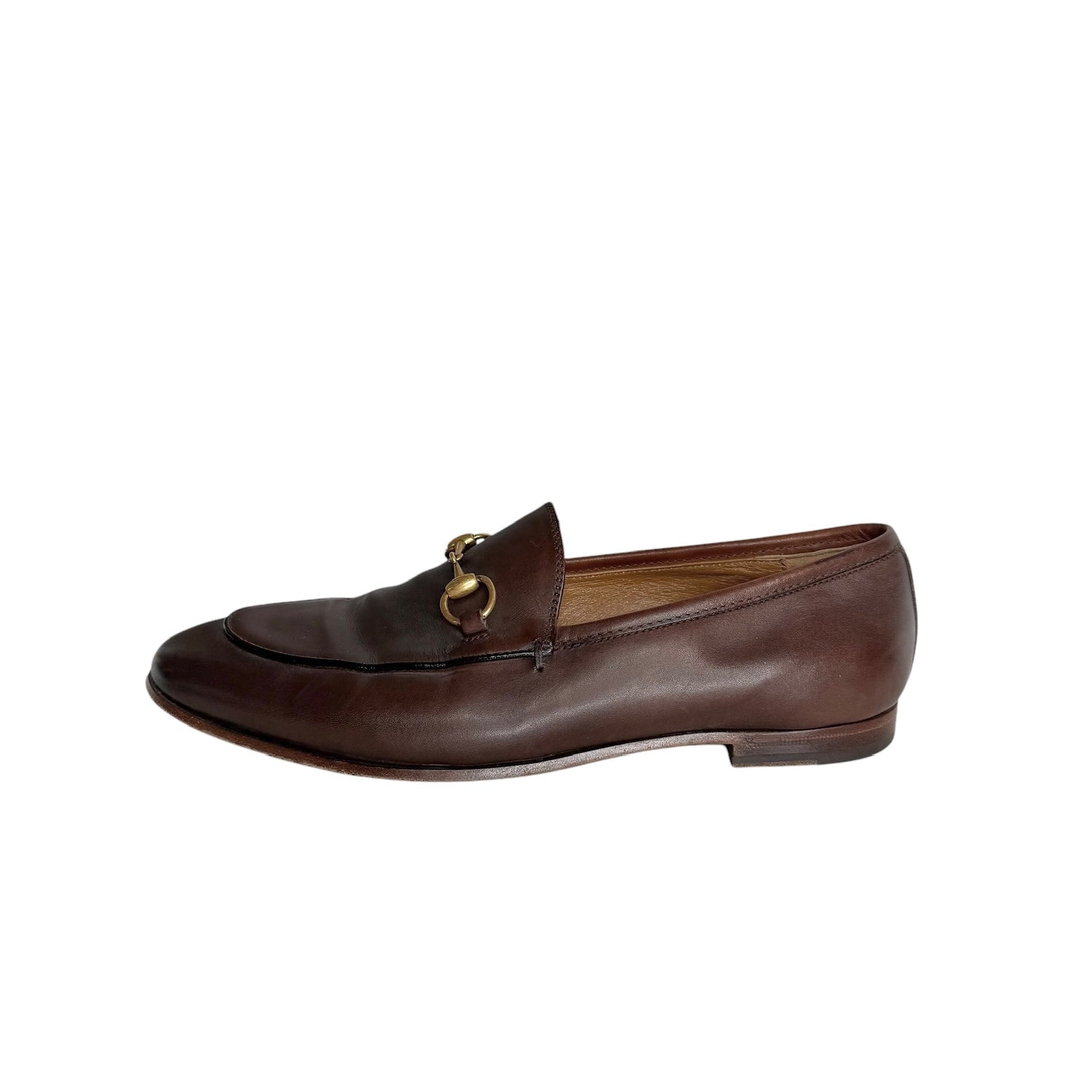 Gucci brown leather loafers. Gold-tone horse bite at top. Round toe. Designer size 37.5