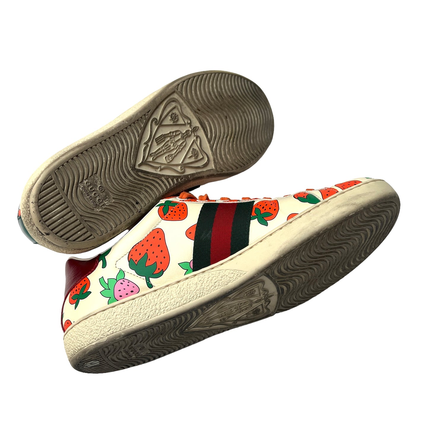 Gucci cream sneakers with strawberry print. Red and green iconic Gucci stripes at side. Logo at back. Laces closure on top. Round toe. Rubber outer soles. Gucci size 39.