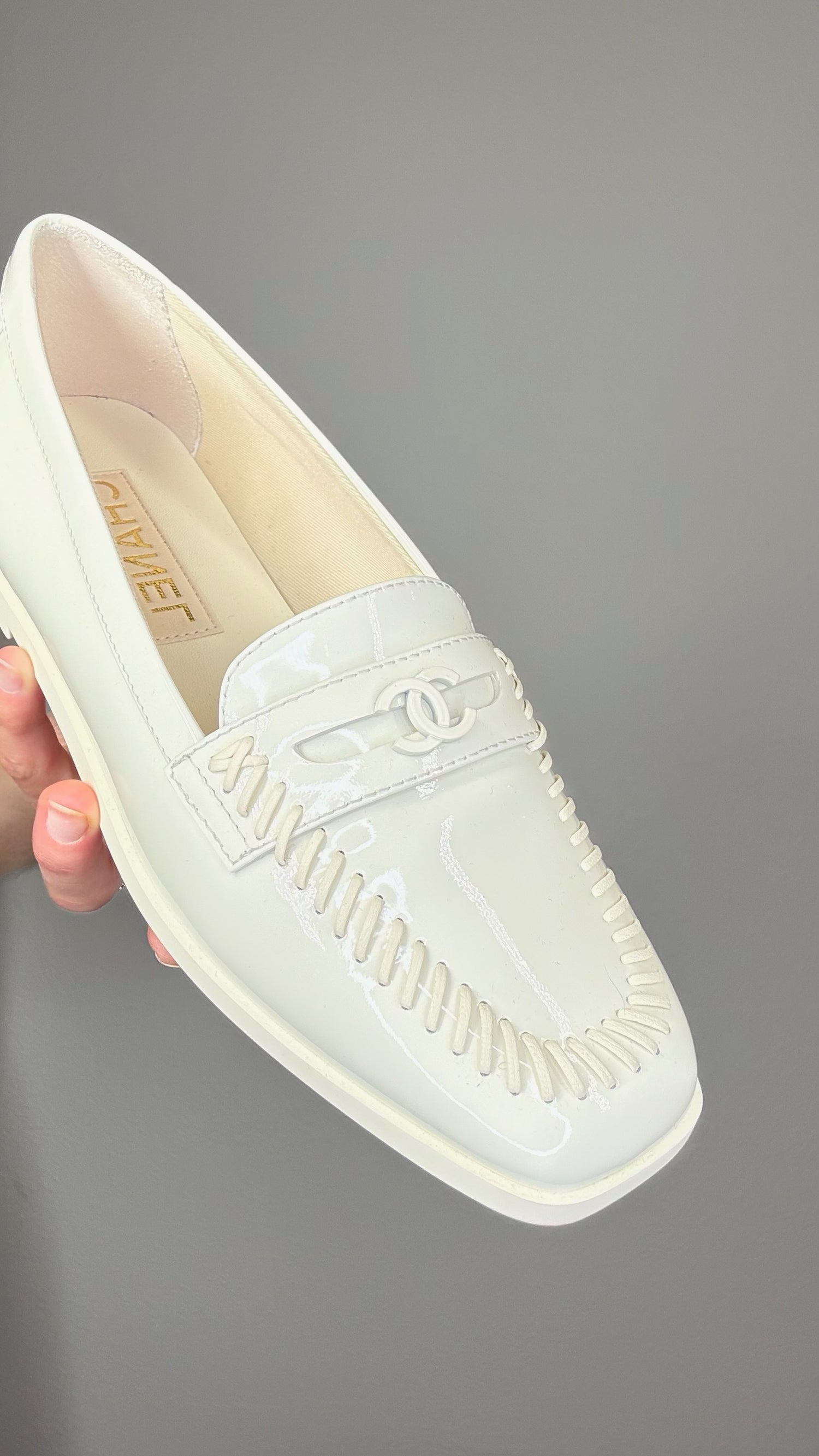 Chanel cream patent loafers with logo and overstitch details. Designer size 38.