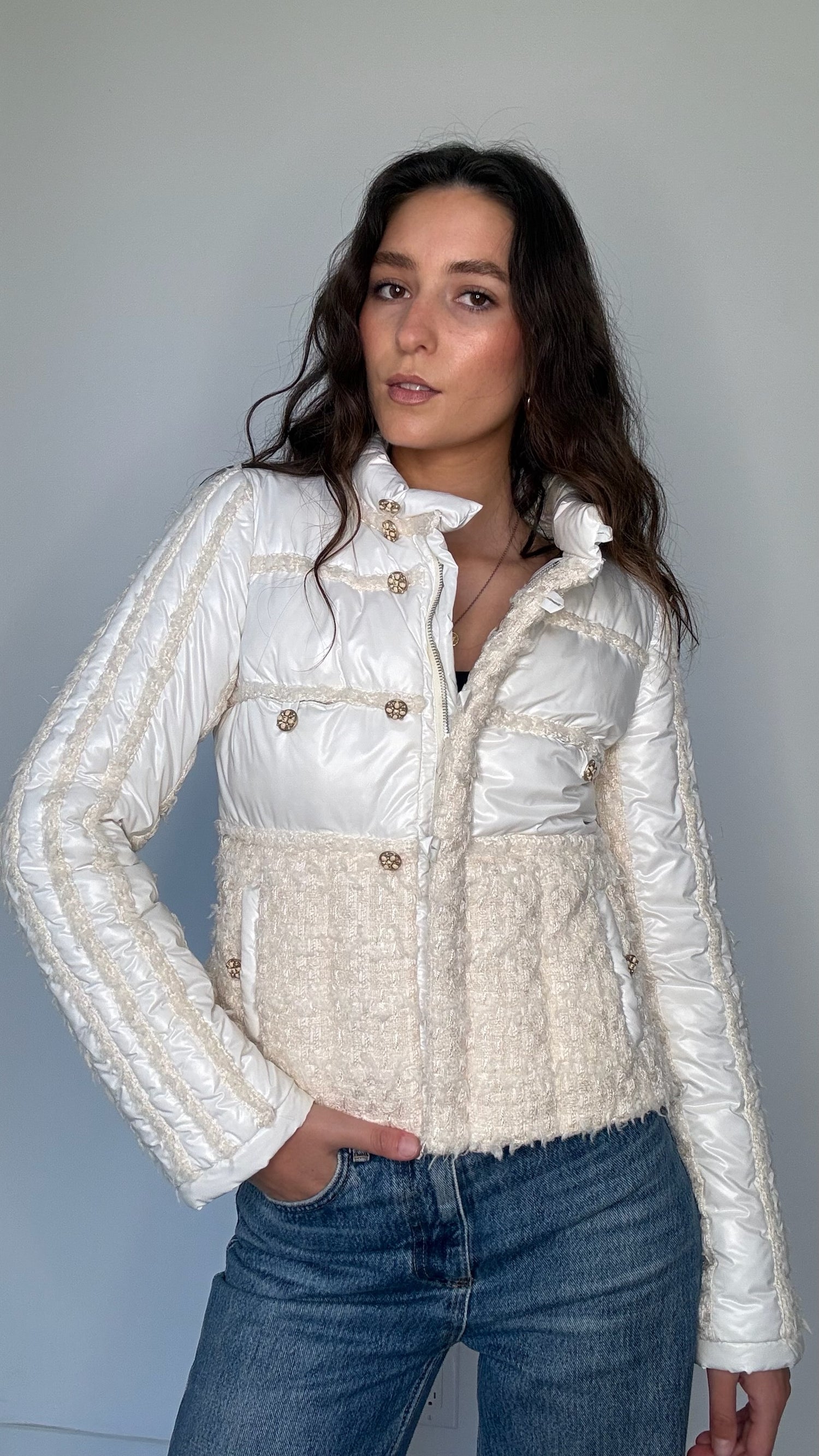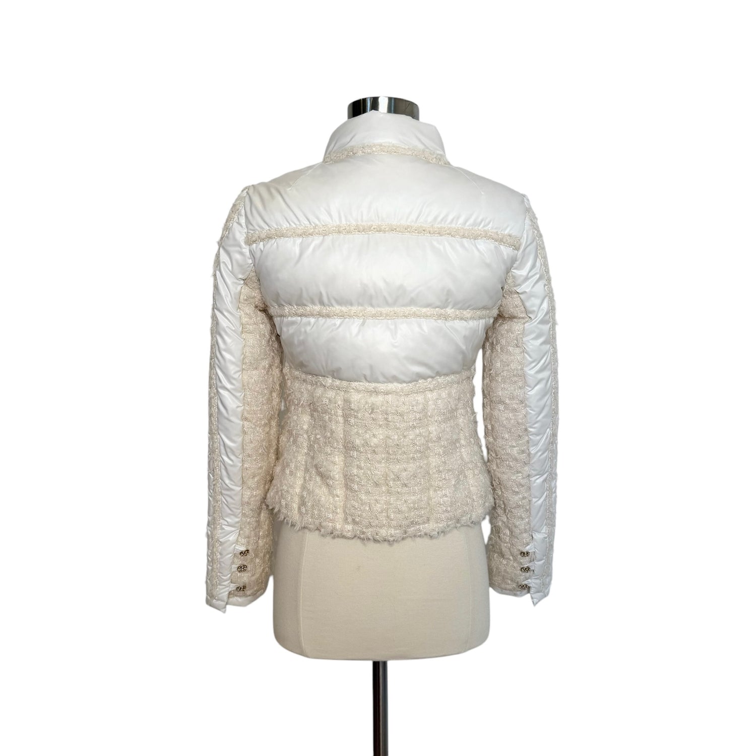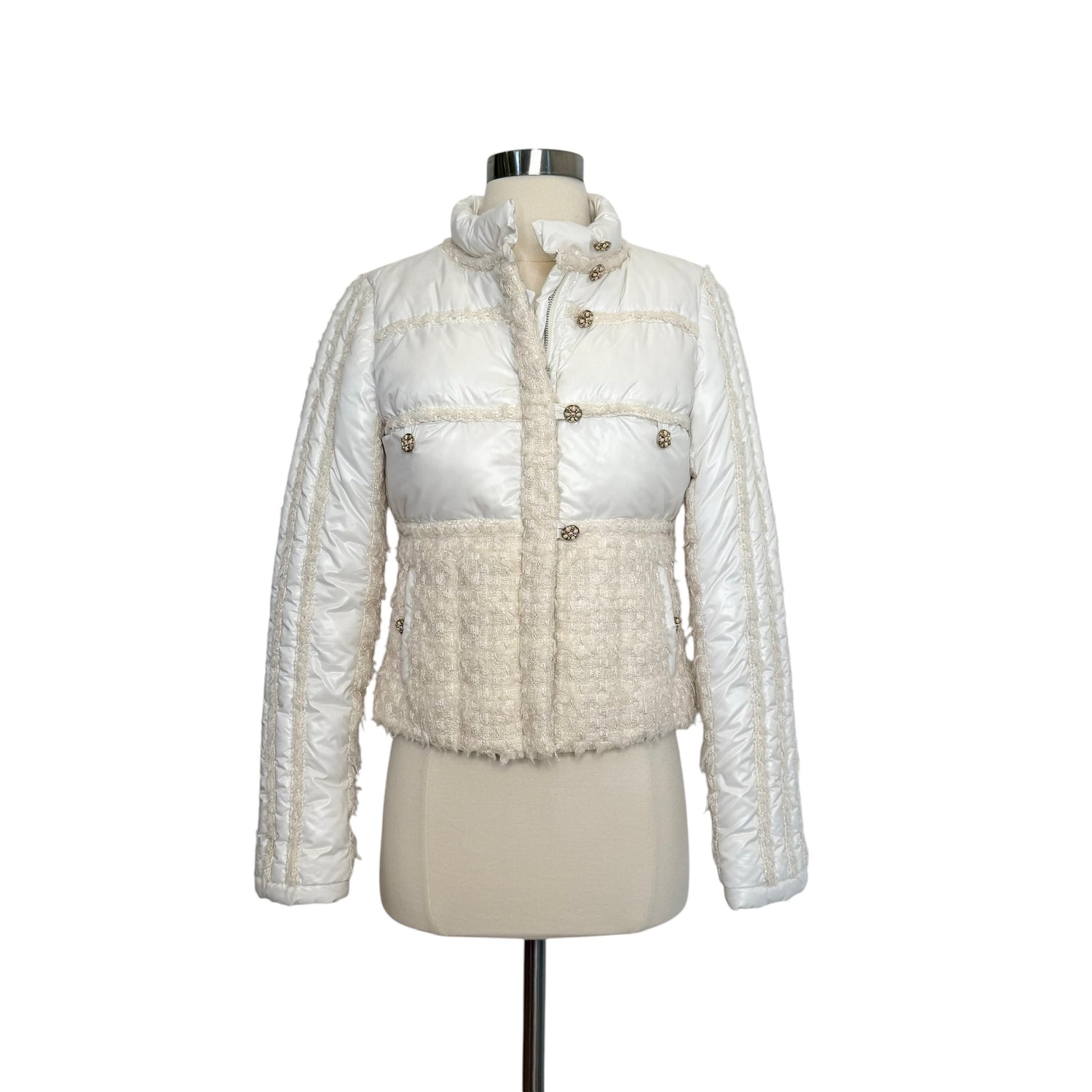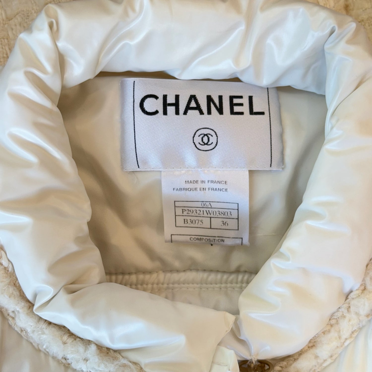 Chanel cream tweed puffer jacket. Fall 2006 Collection. Beautiful cream tweed trims. Zipper and button closure. Gripoix CC logo buttons with champagne hardware. Designer size 36 (best for 0-2).
