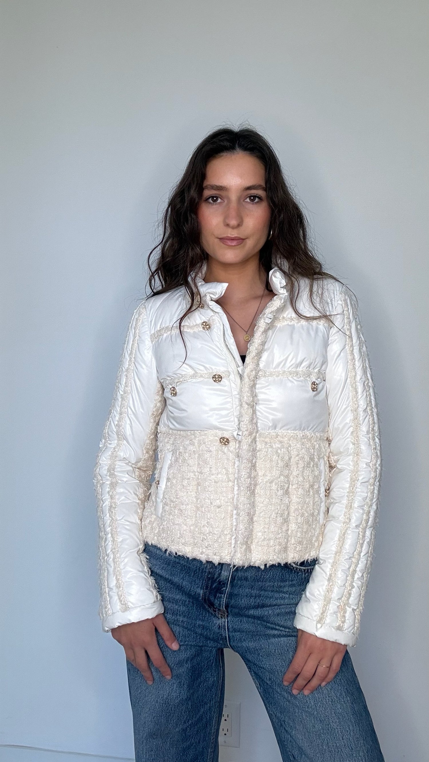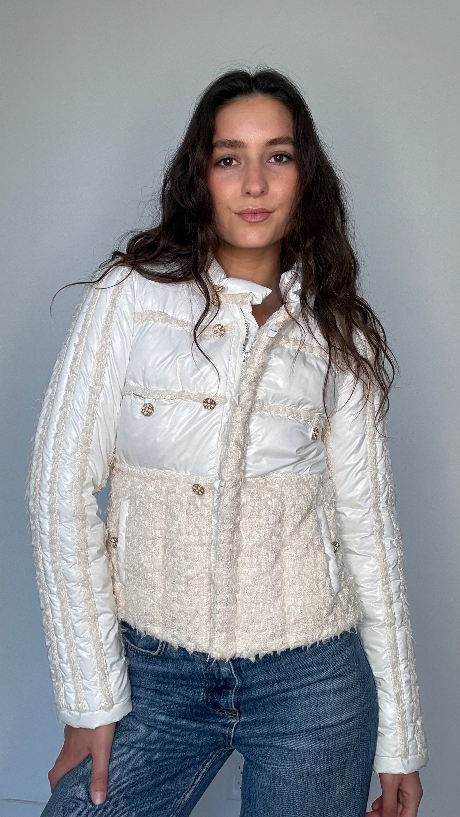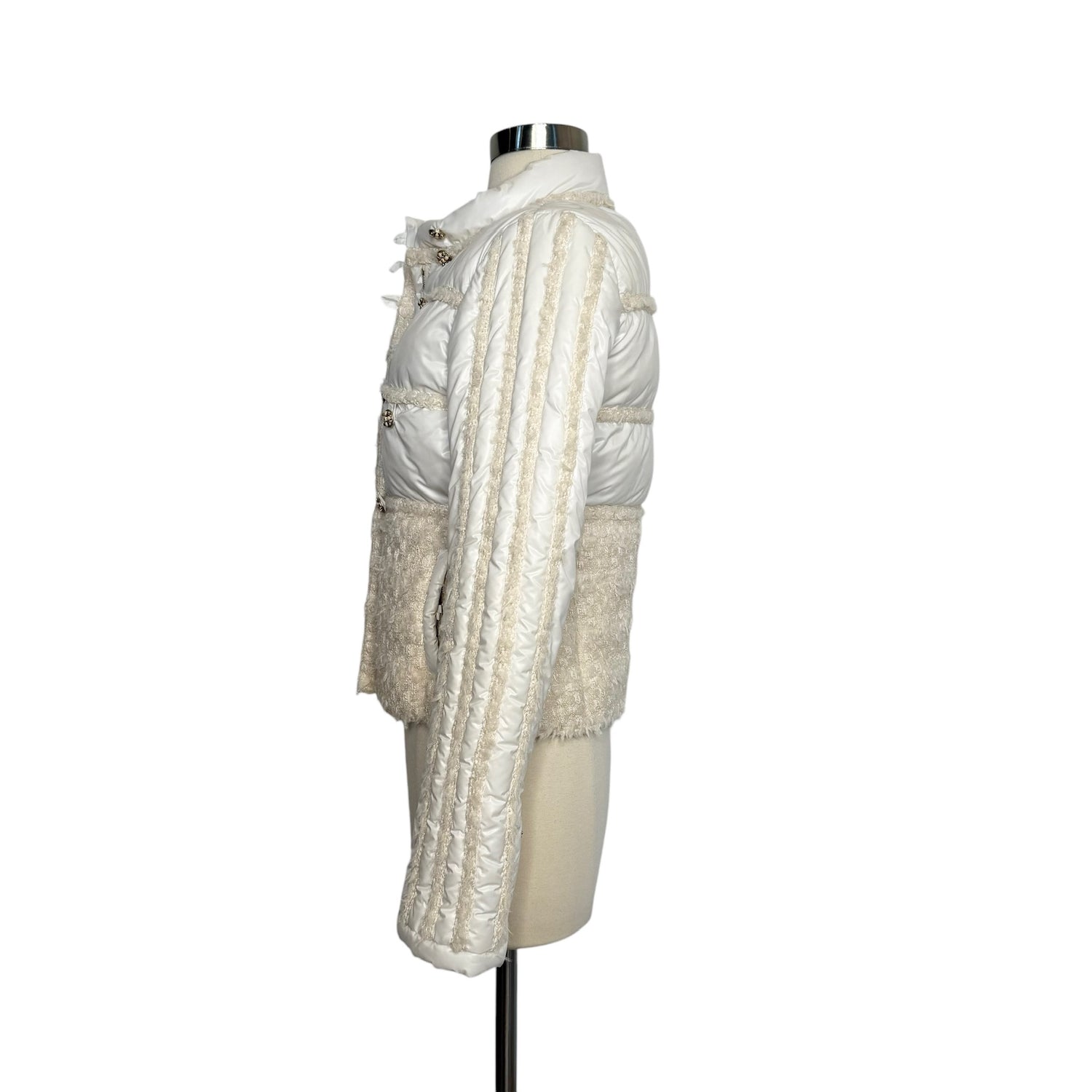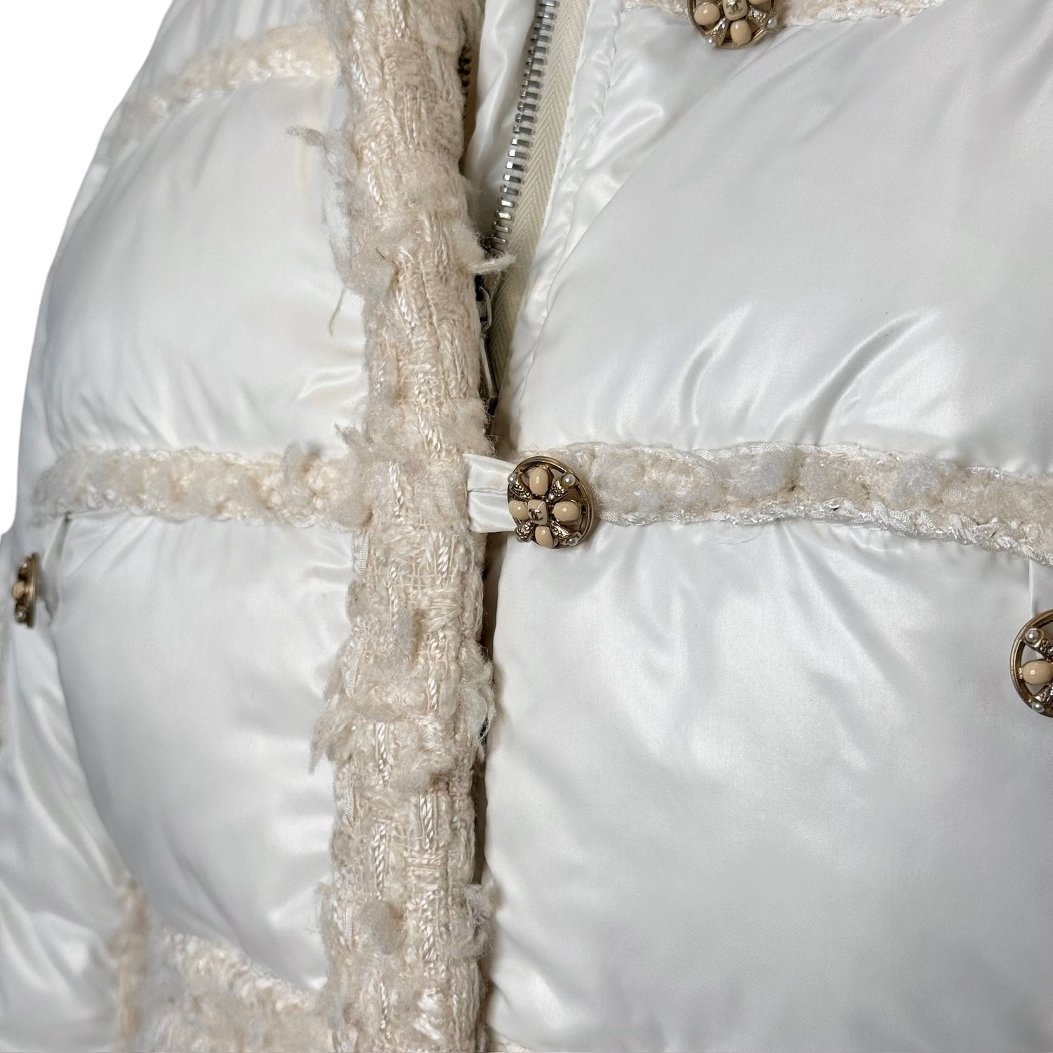 Chanel cream tweed puffer jacket. Fall 2006 Collection. Beautiful cream tweed trims. Zipper and button closure. Gripoix CC logo buttons with champagne hardware. Designer size 36 (best for 0-2).