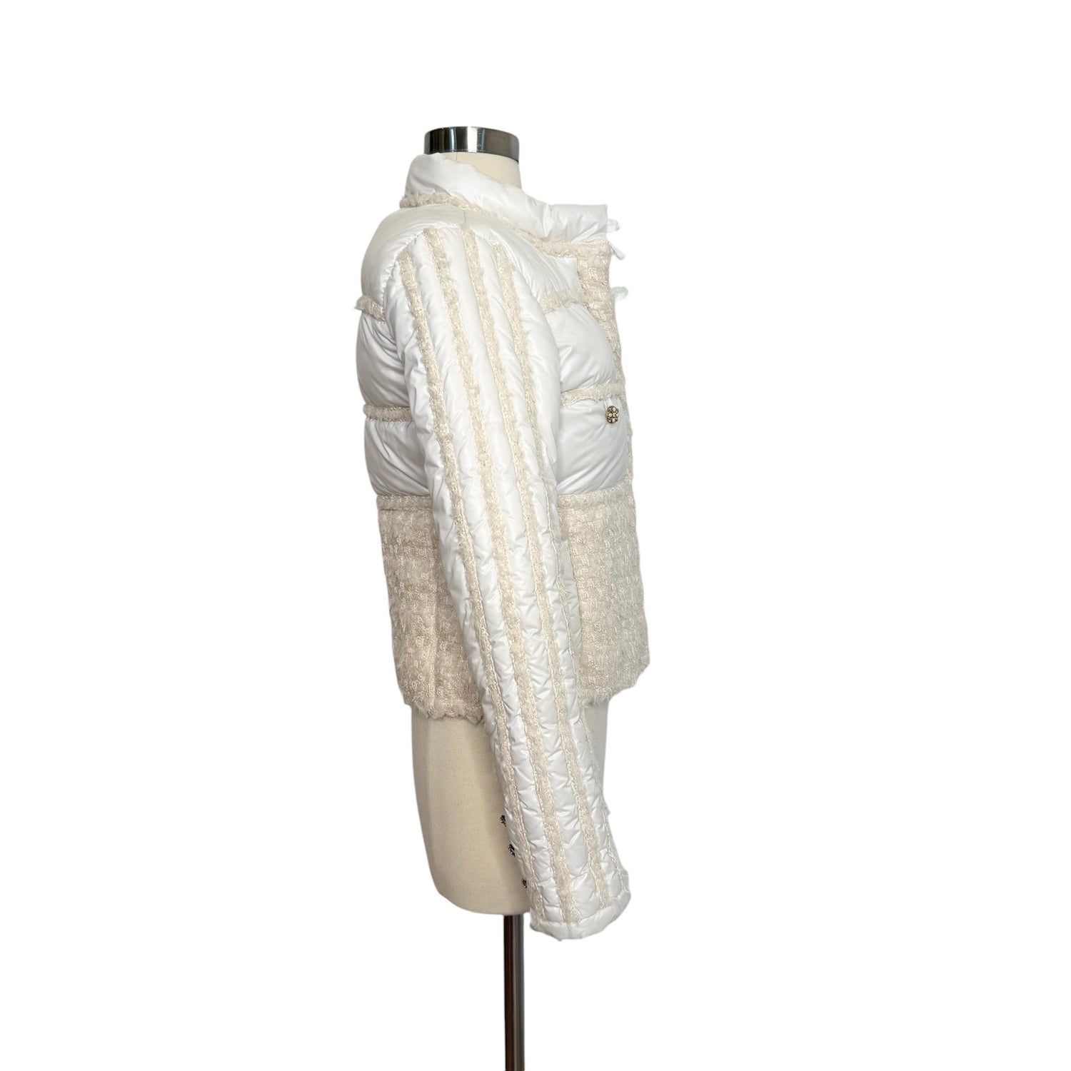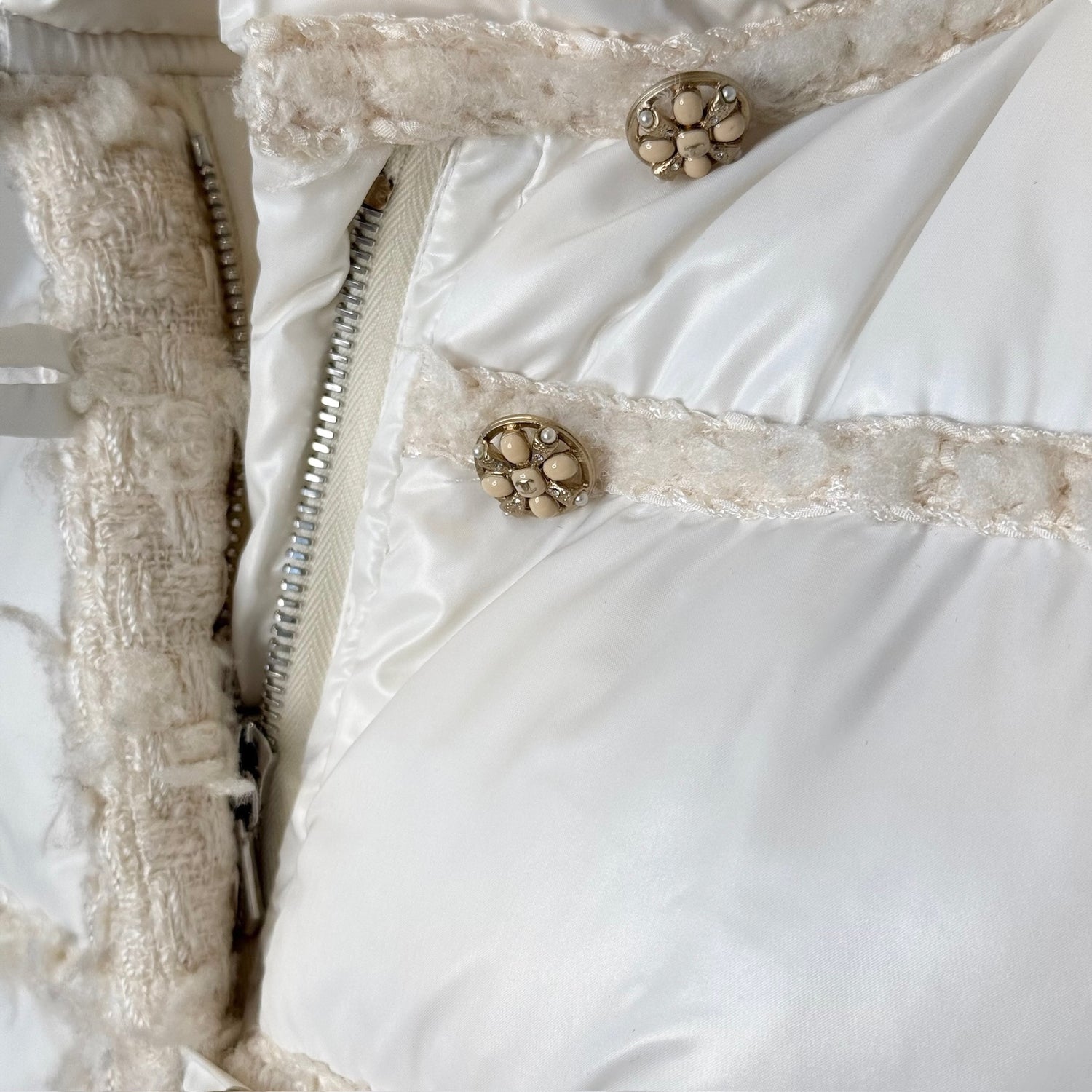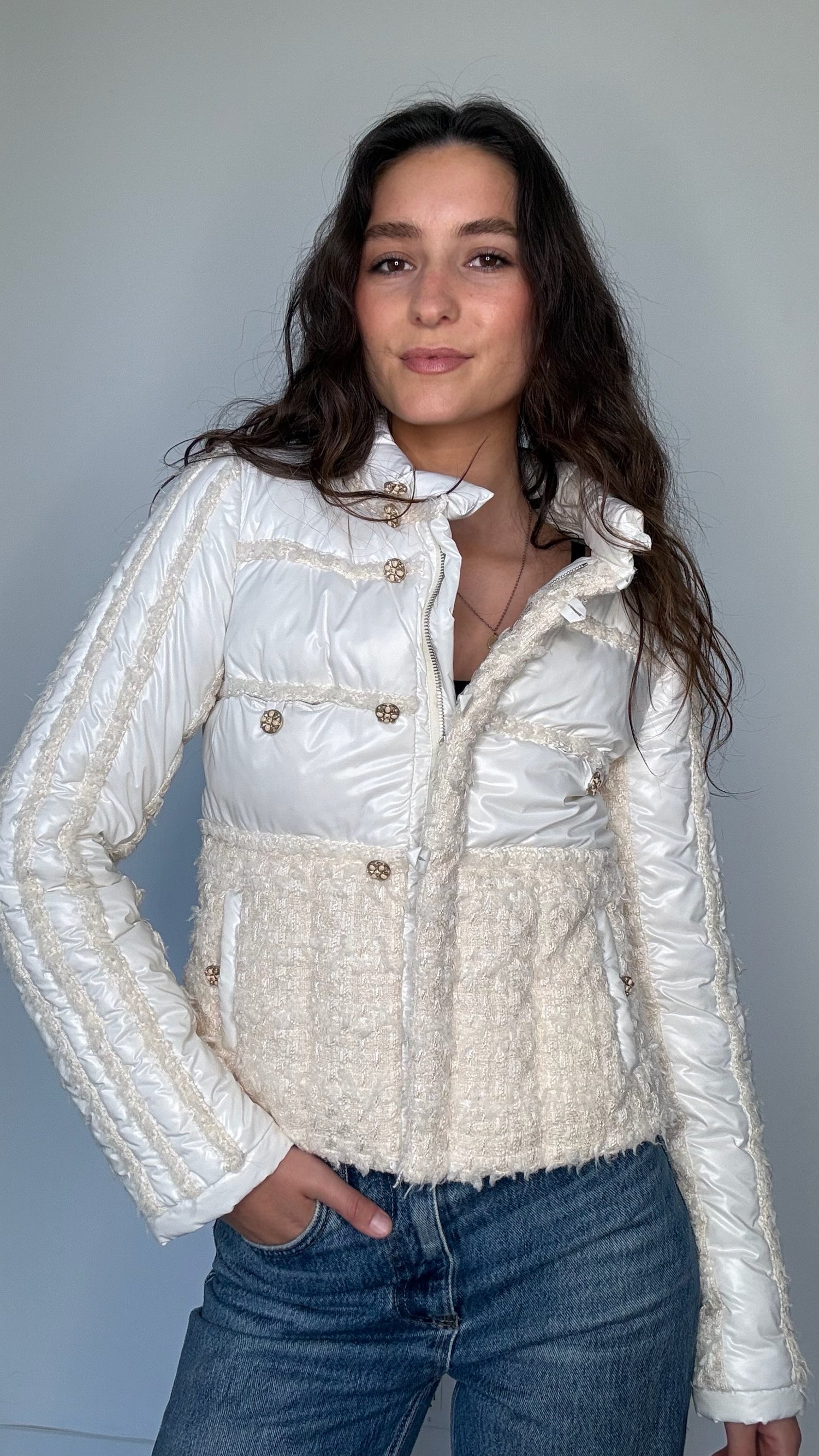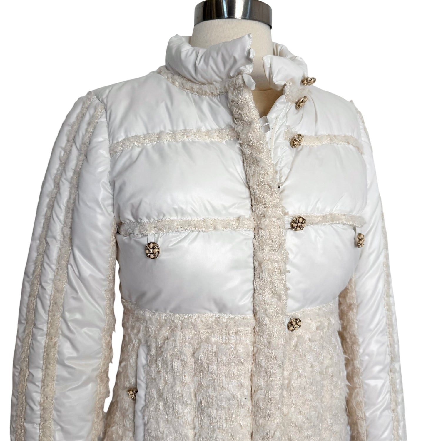Chanel cream tweed puffer jacket. Fall 2006 Collection. Beautiful cream tweed trims. Zipper and button closure. Gripoix CC logo buttons with champagne hardware. Designer size 36 (best for 0-2).