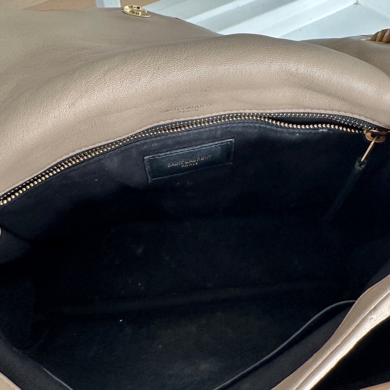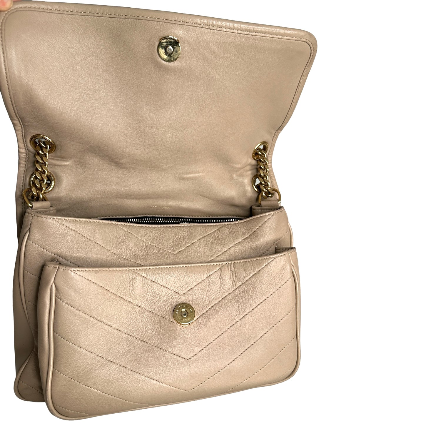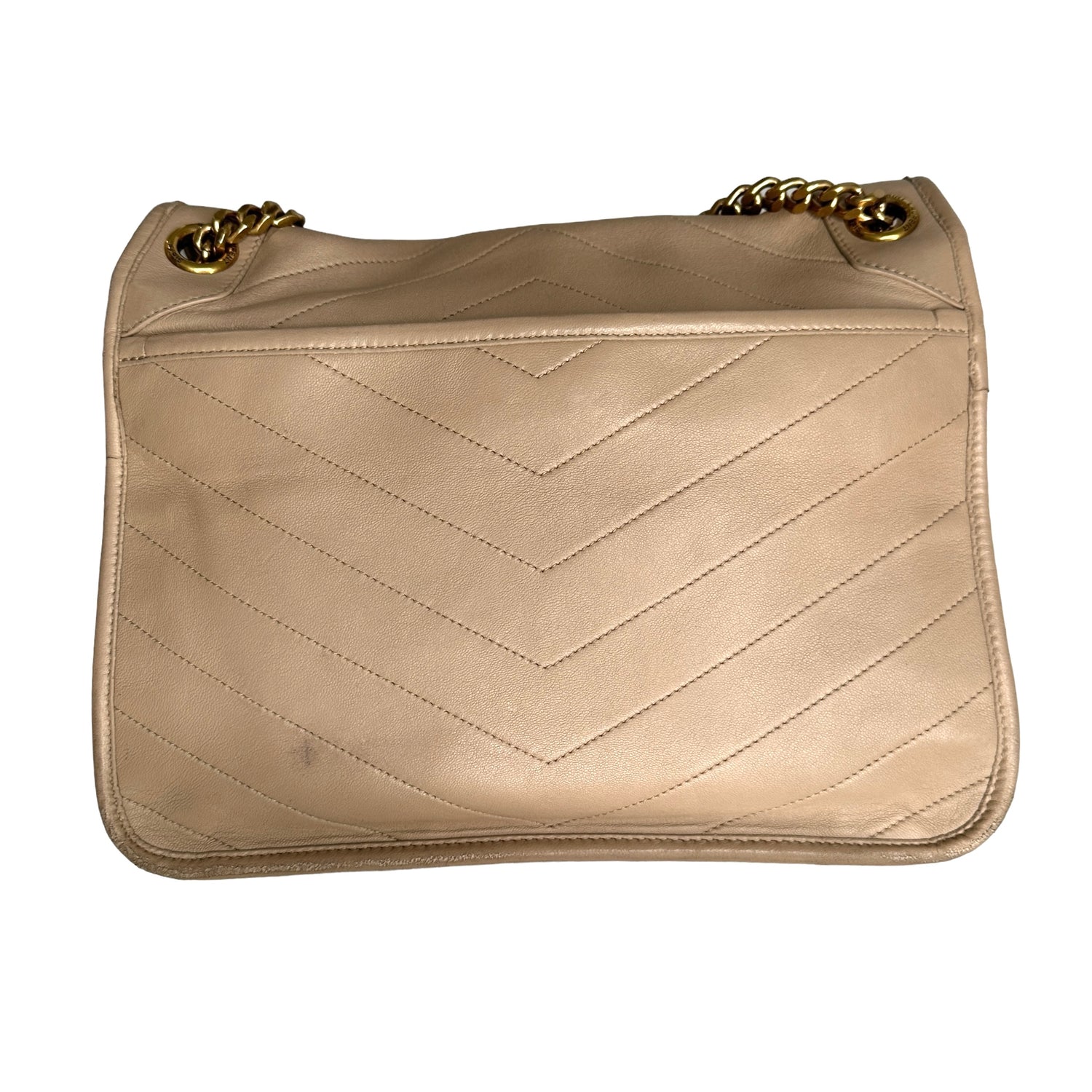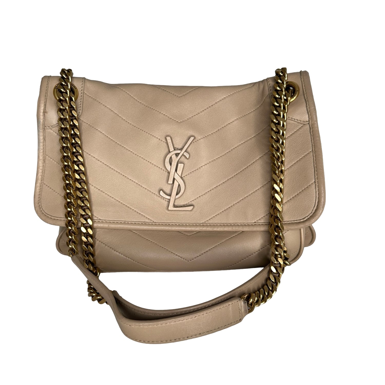 Saint Laurent Niki bag. Cream color leather. Black canvas lining. YSL tonal logo at front. Magnetic snap closure at flap. Gold-tone hardware. One interior zipper pocket.