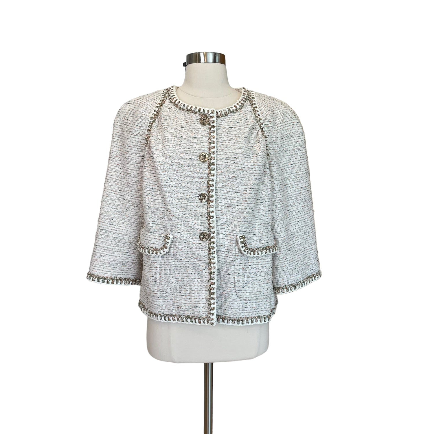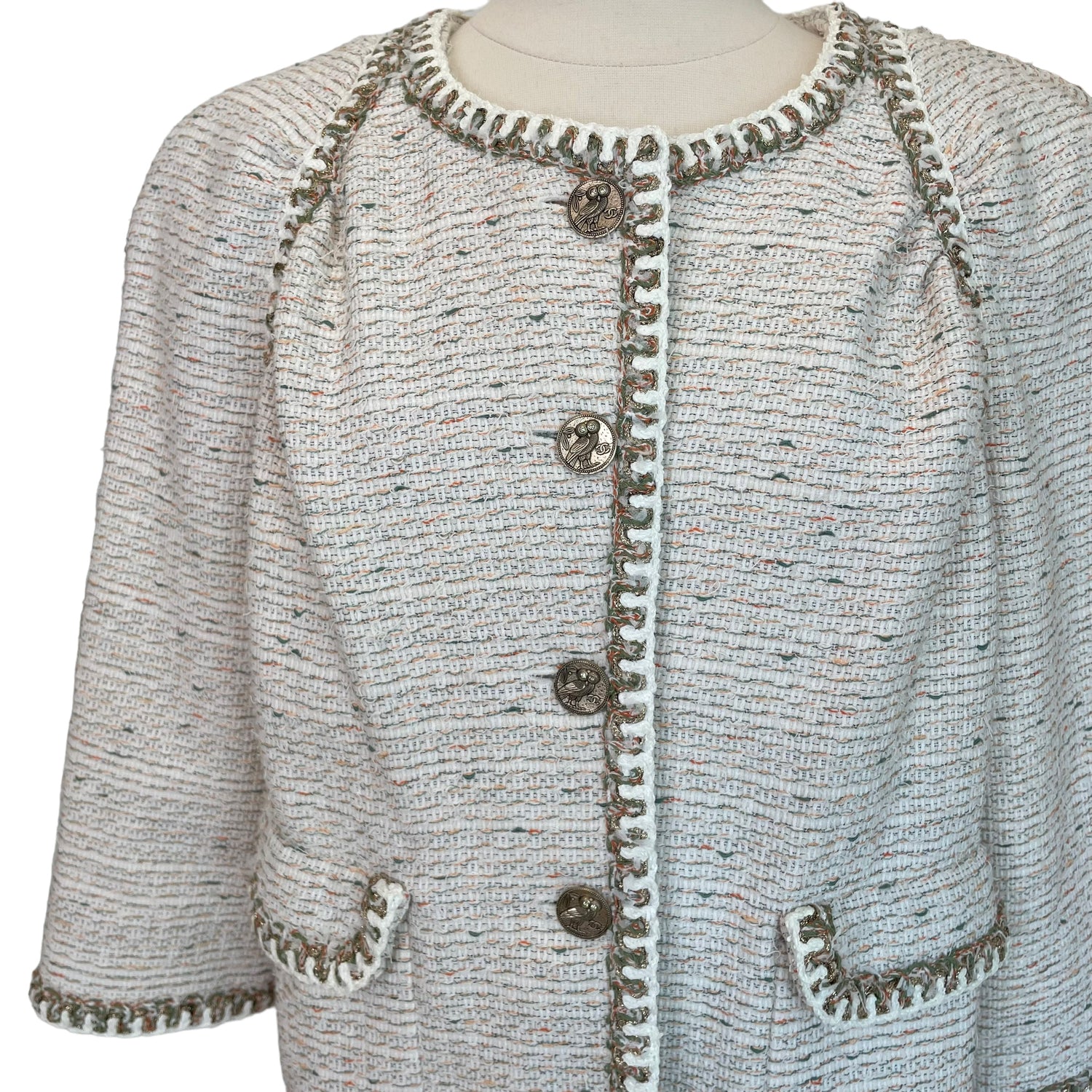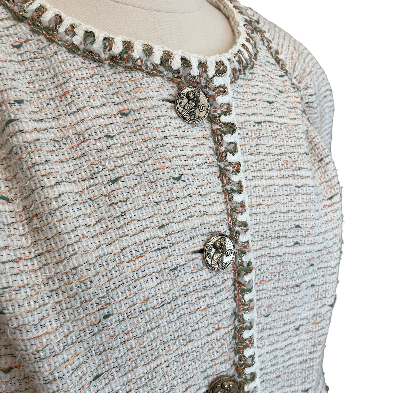 Chanel cream and multicolor tweed jacket with woven trim, and logo owl button closures. Padding at shoulders. Two front pockets. Designer size 48.