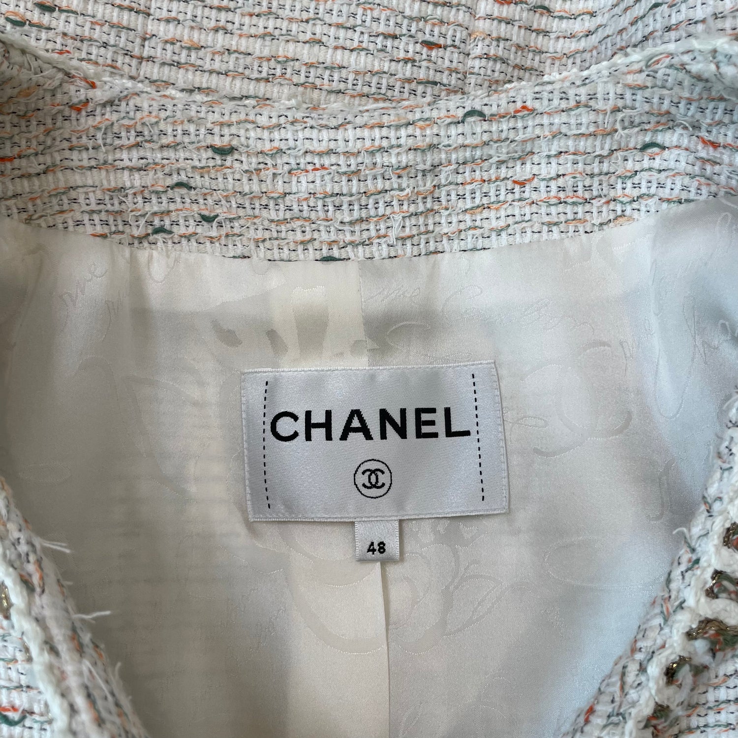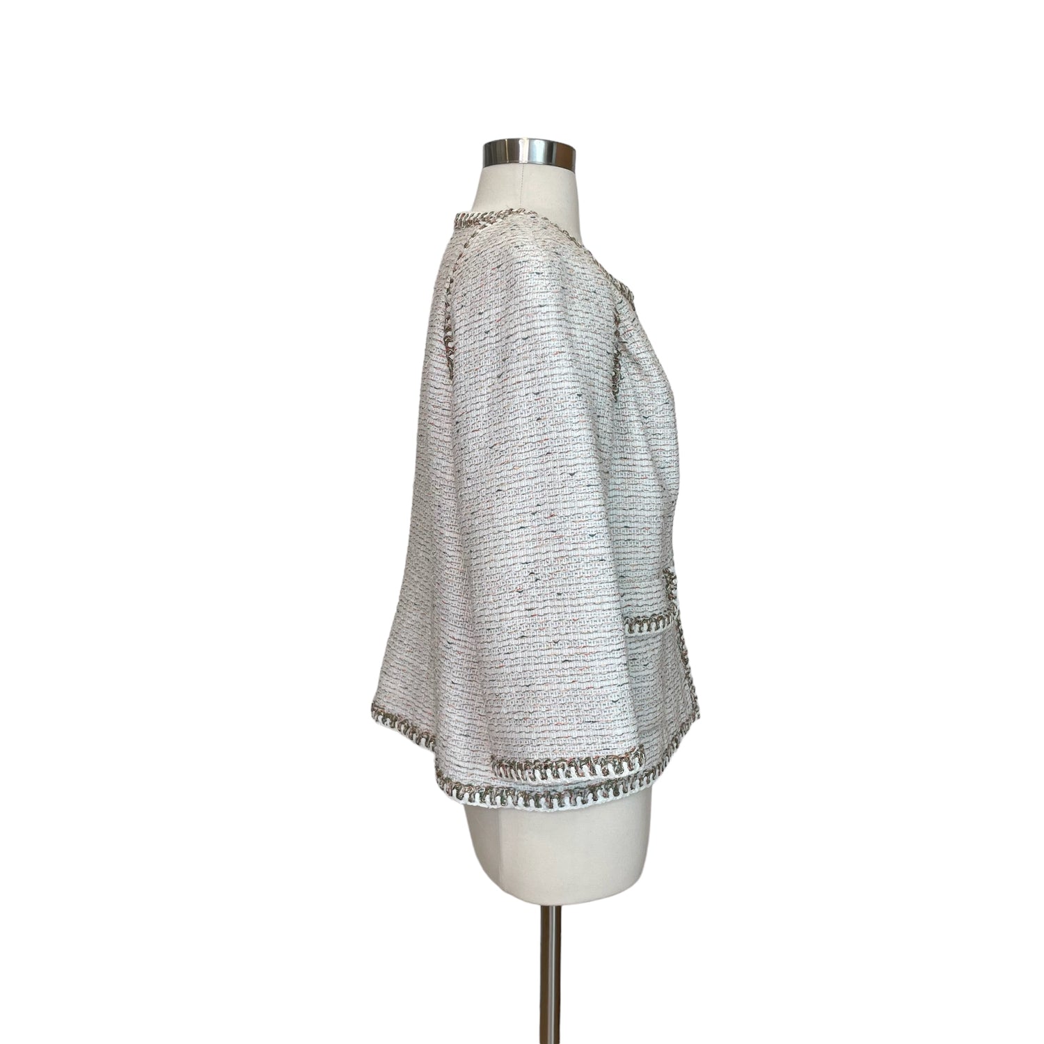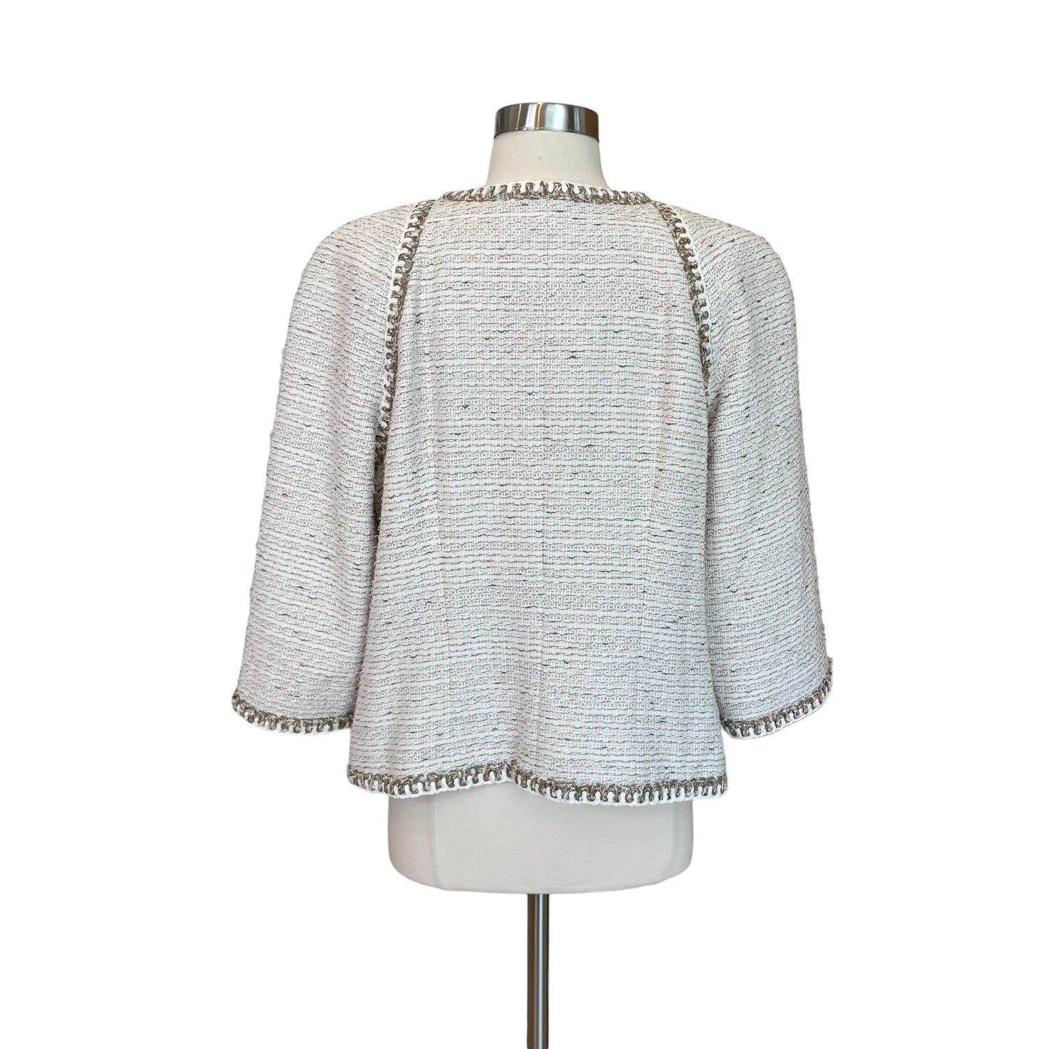 Chanel cream and multicolor tweed jacket with woven trim, and logo owl button closures. Padding at shoulders. Two front pockets. Designer size 48.