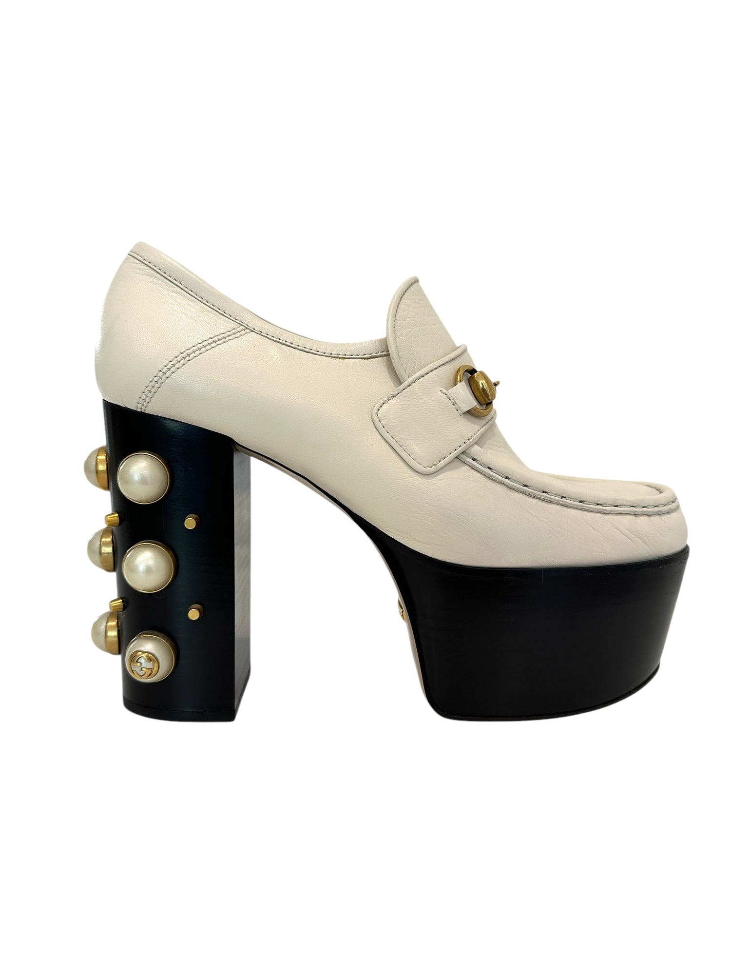 Gucci platform loafers. Gold tone iconic horse-bite at top. Faux pearl and logo embellishments at heels. Block heels. Designer size 39 (true to size).
