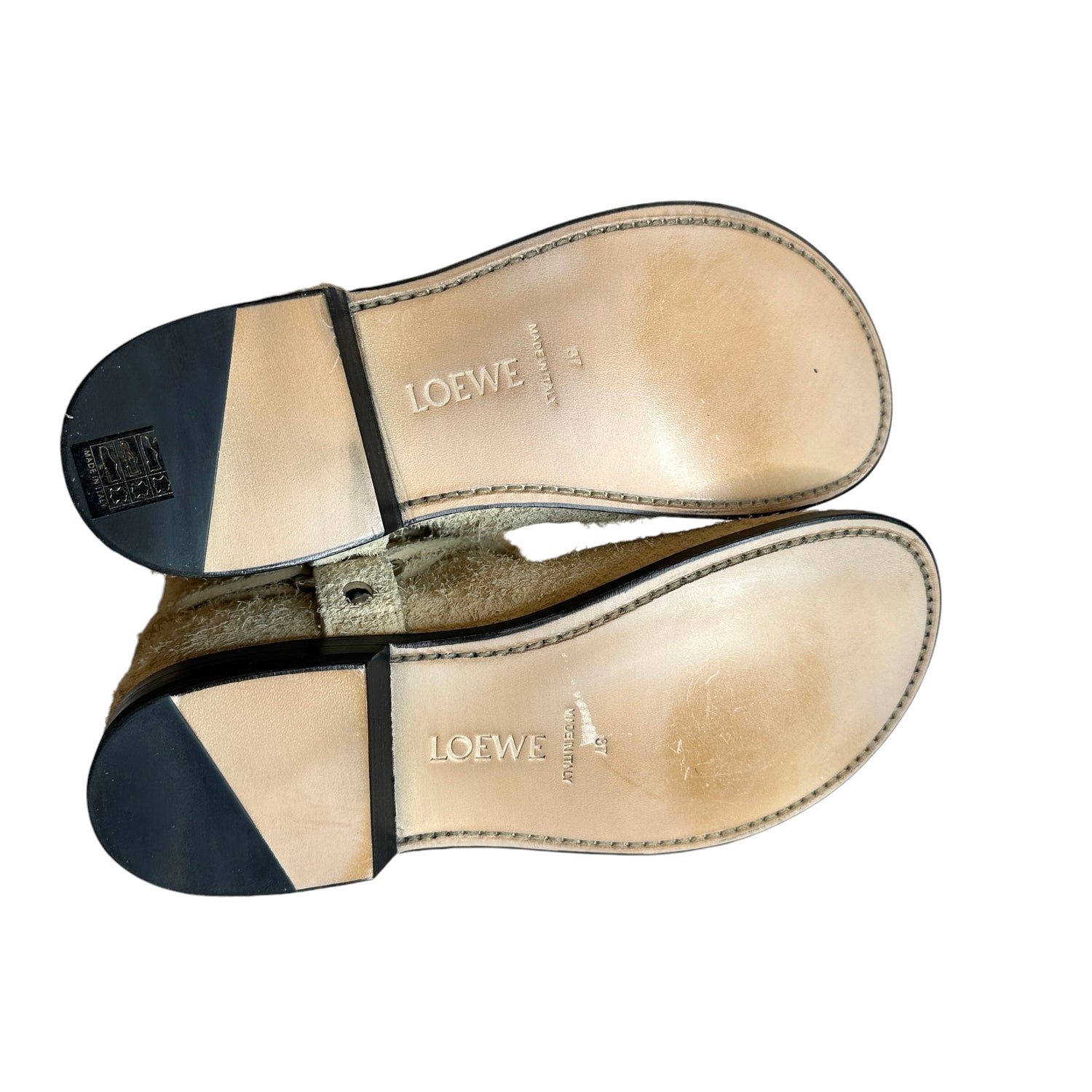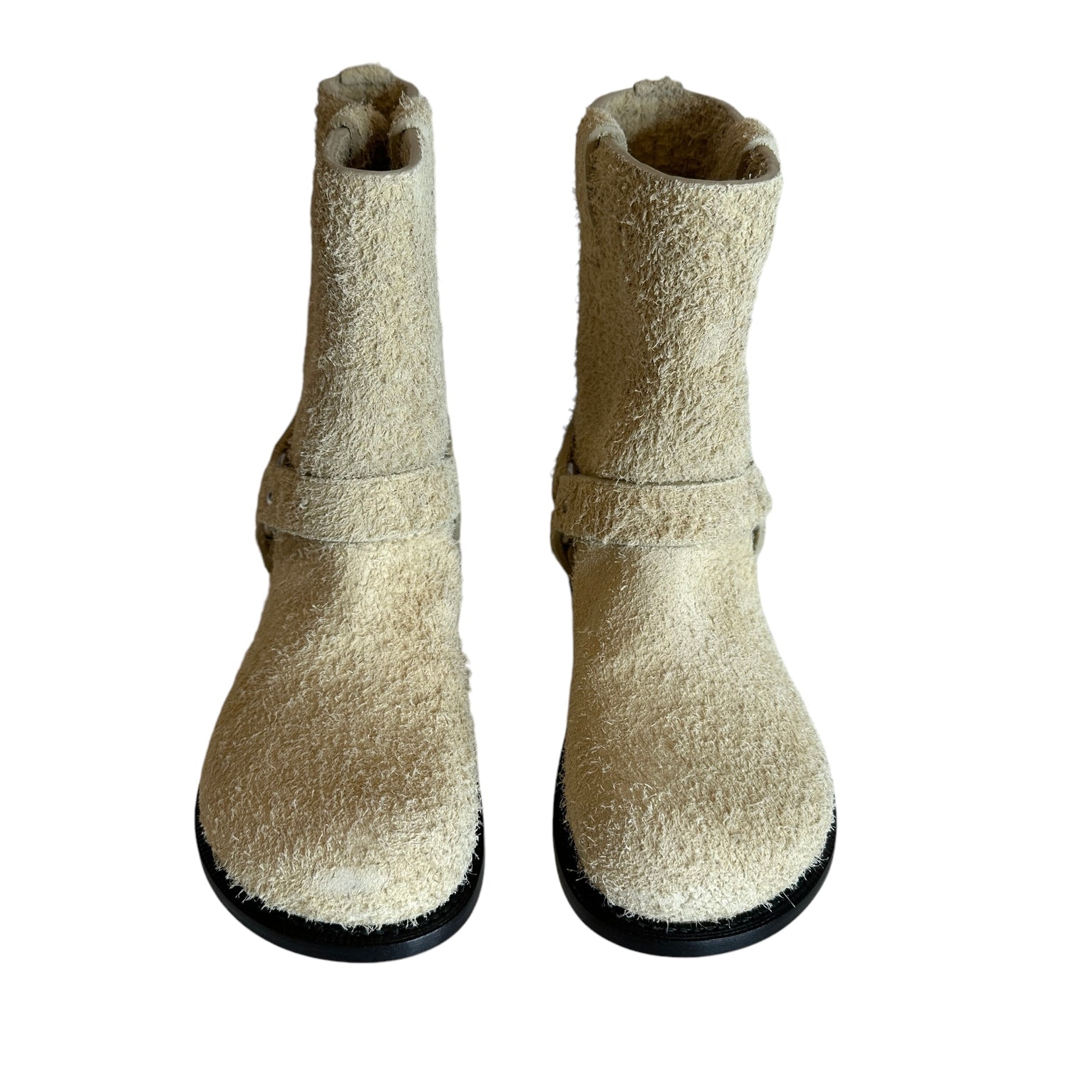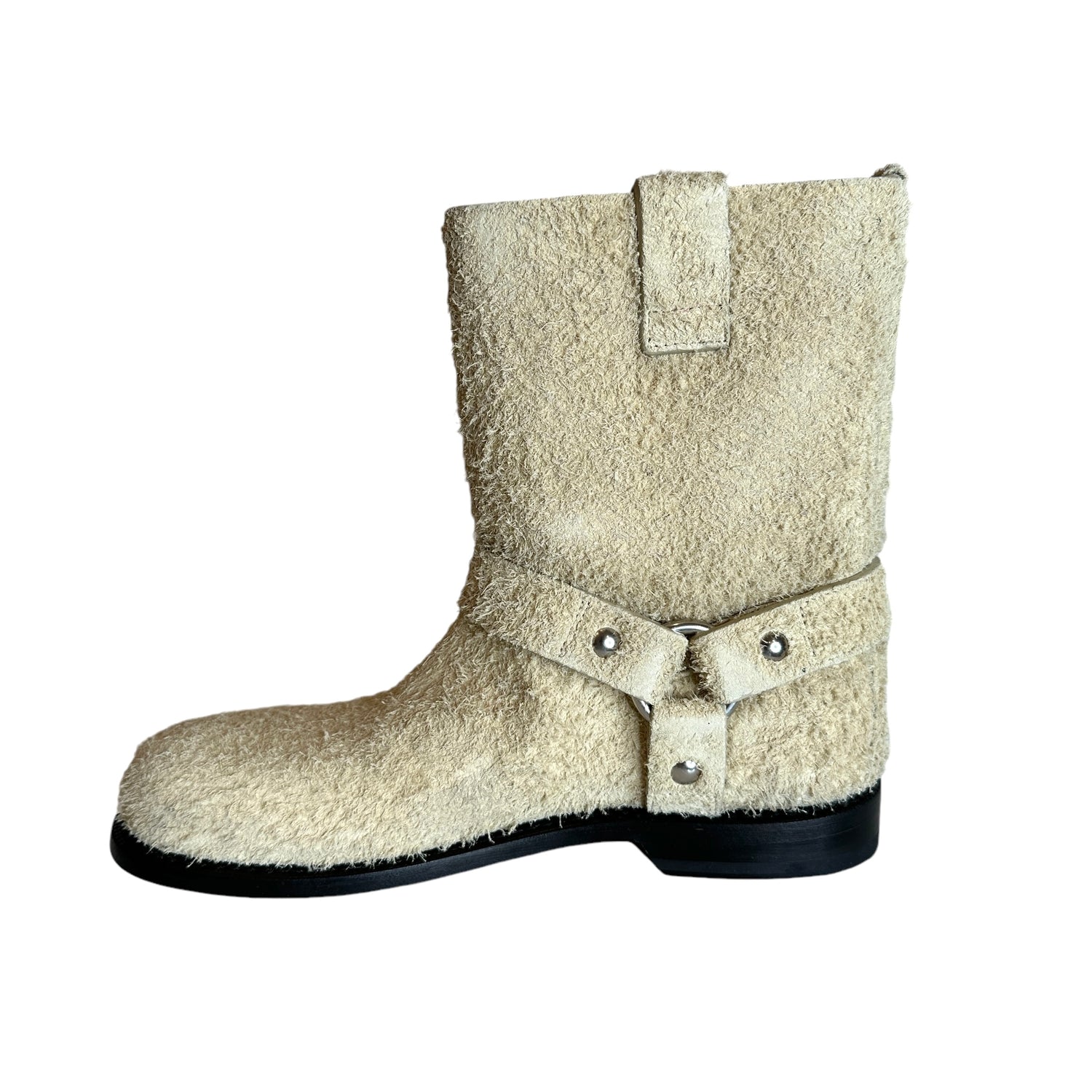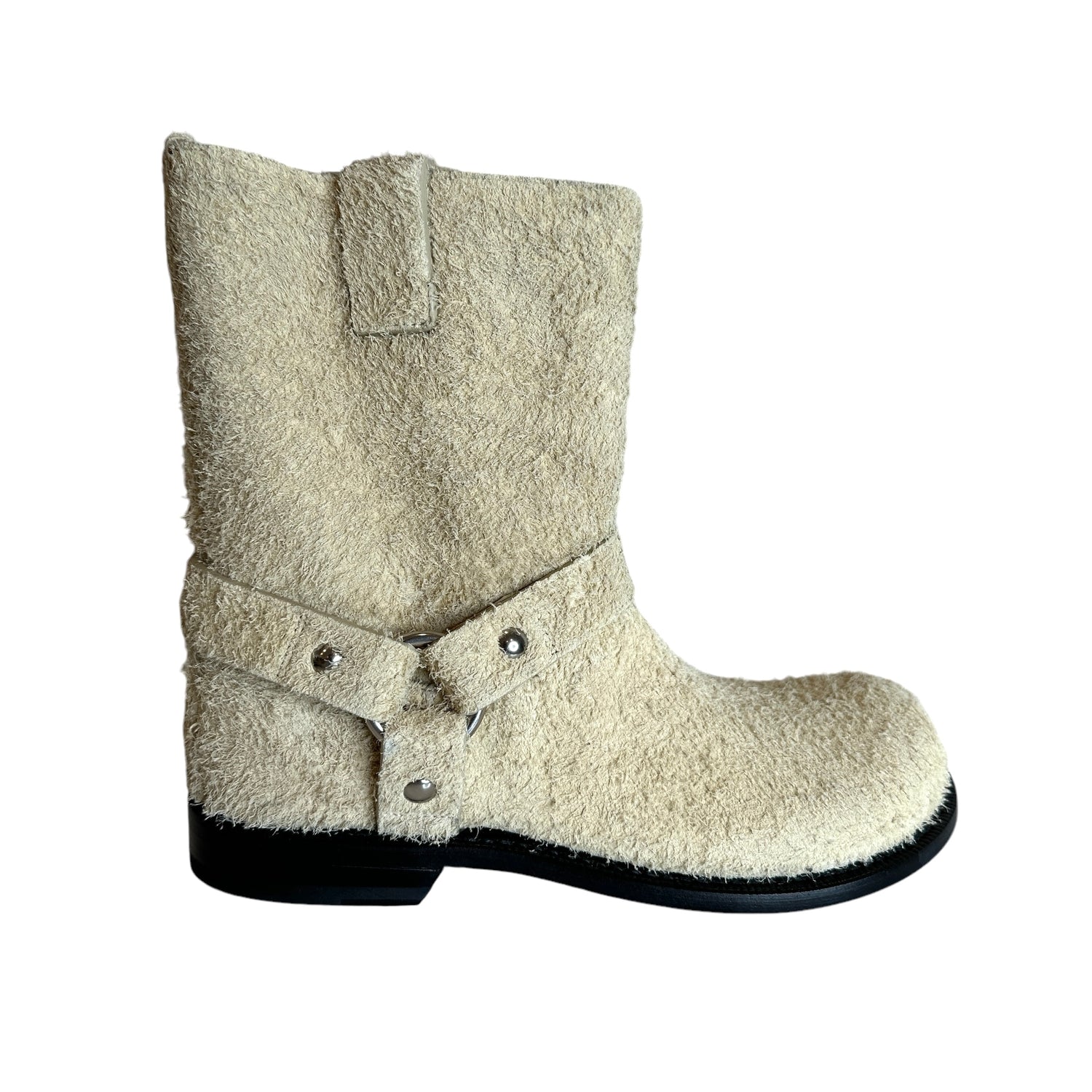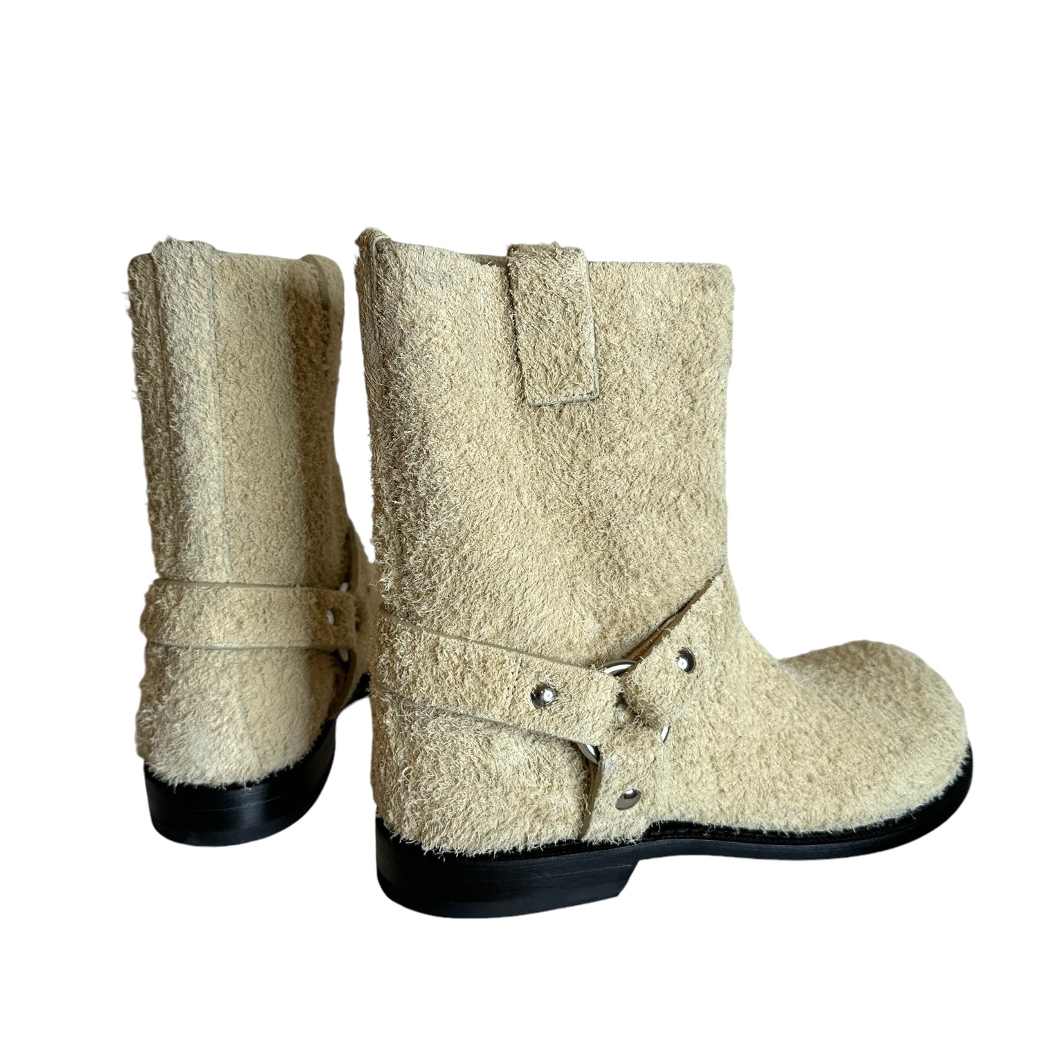 Loewe suede boots. Cream leather. Round toe. Slip-on boots. Silver buckle detail. Designer size 37.