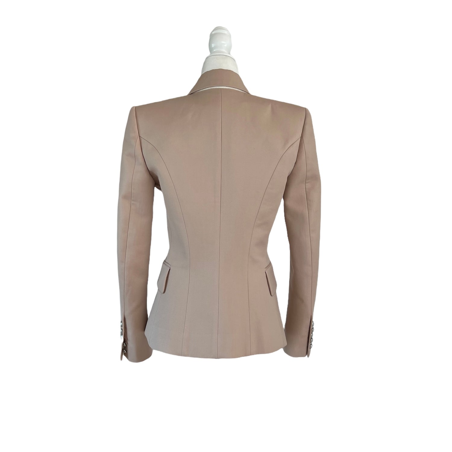 Beige color blazer from Balmain. Silver-tone button. Two side pockets. Pointed collar. Size 38.