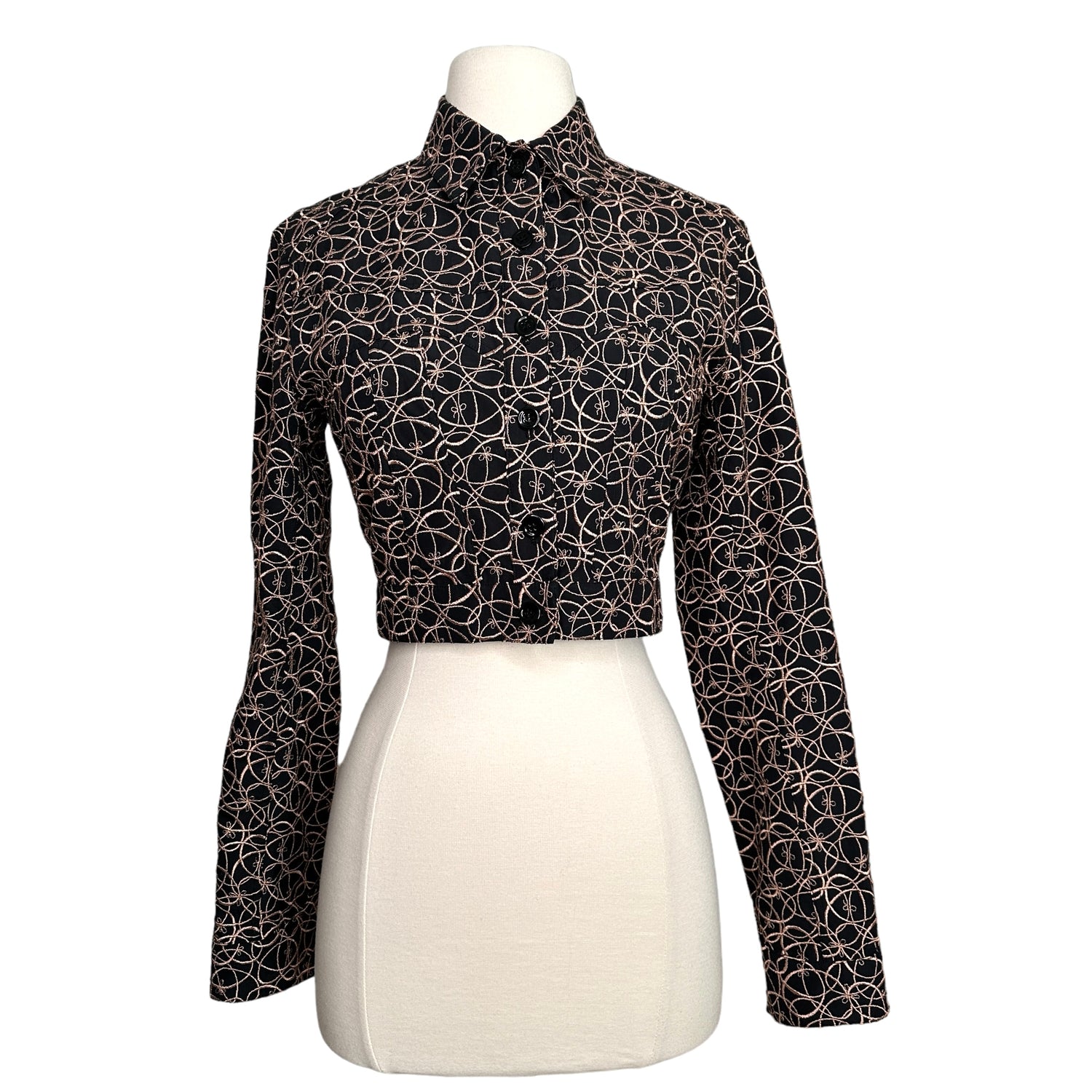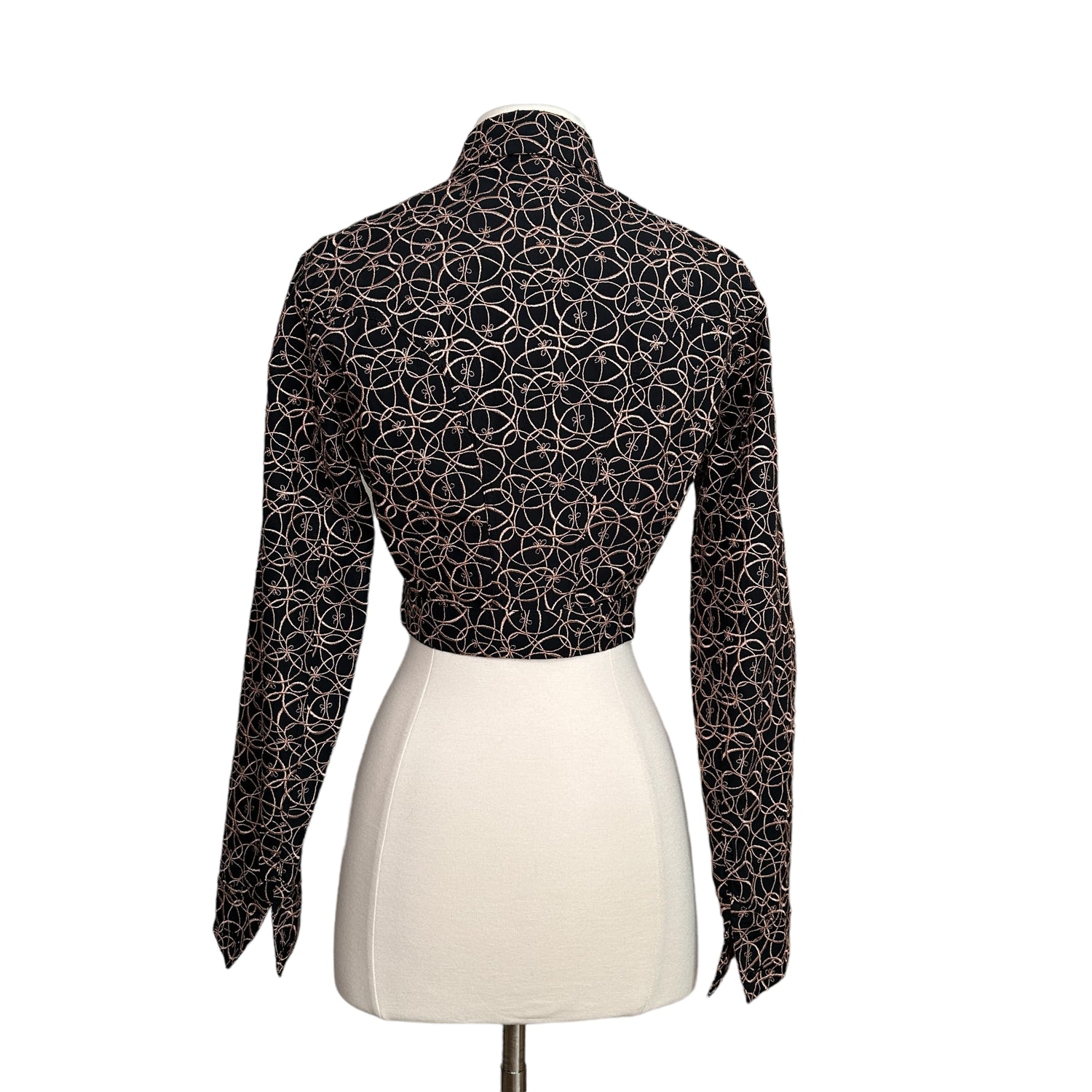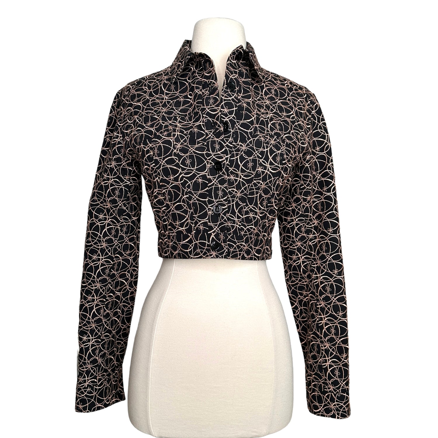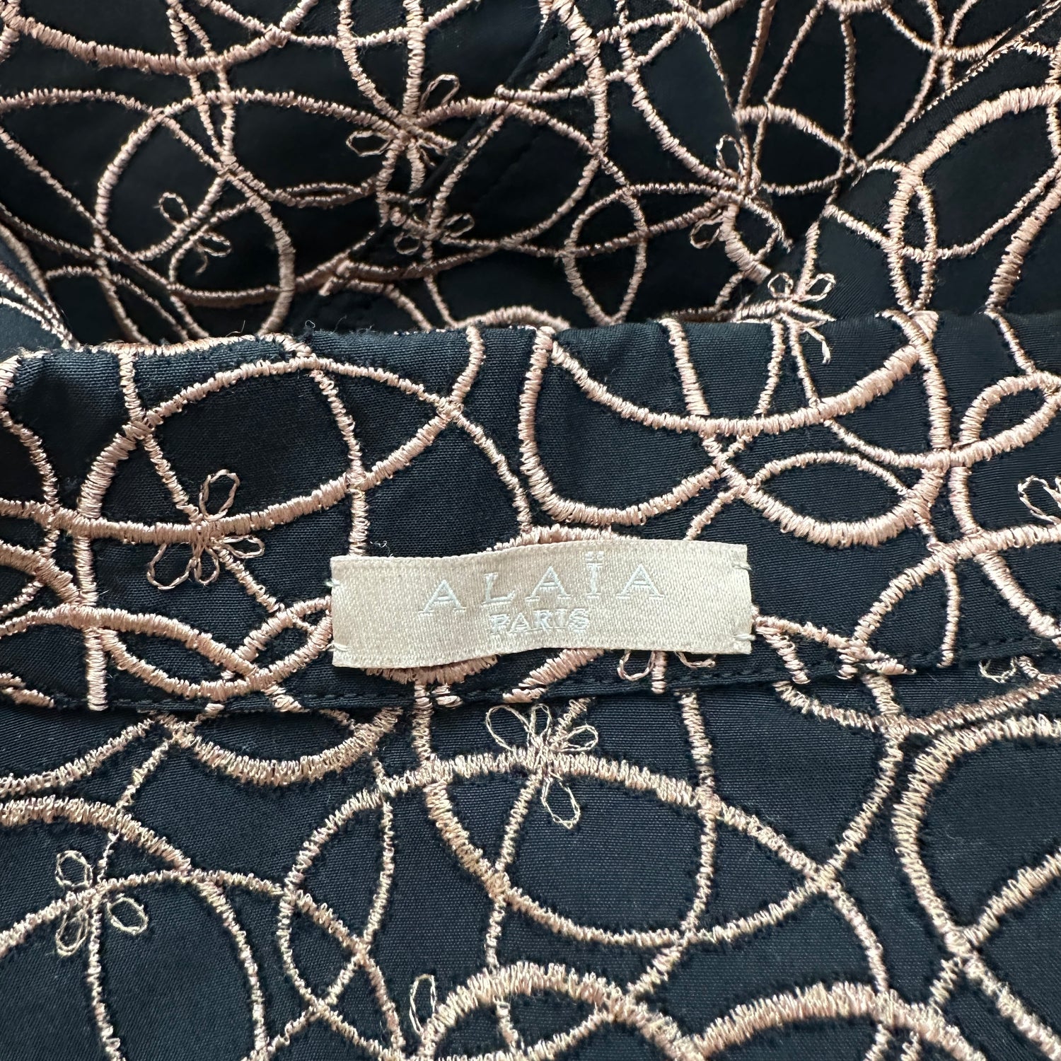 Alaia cropped jacket. Can be worn as a top or jacket. Embroidered in pink with eyelets. Pointed collar. Designer size 38.