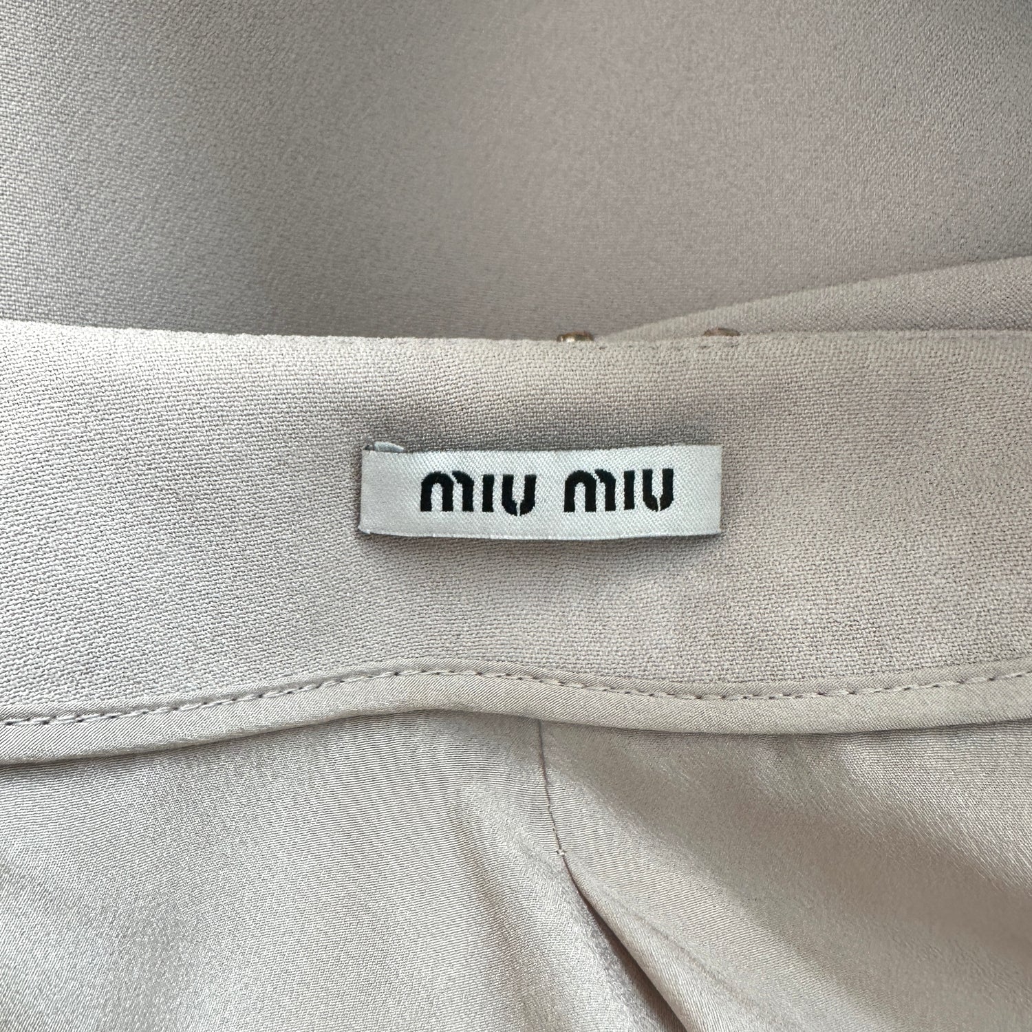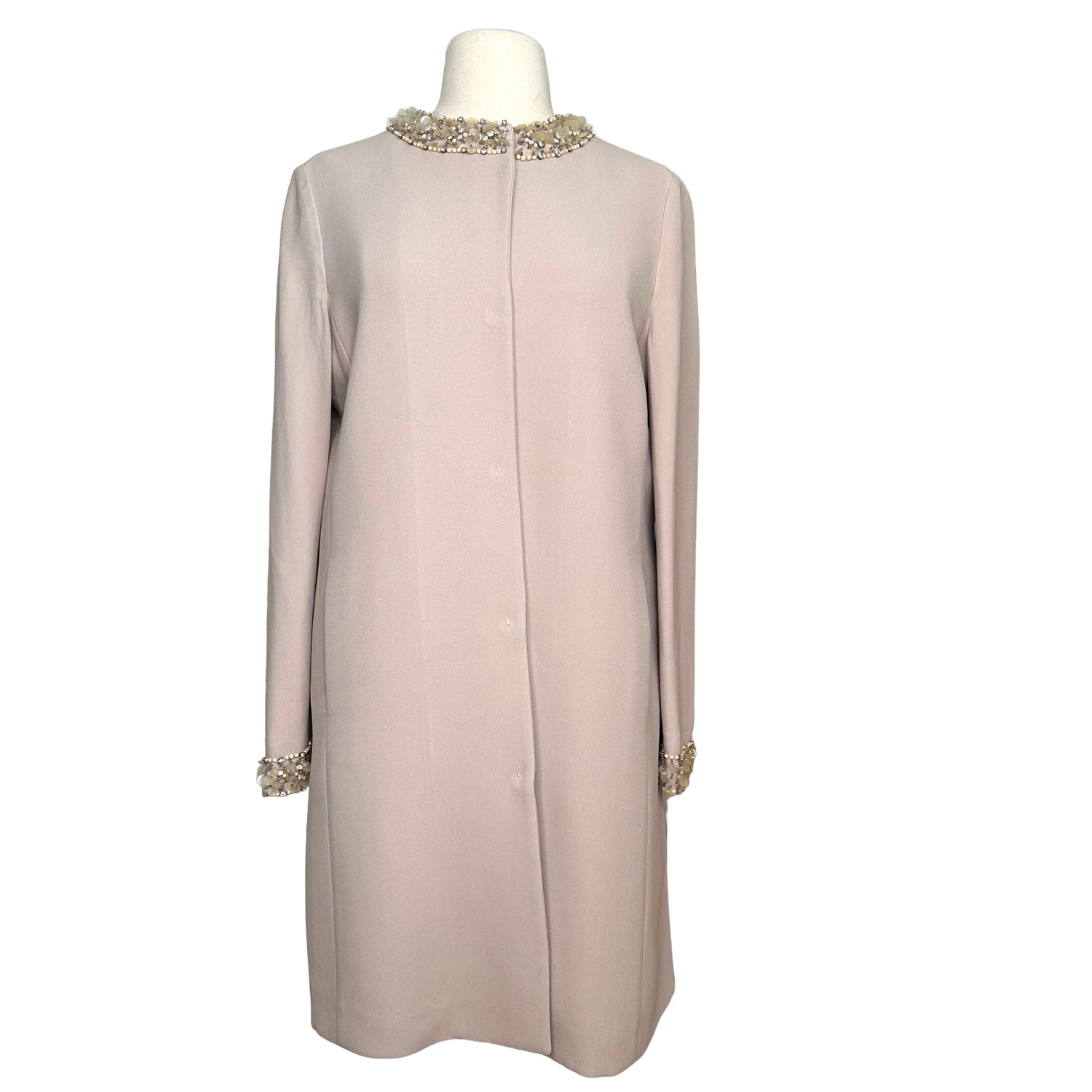 Miu Miu cream coat with crystal and beads embellishments. Round neck. Concealed buttons. Slit pockets. Concealed snap buttons closure at front. Designer size 42.