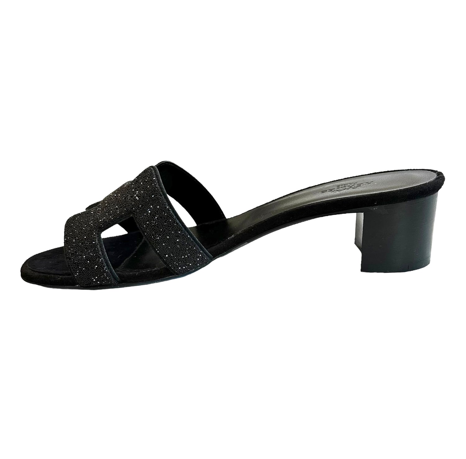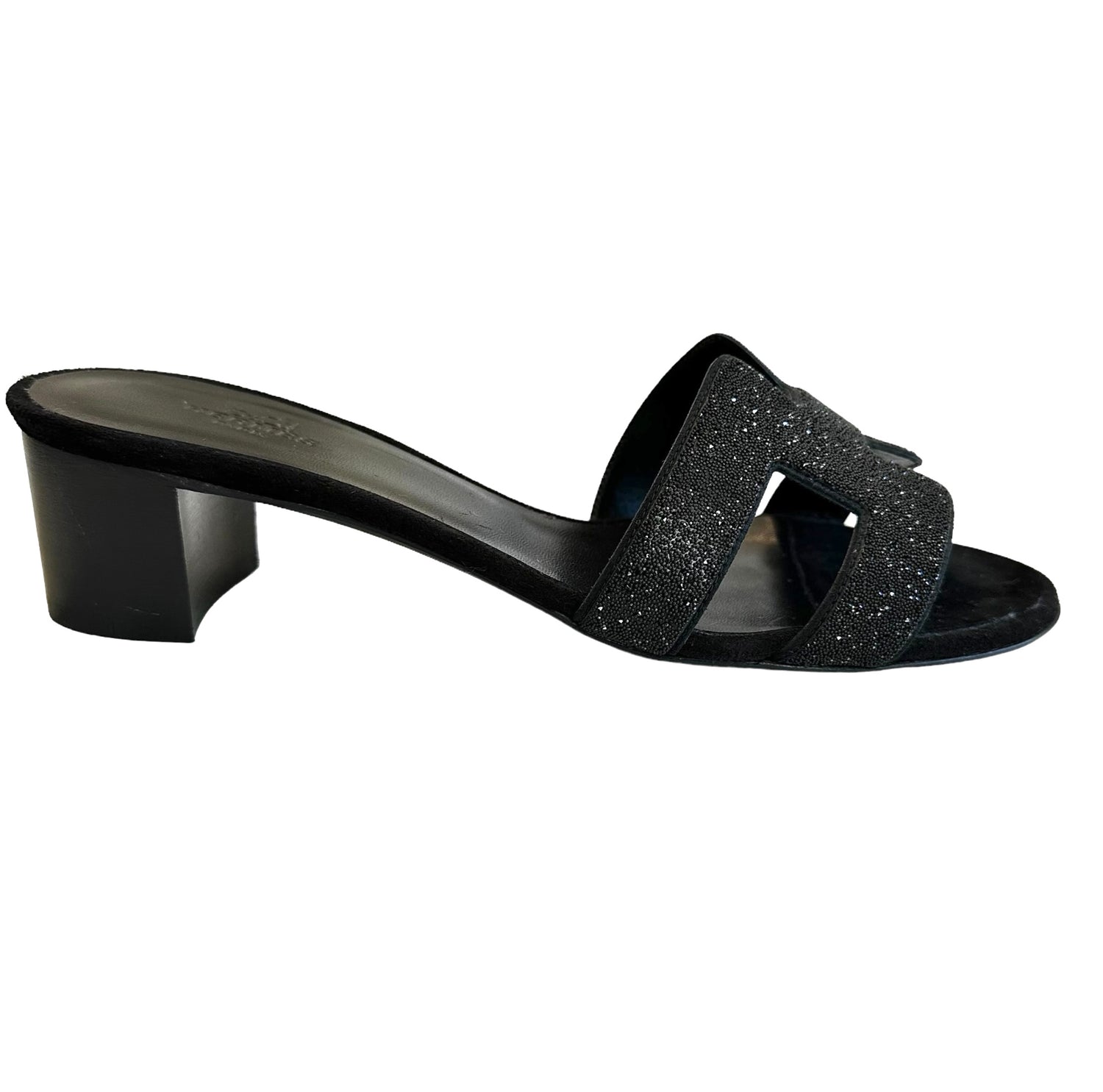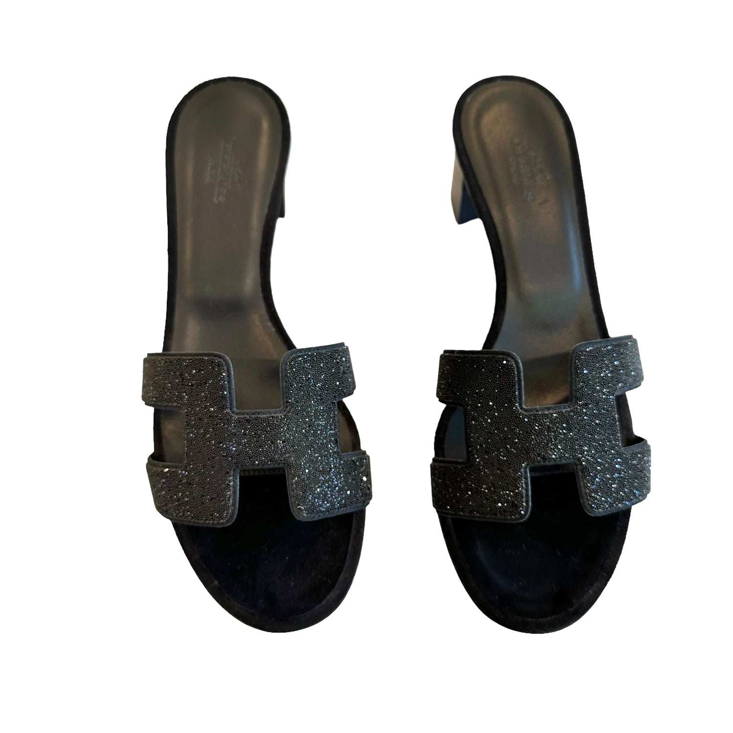 Hermes Oasis slides. Black leather and black crystal powder at top. Block heels and round toe. Leather inner soles. Designer size 36.5