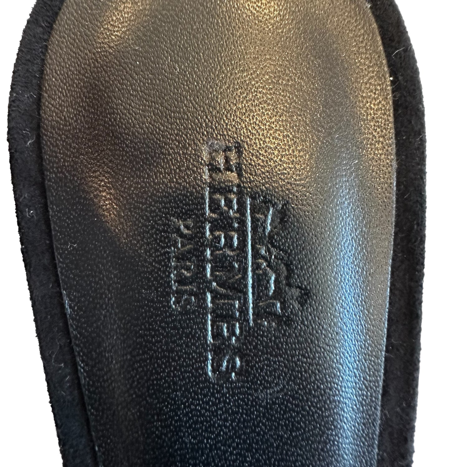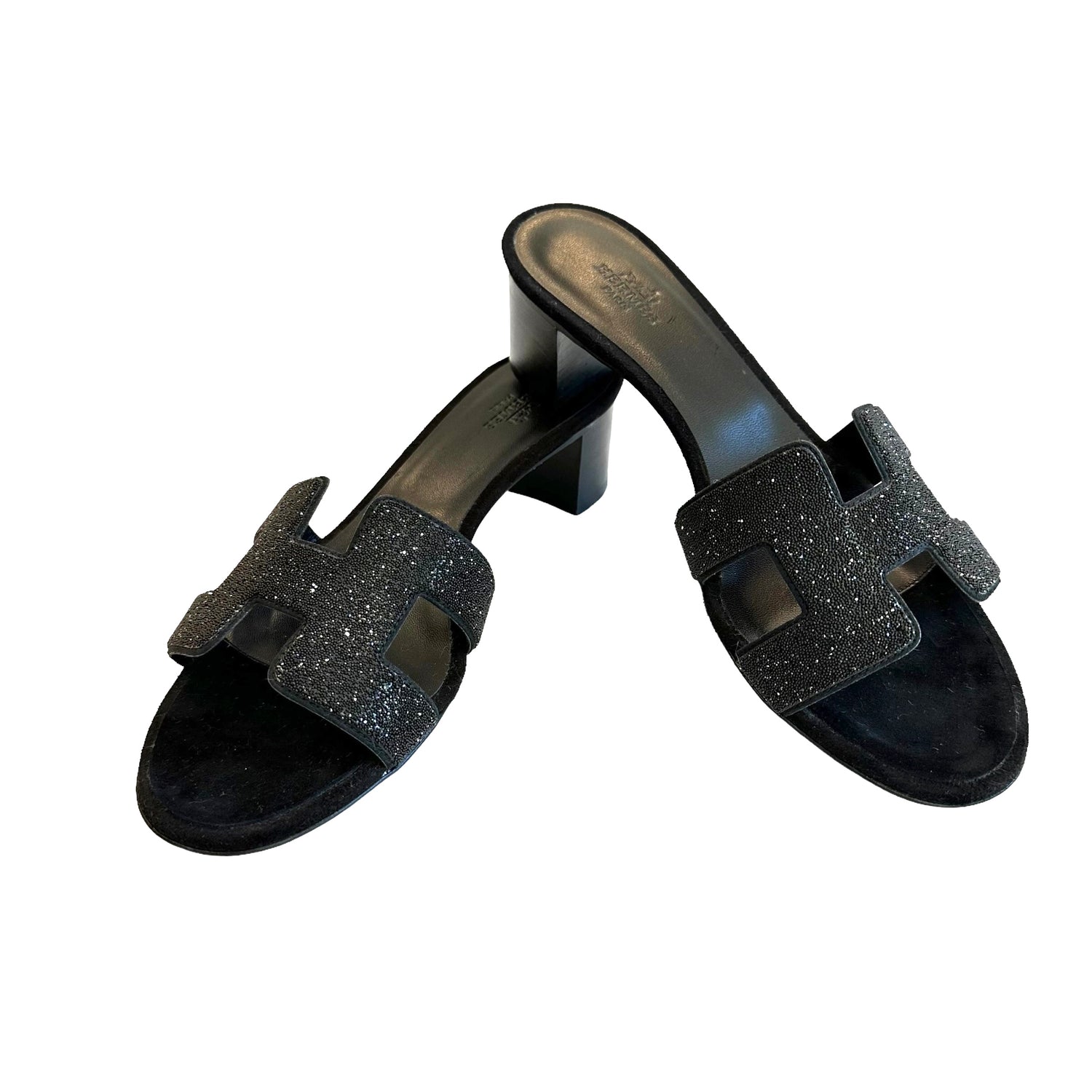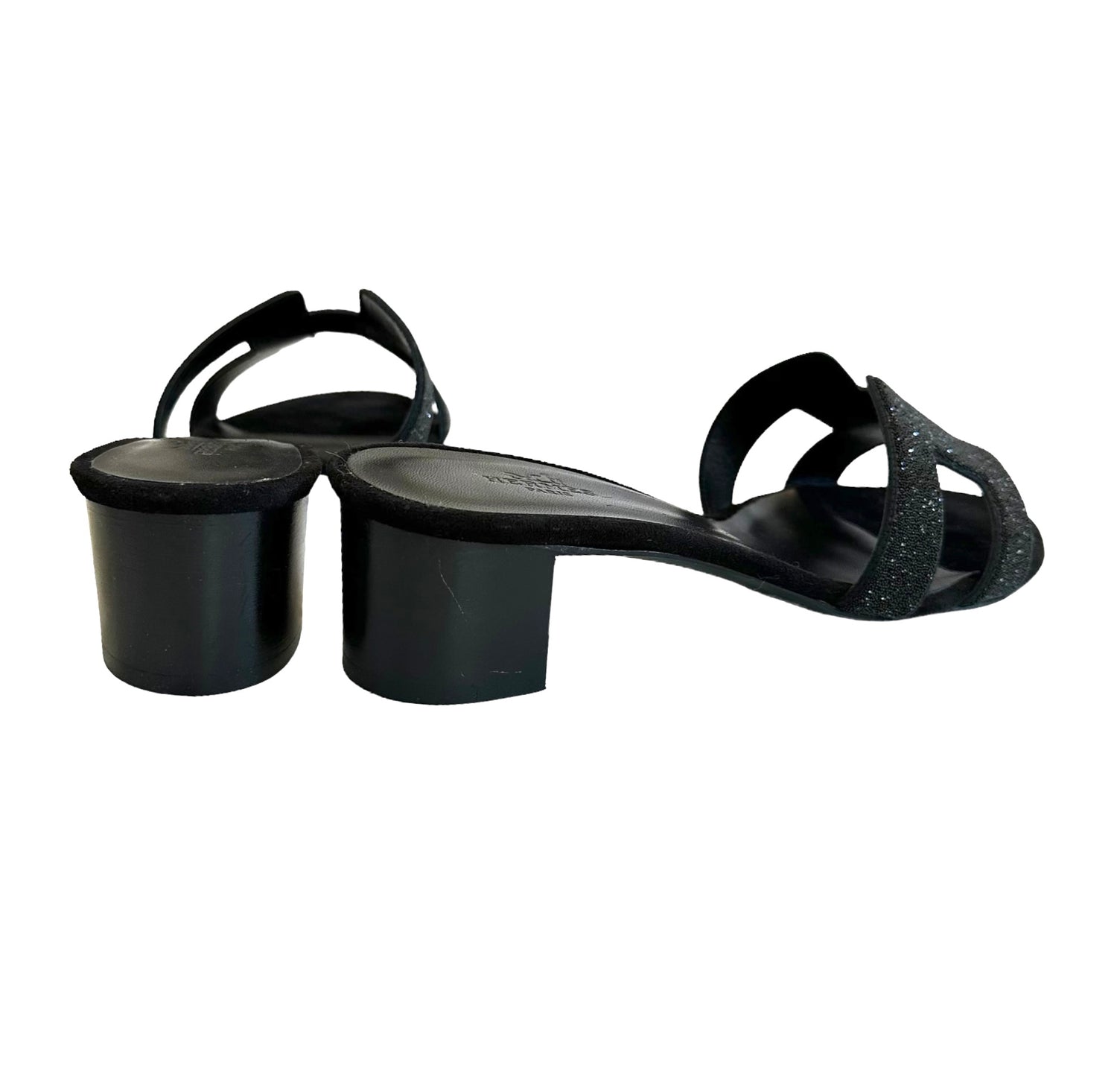 Hermes Oasis slides. Black leather and black crystal powder at top. Block heels and round toe. Leather inner soles. Designer size 36.5