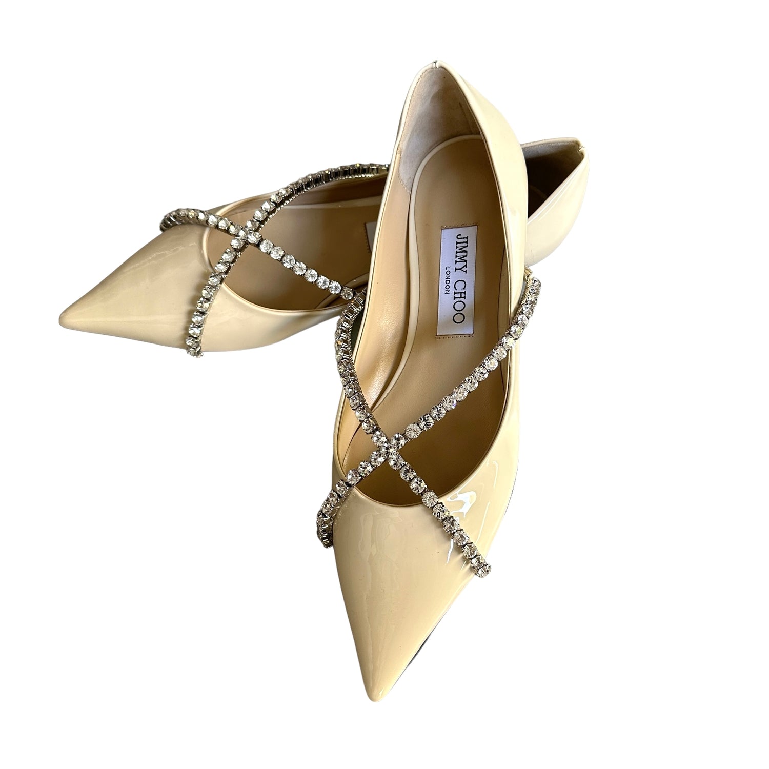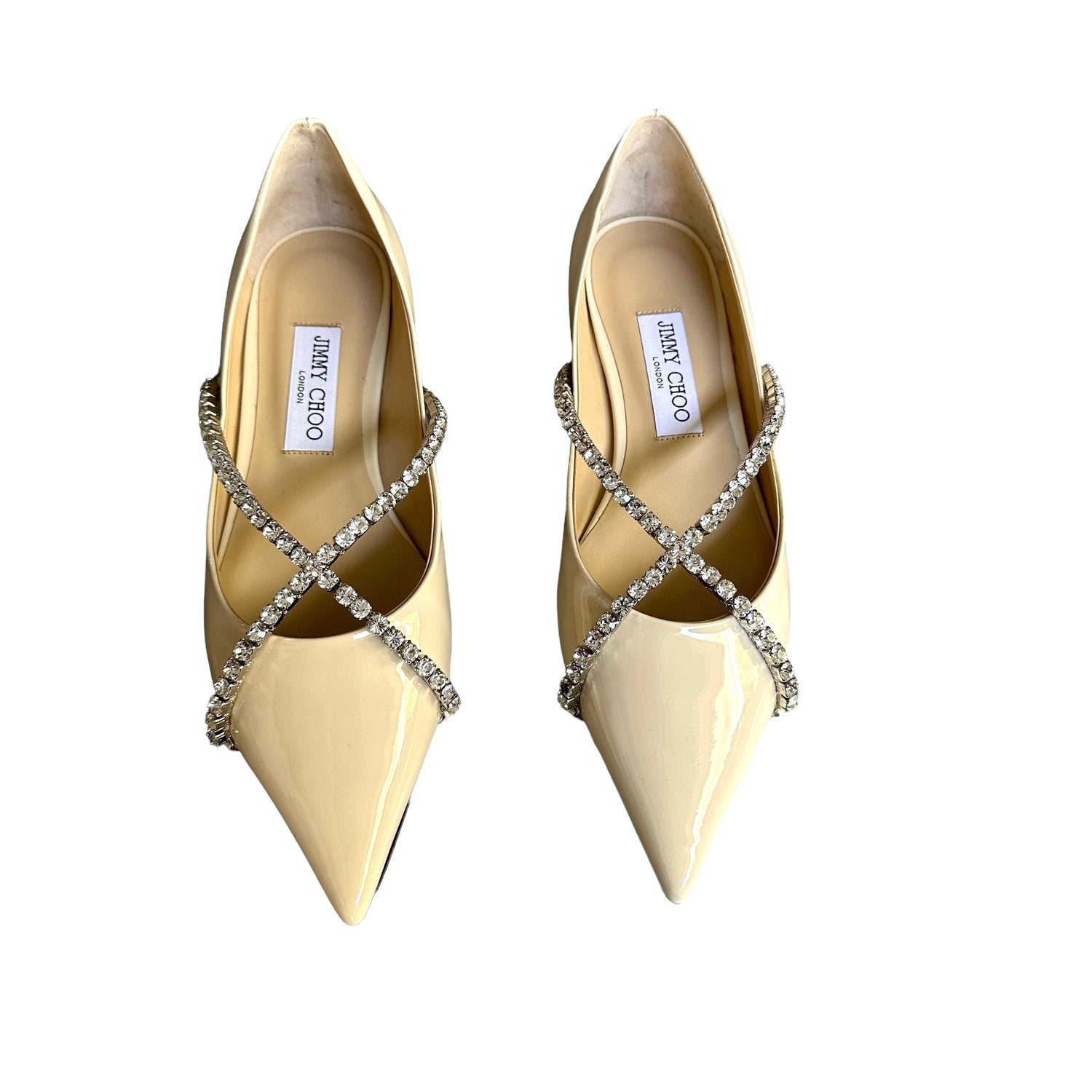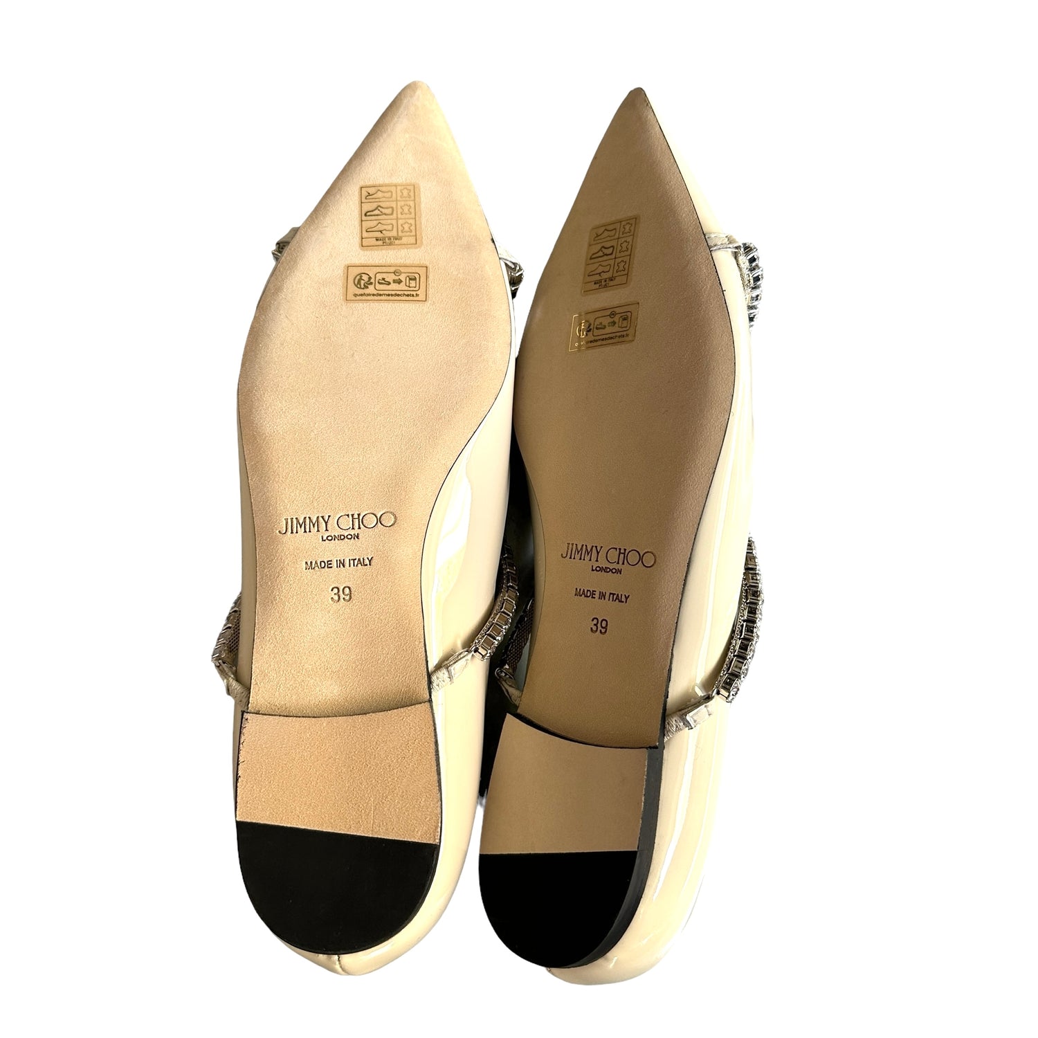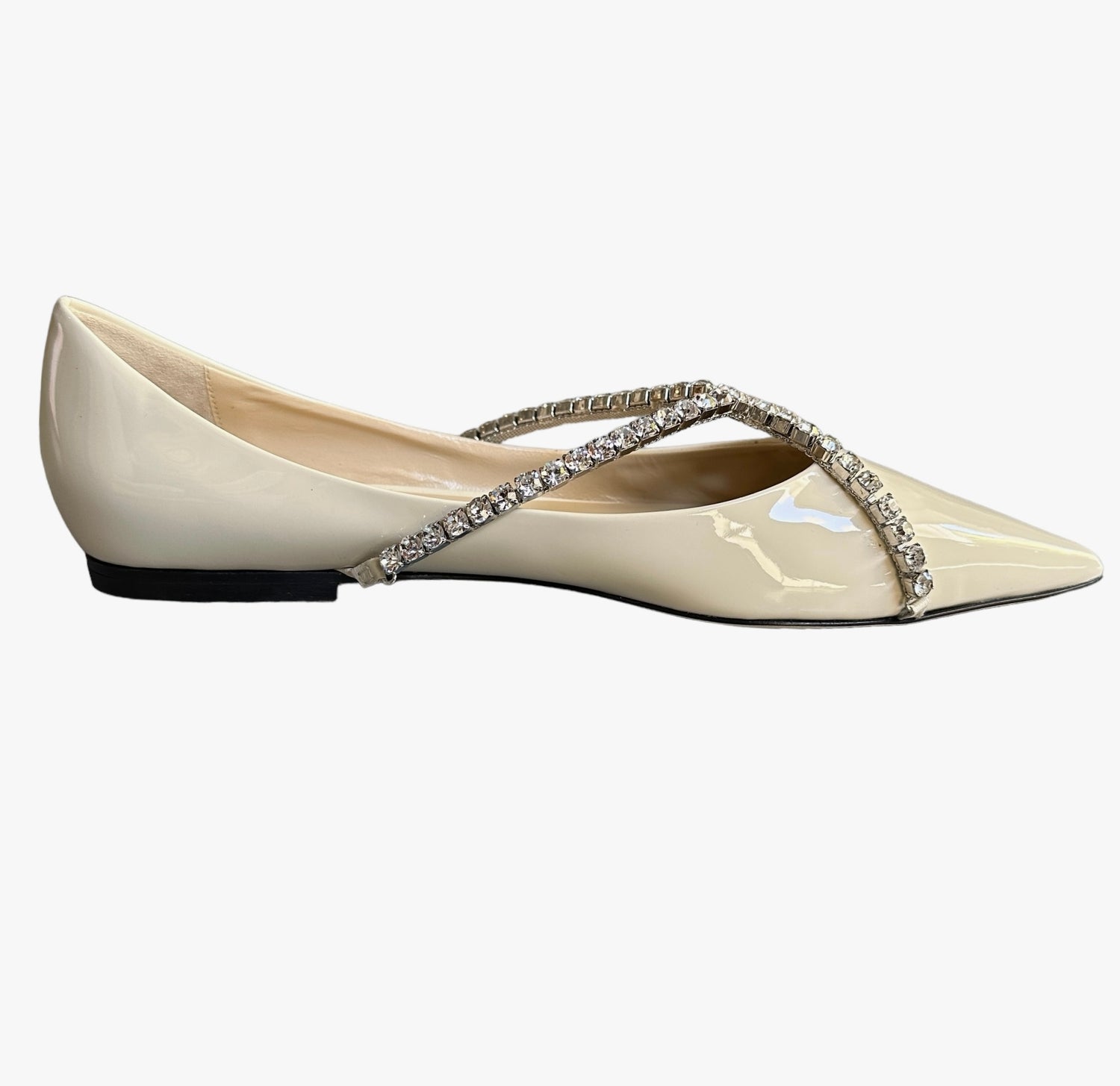 Jimmy Choo cream patent & crystal ballerina flats. Pointed toe. Designer size 39.