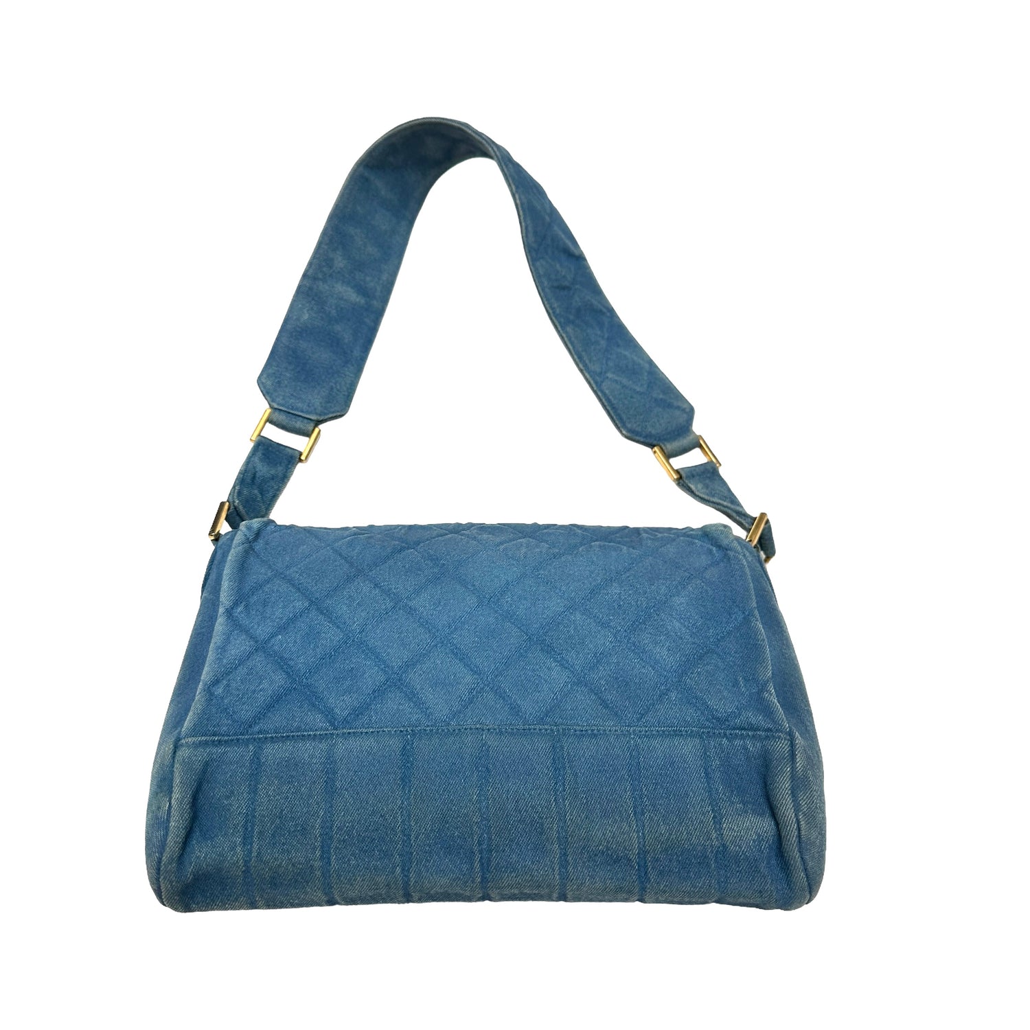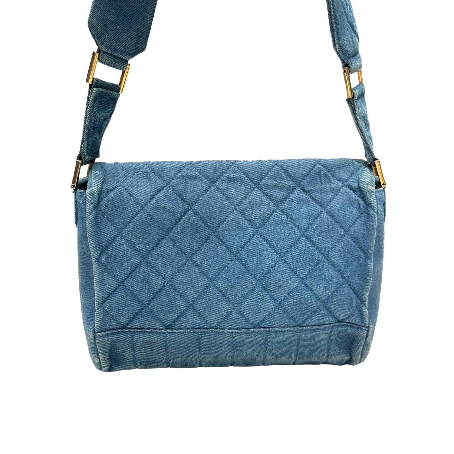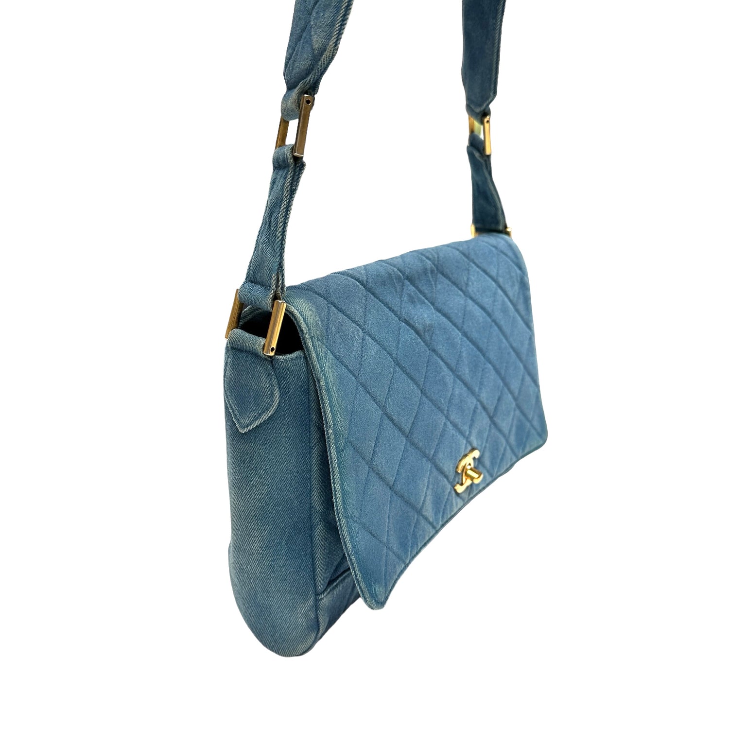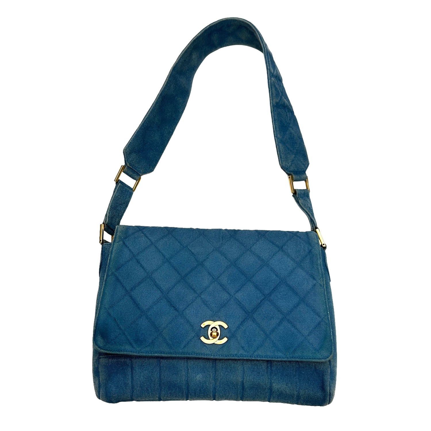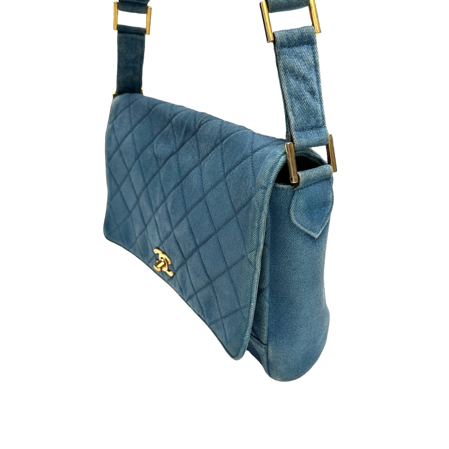 Chanel blue denim shoulder bag. Flap CC turn-lock closure at front. 24K gold. Diamond quilted denim jeans fabric throughout. Large flat shoulder strap. One inside zipper closure pocket. Black leather lining.