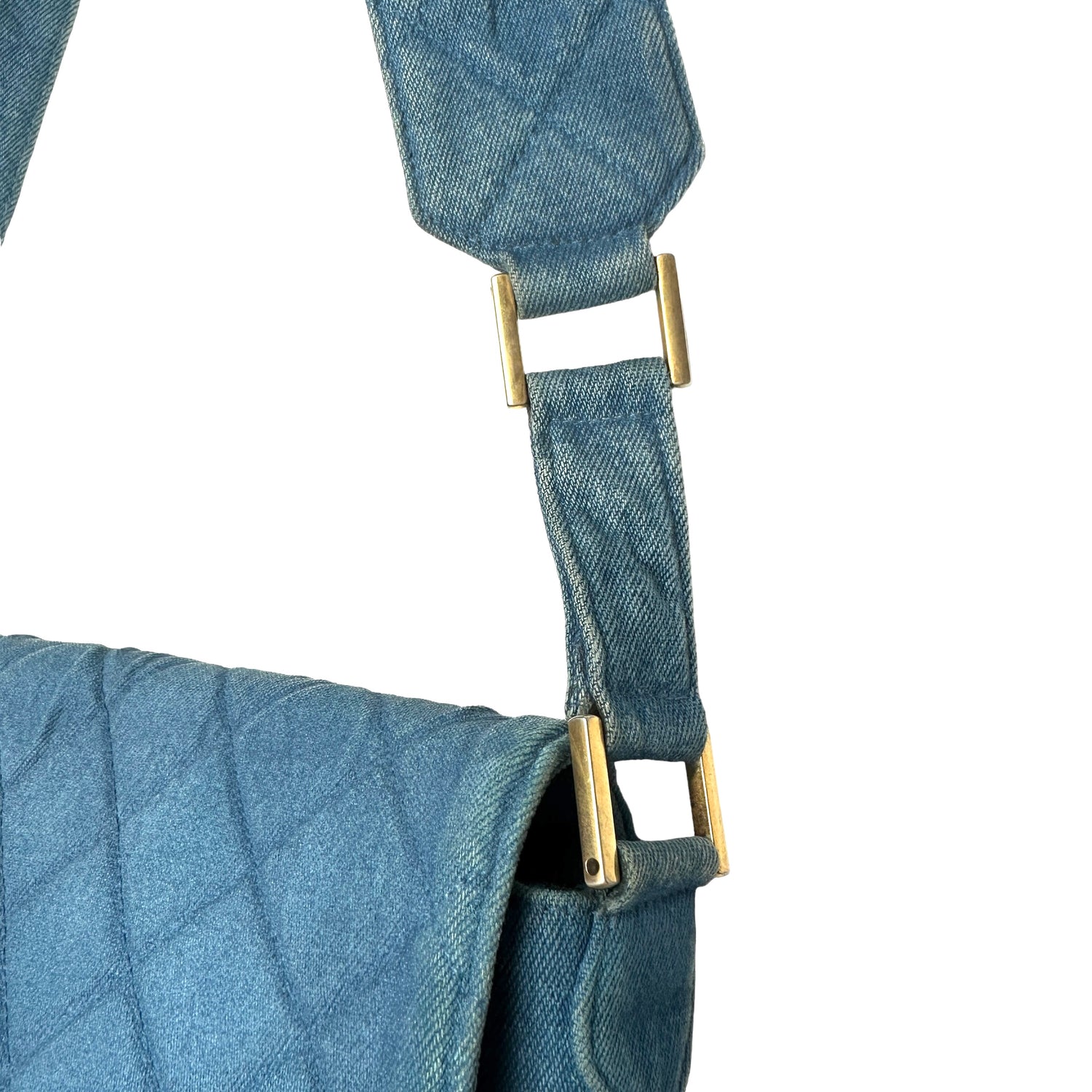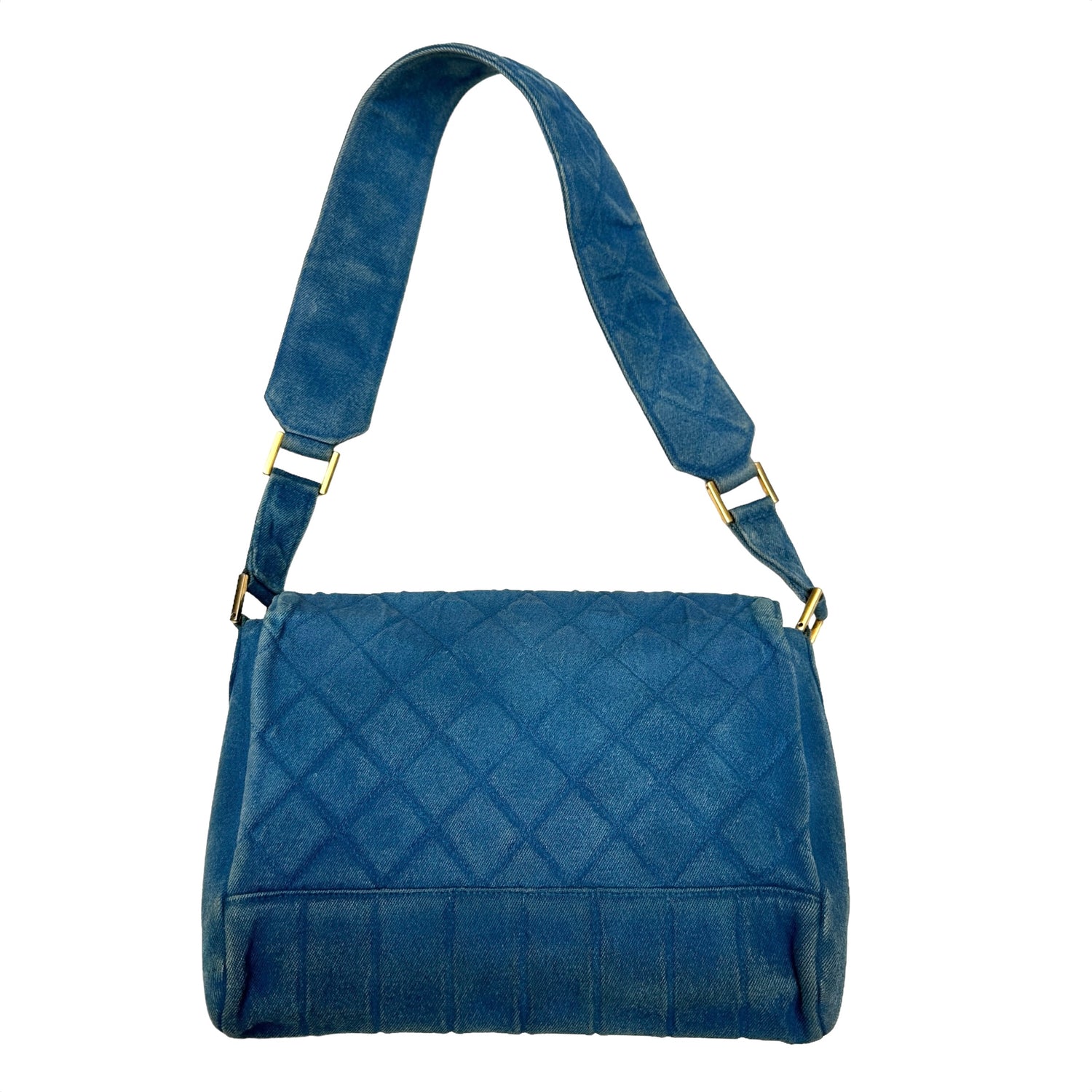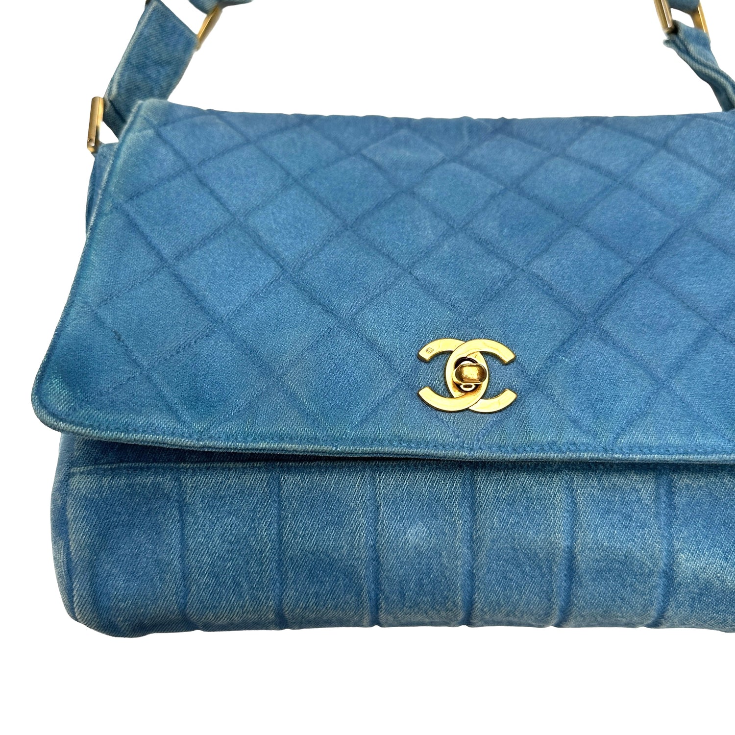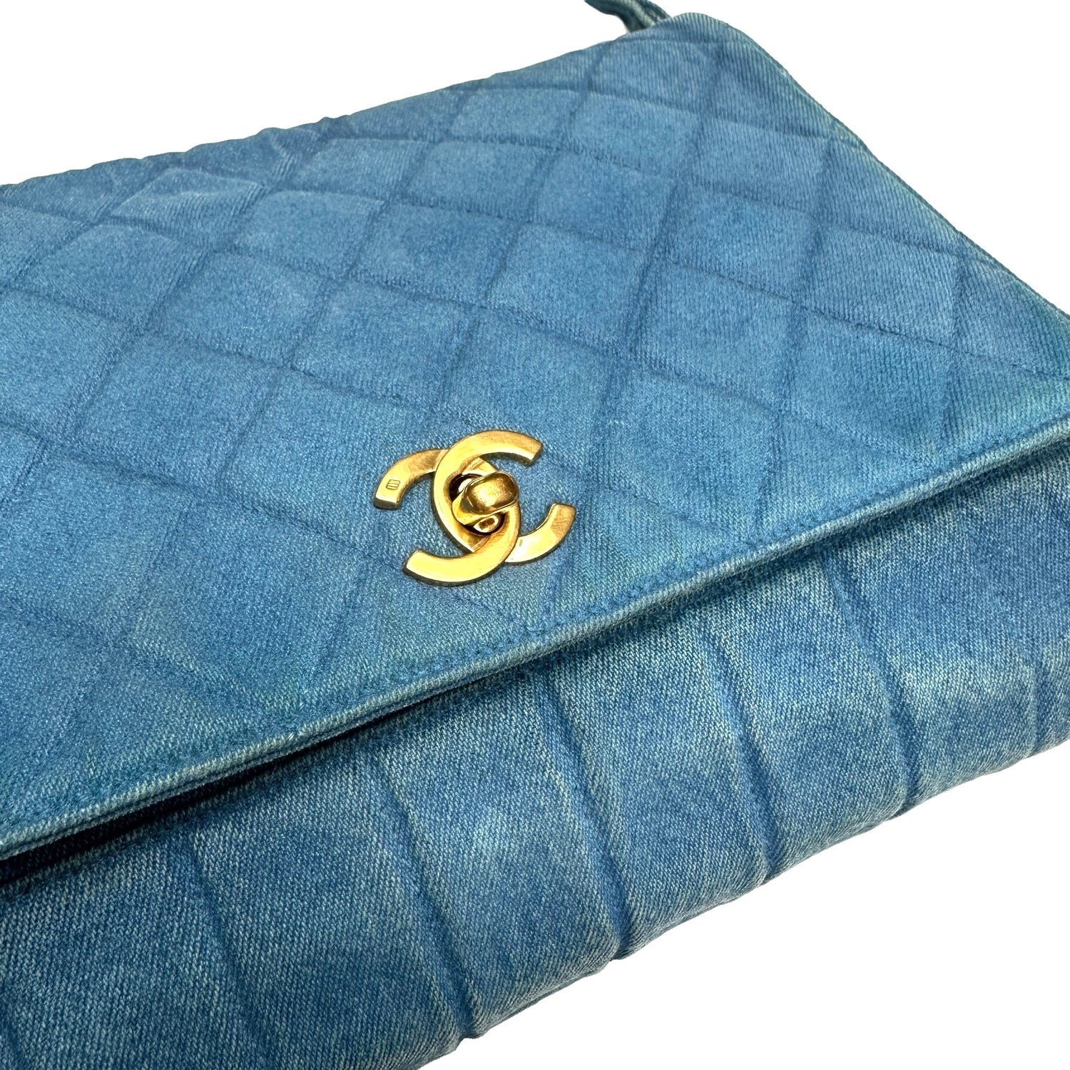Chanel blue denim shoulder bag. Flap CC turn-lock closure at front. 24K gold. Diamond quilted denim jeans fabric throughout. Large flat shoulder strap. One inside zipper closure pocket. Black leather lining.