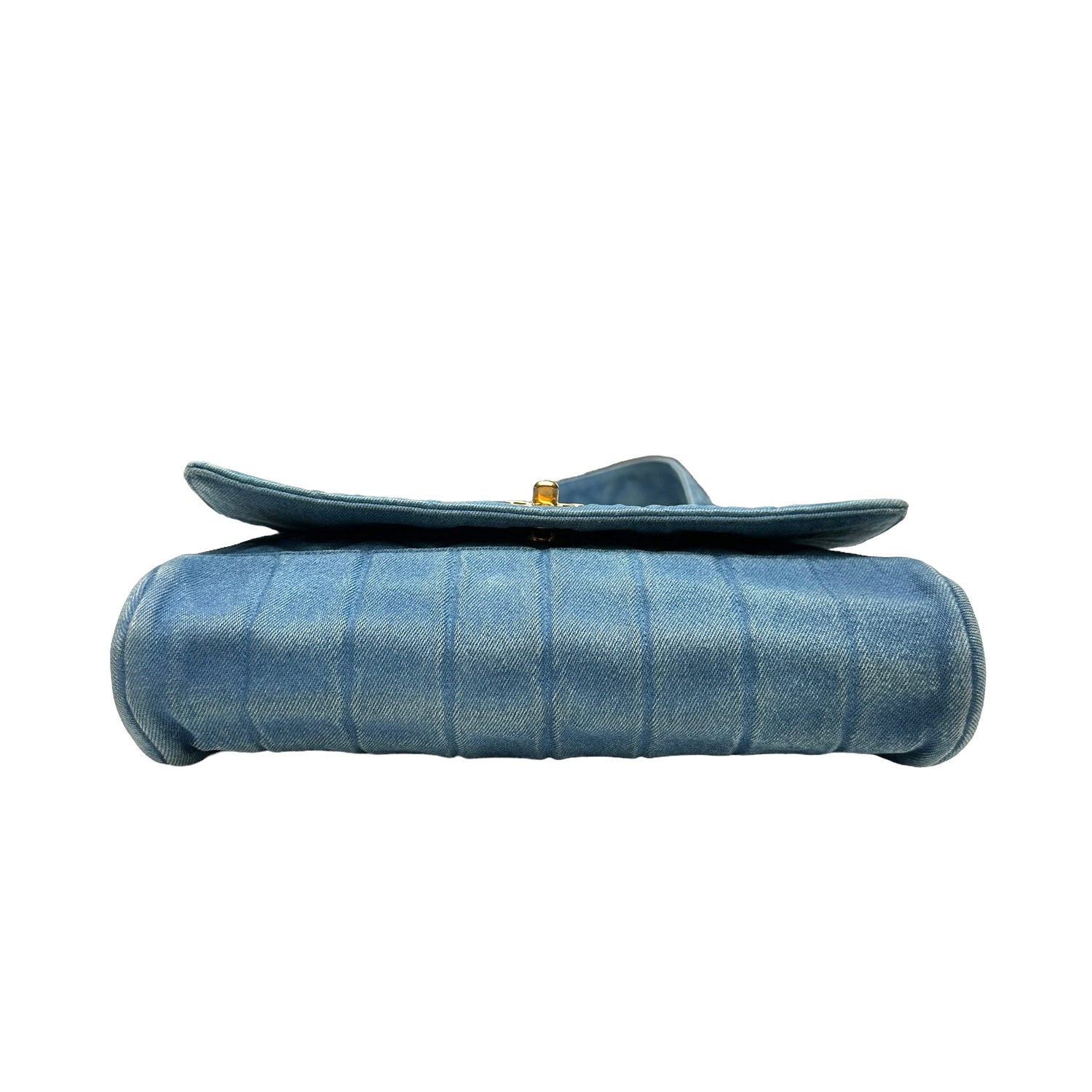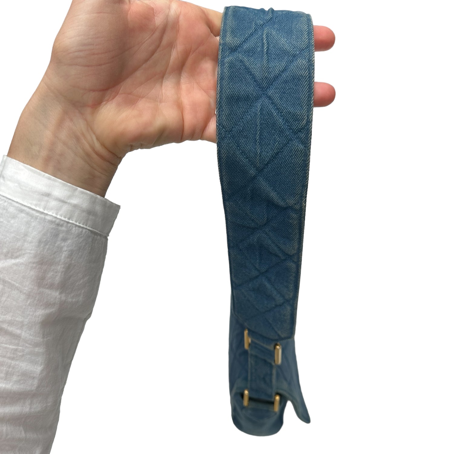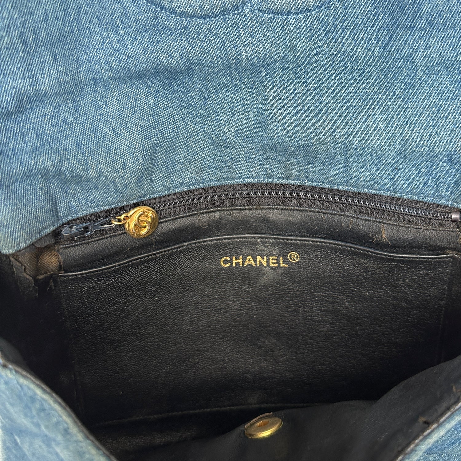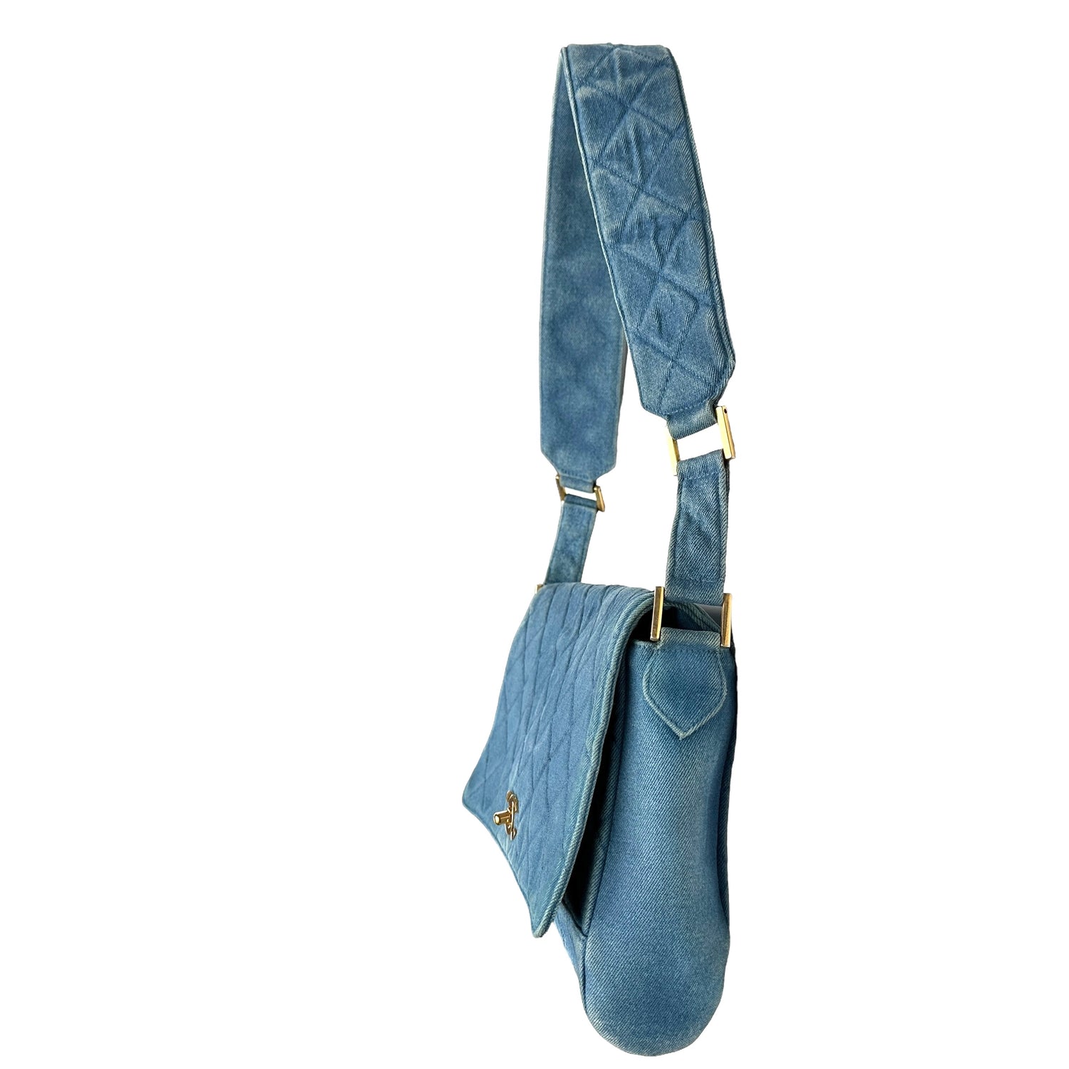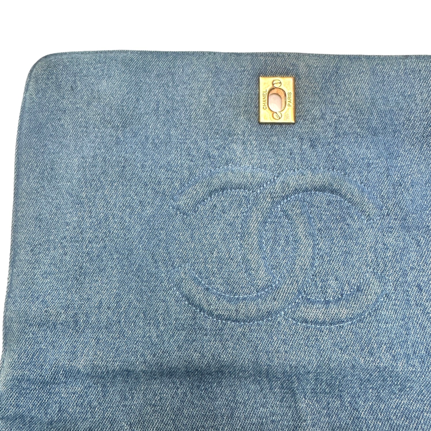 Chanel blue denim shoulder bag. Flap CC turn-lock closure at front. 24K gold. Diamond quilted denim jeans fabric throughout. Large flat shoulder strap. One inside zipper closure pocket. Black leather lining.