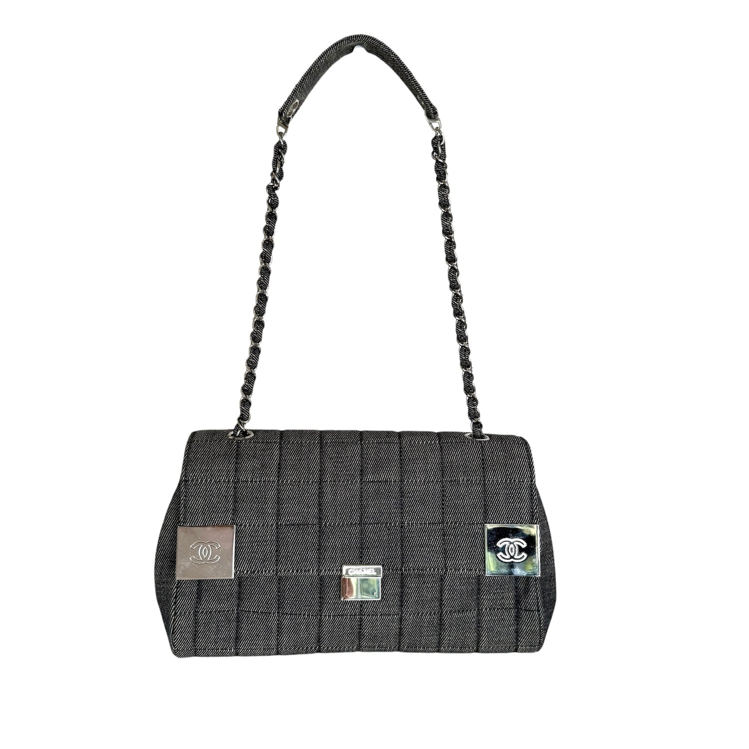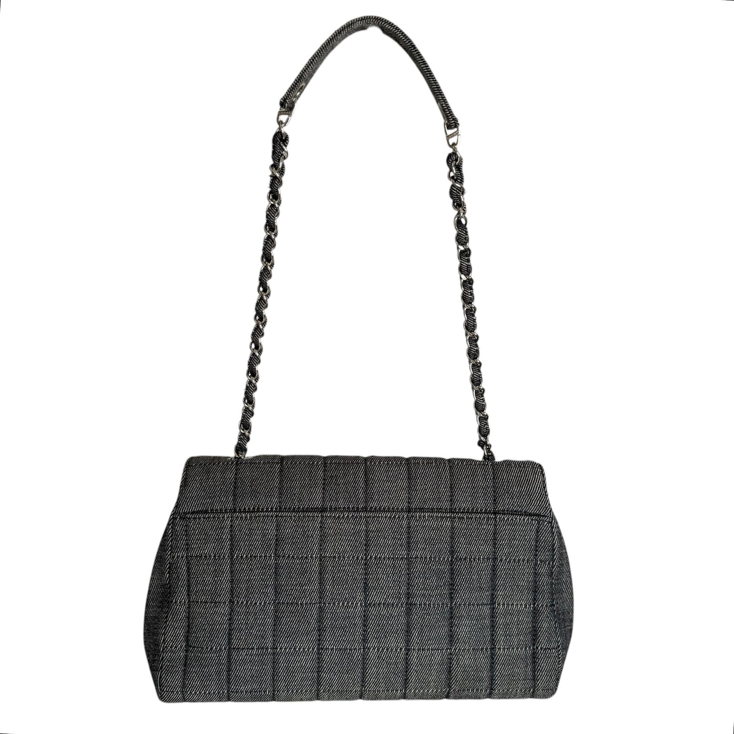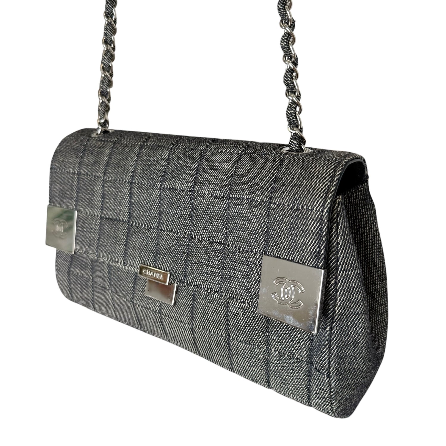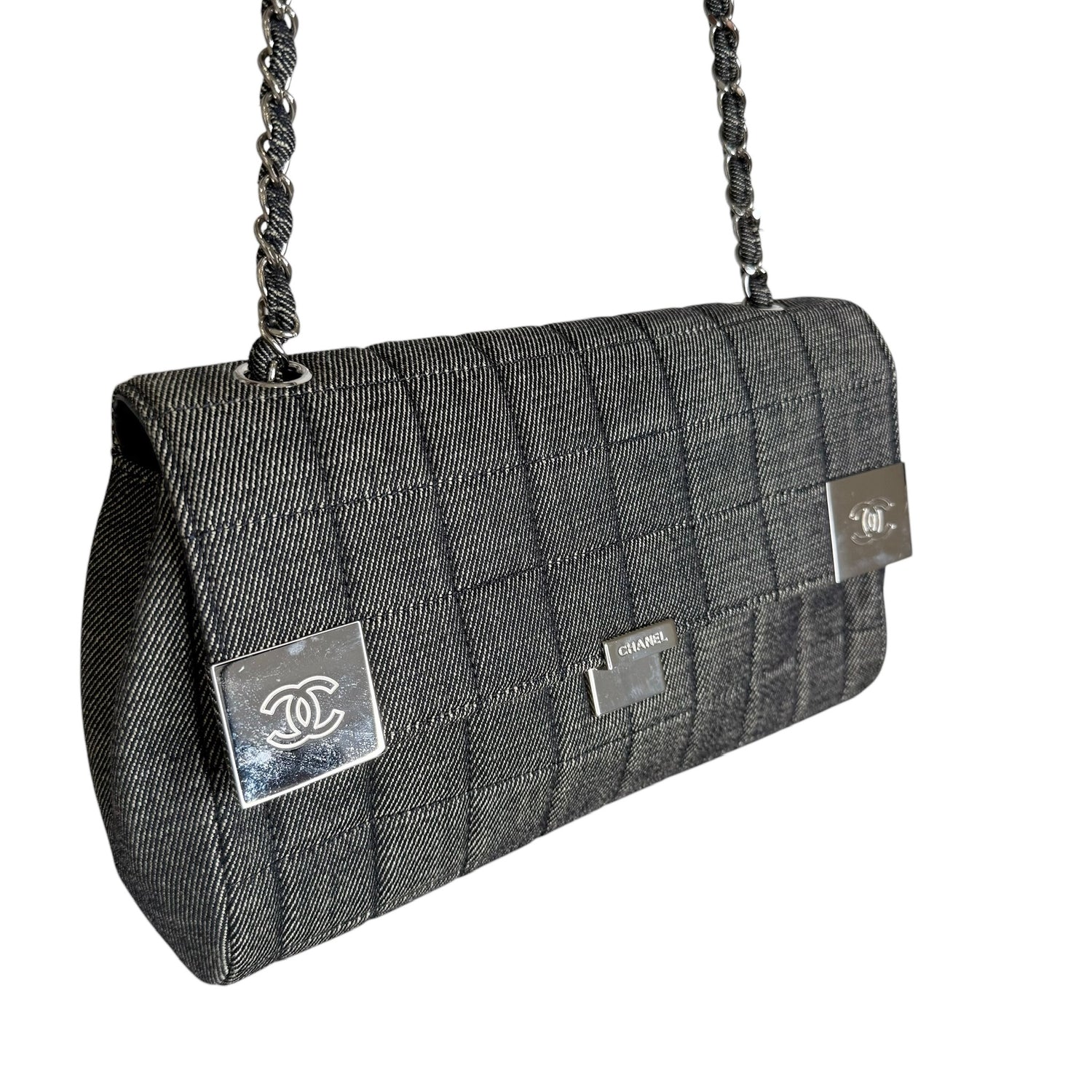Chanel denim chocolate barre bag. Silver-tone hardware and logo plates. Denim and metal chain strap. Navy lambskin leather lining. One interior pocket.