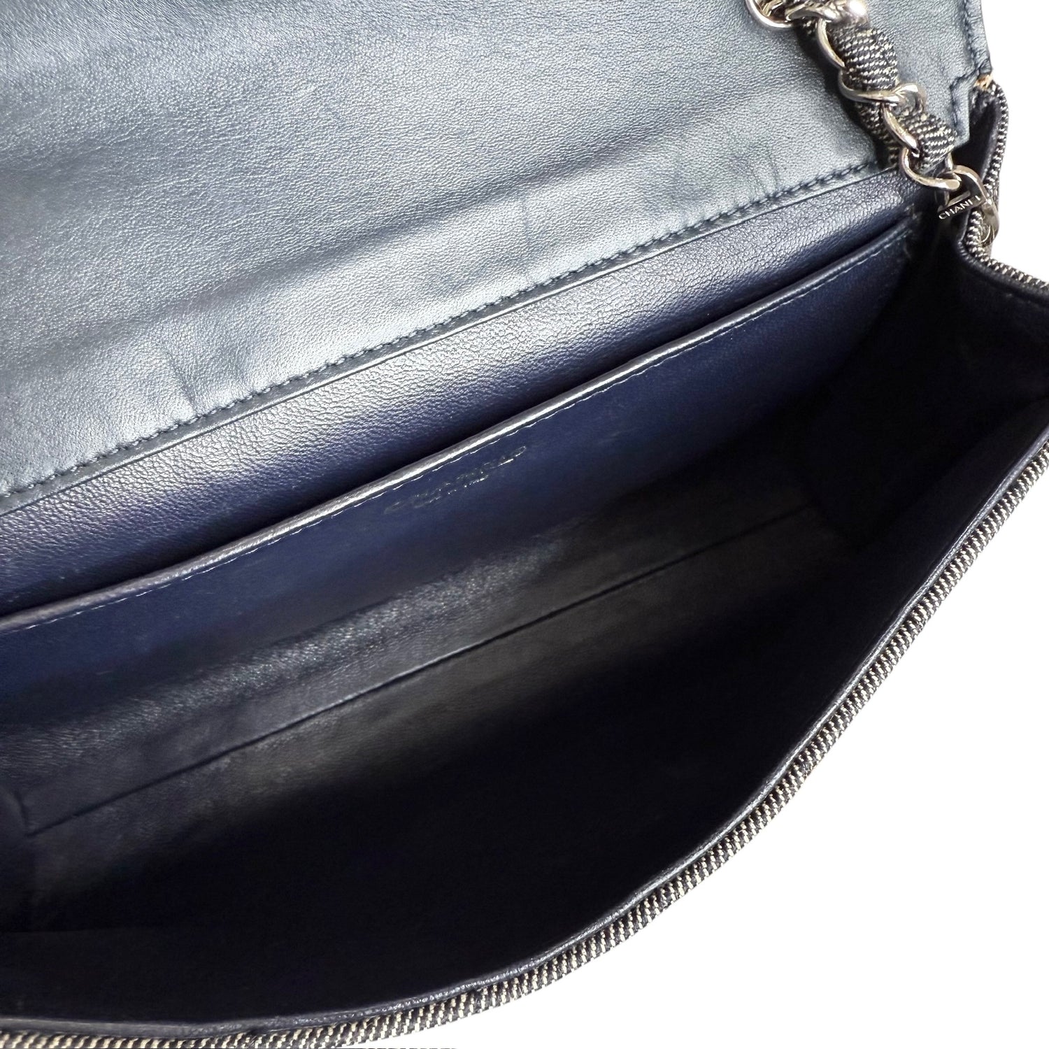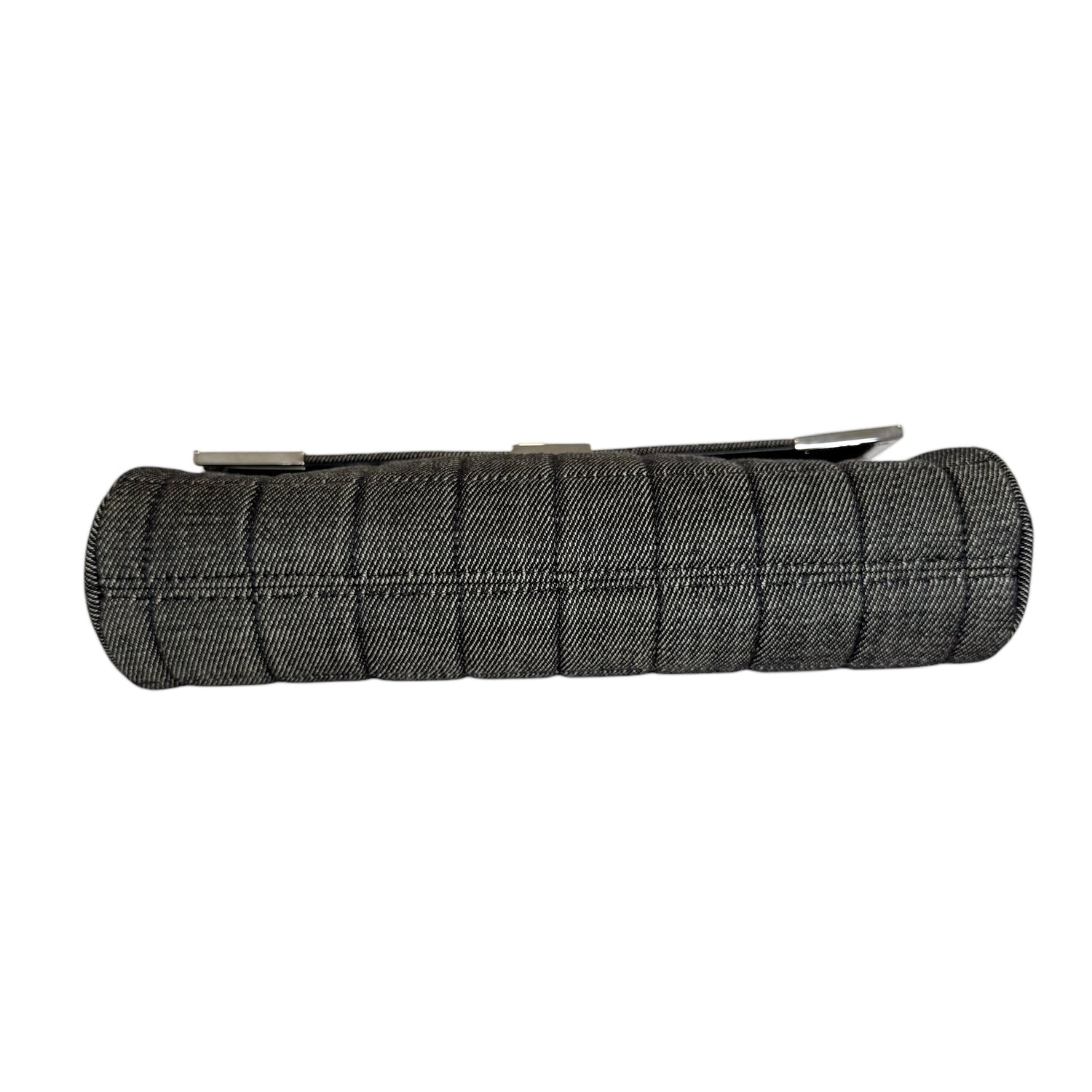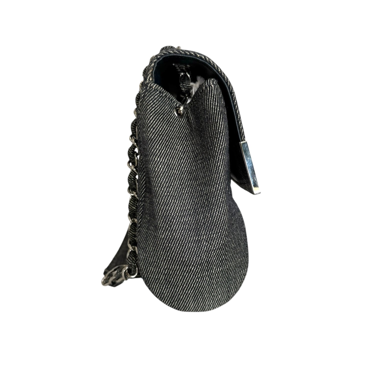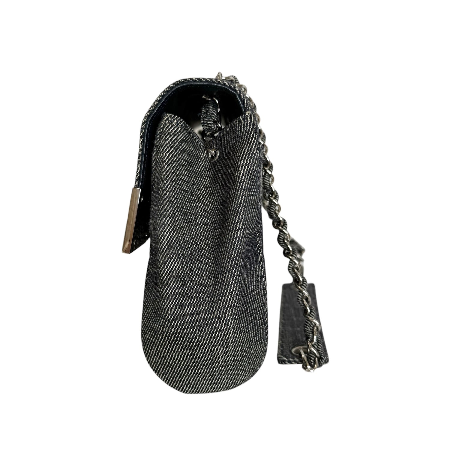 Chanel denim chocolate barre bag. Silver-tone hardware and logo plates. Denim and metal chain strap. Navy lambskin leather lining. One interior pocket.