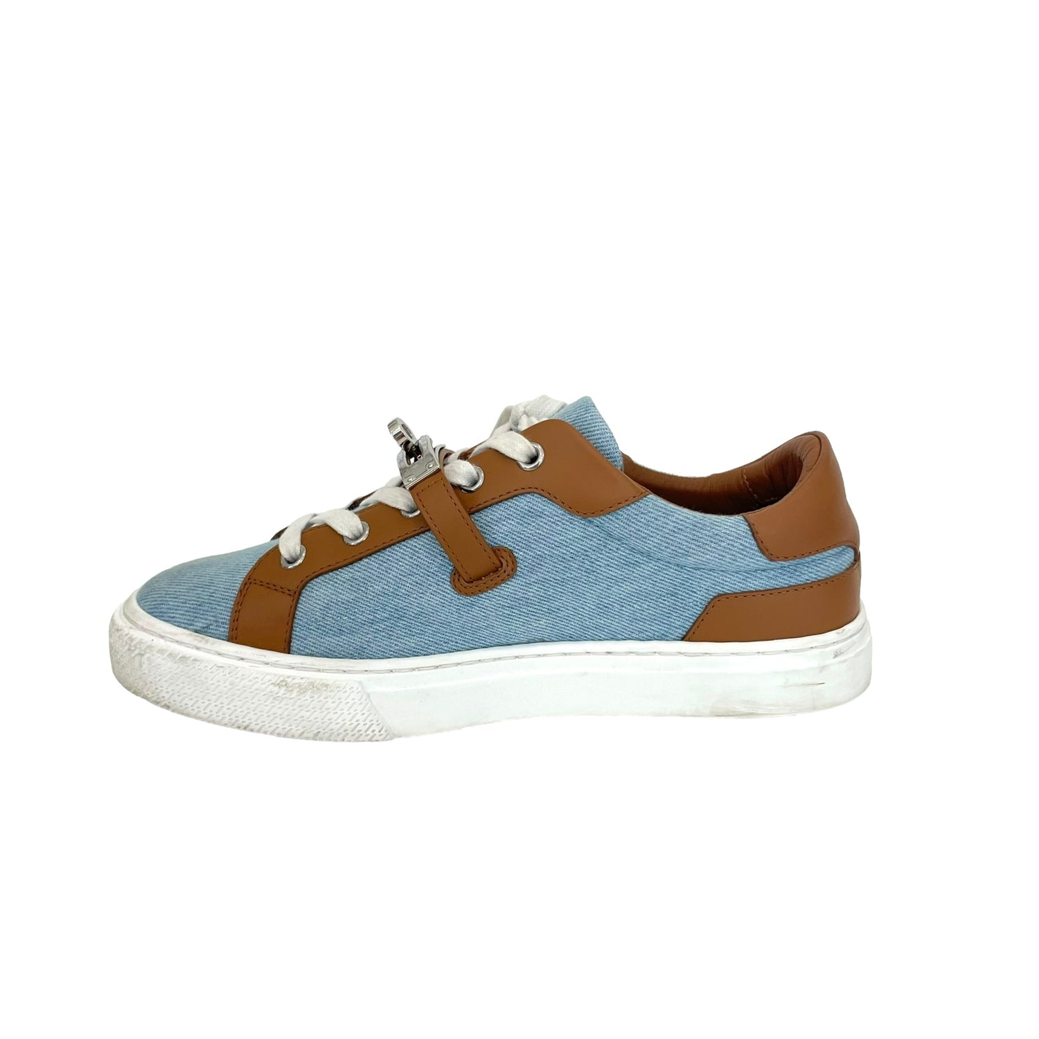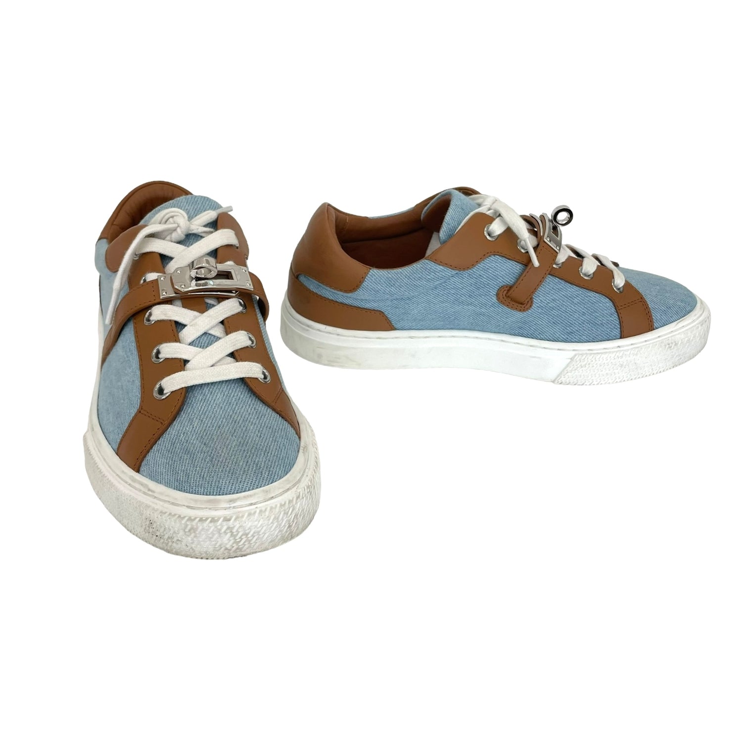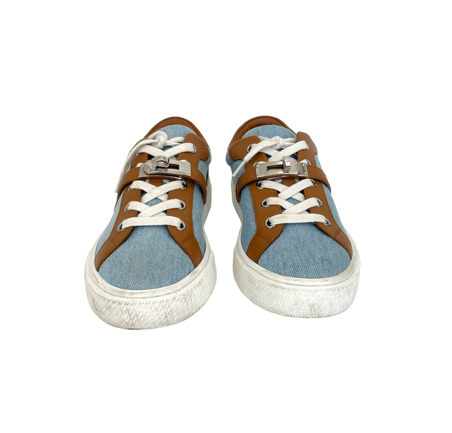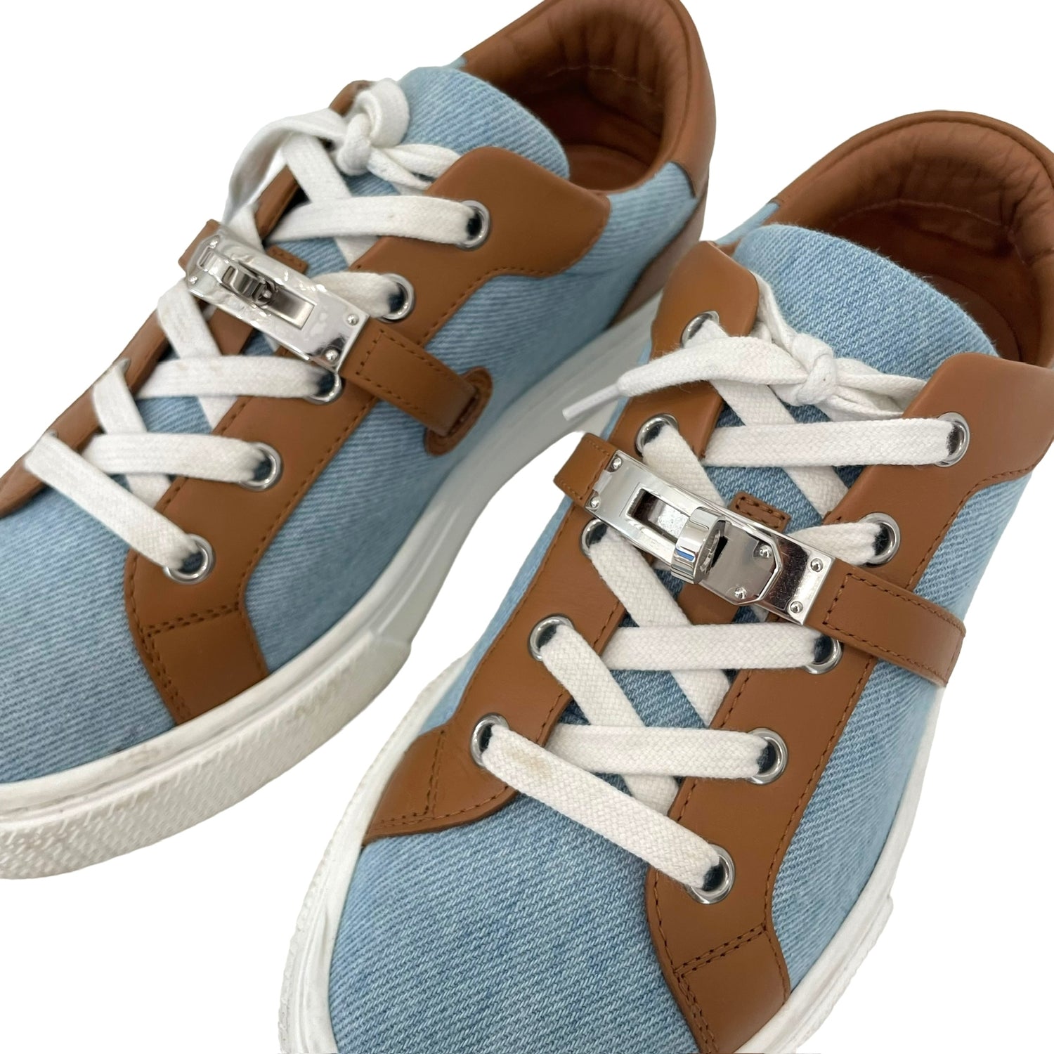 Hermes Day Sneakers. Denim canvas and gold leather. Palladium Kelly turn lock on top. Designer size 37 (true to size).