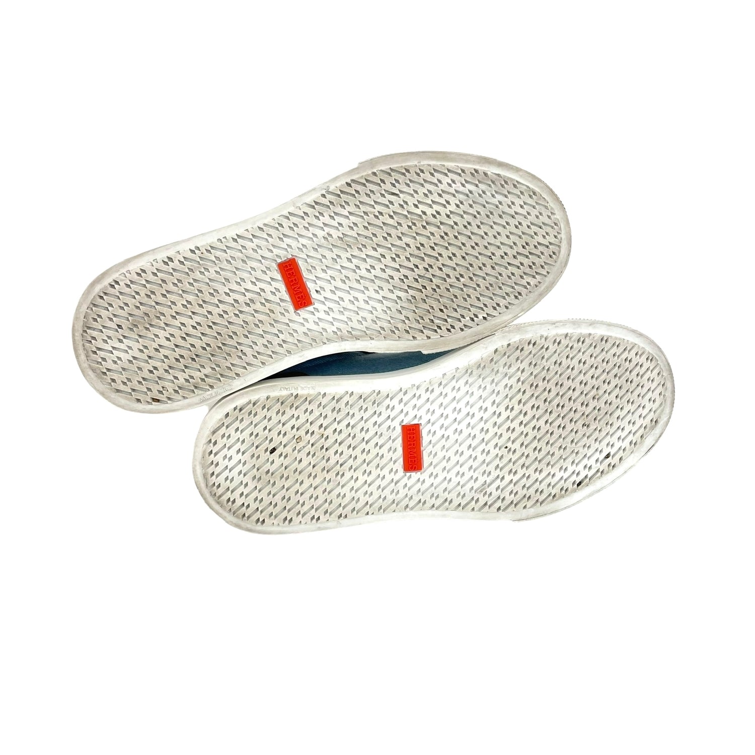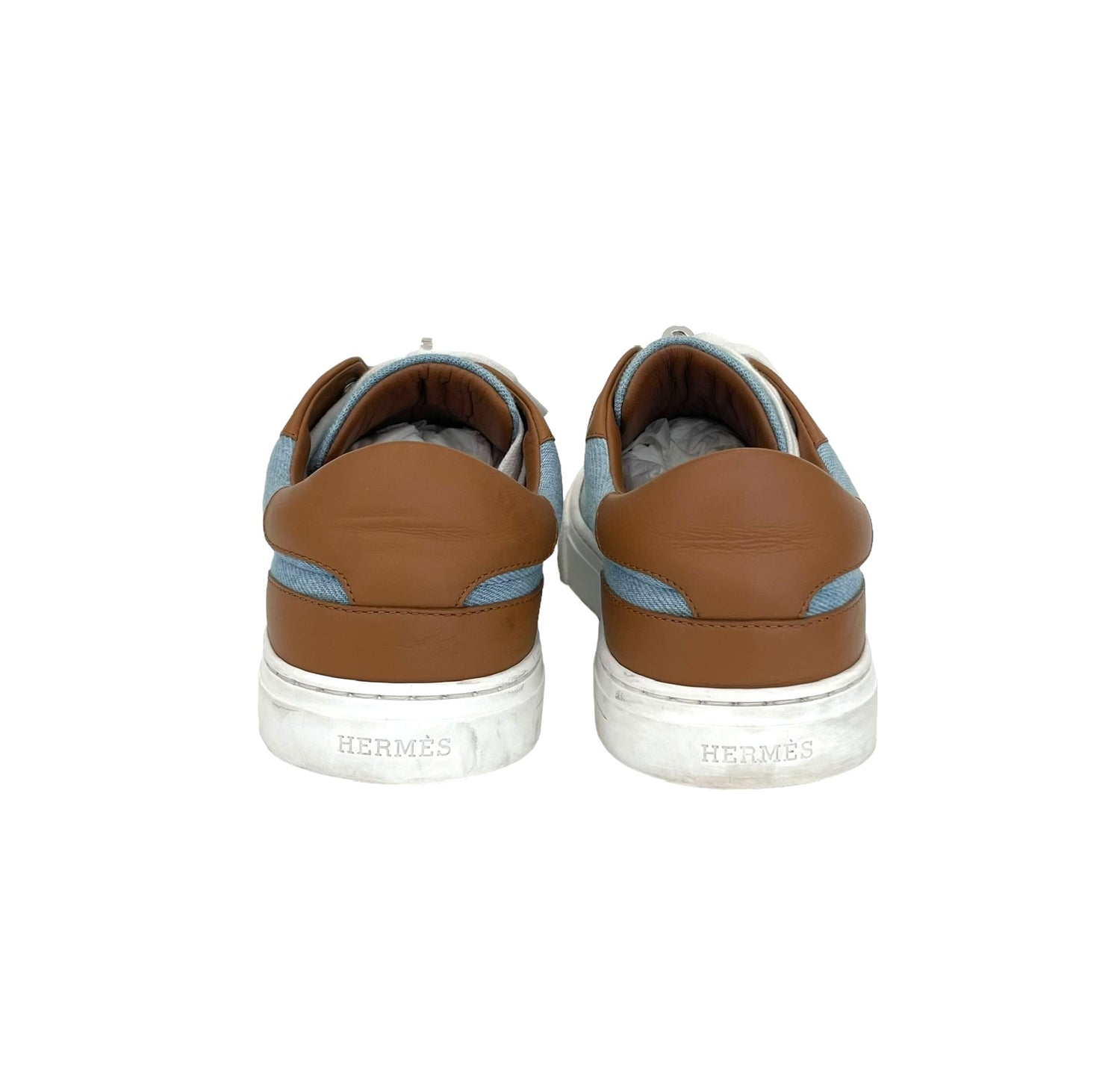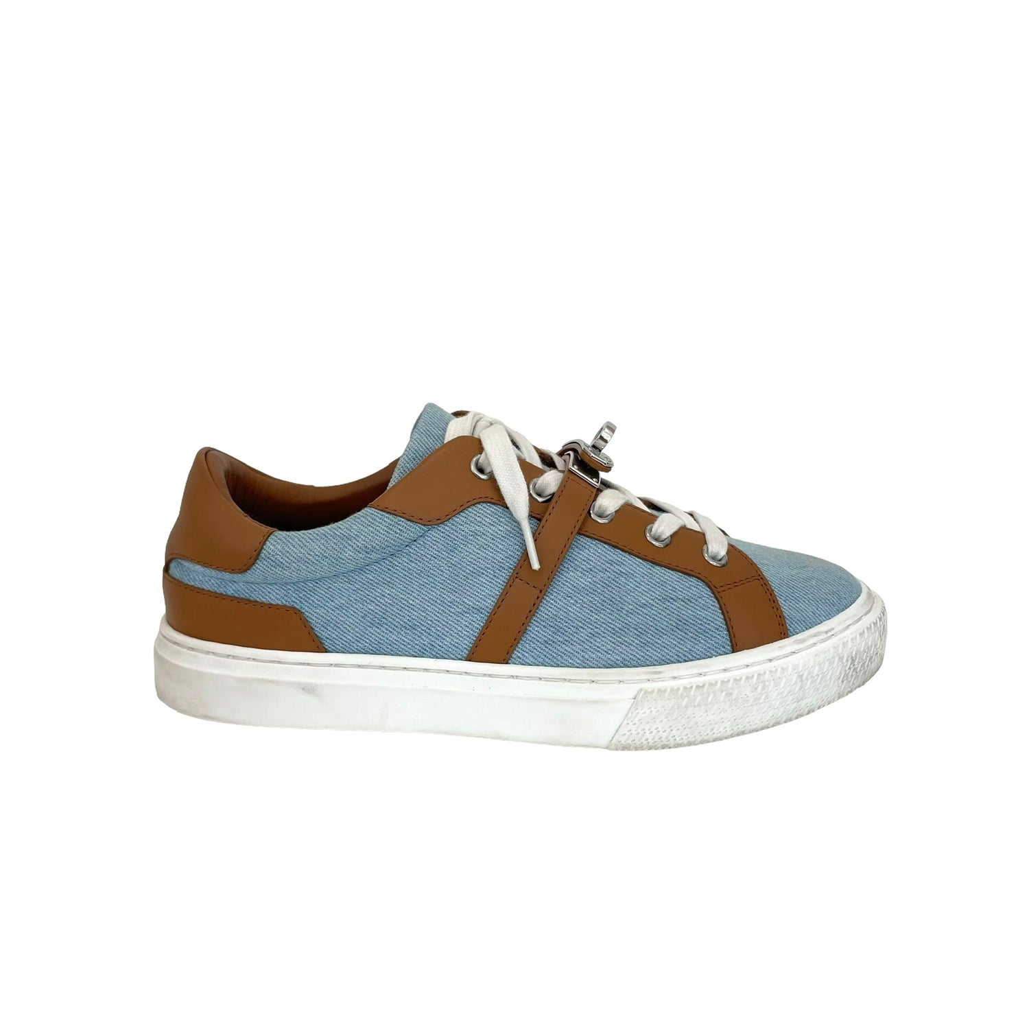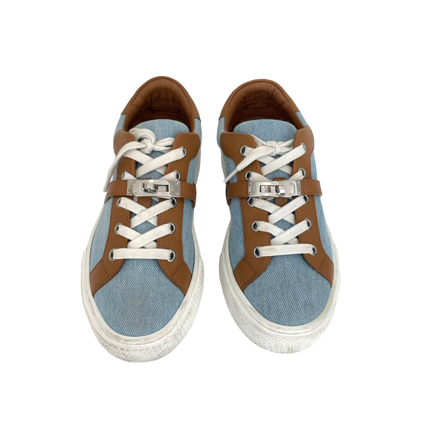 Hermes Day Sneakers. Denim canvas and gold leather. Palladium Kelly turn lock on top. Designer size 37 (true to size).
