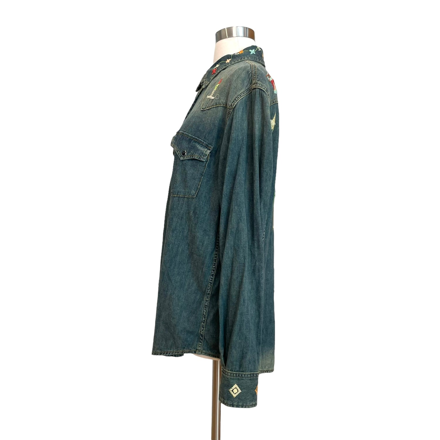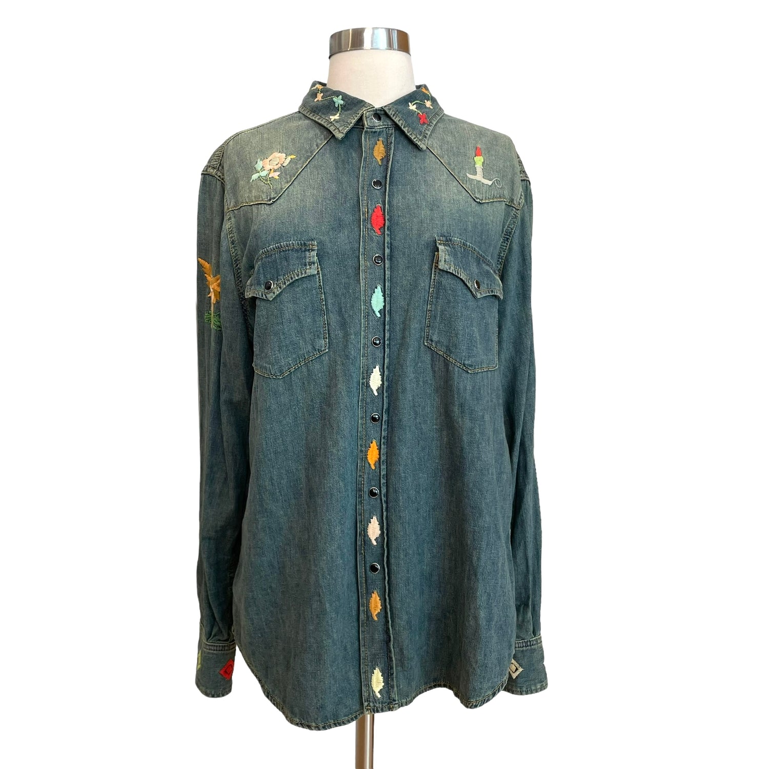 Saint Laurent denim embroidered shirt. Snap button closure. Pointed collar. Designer size XL.