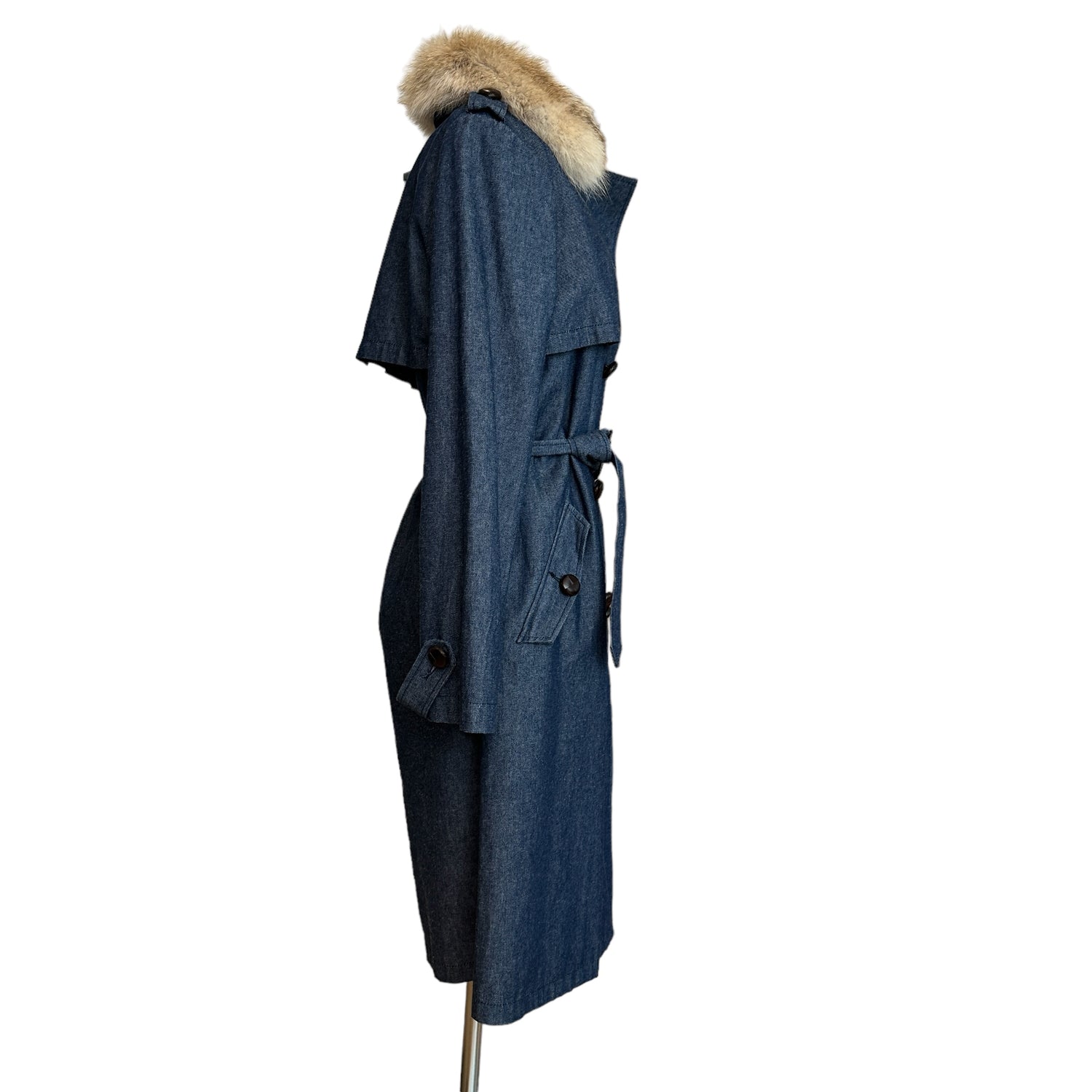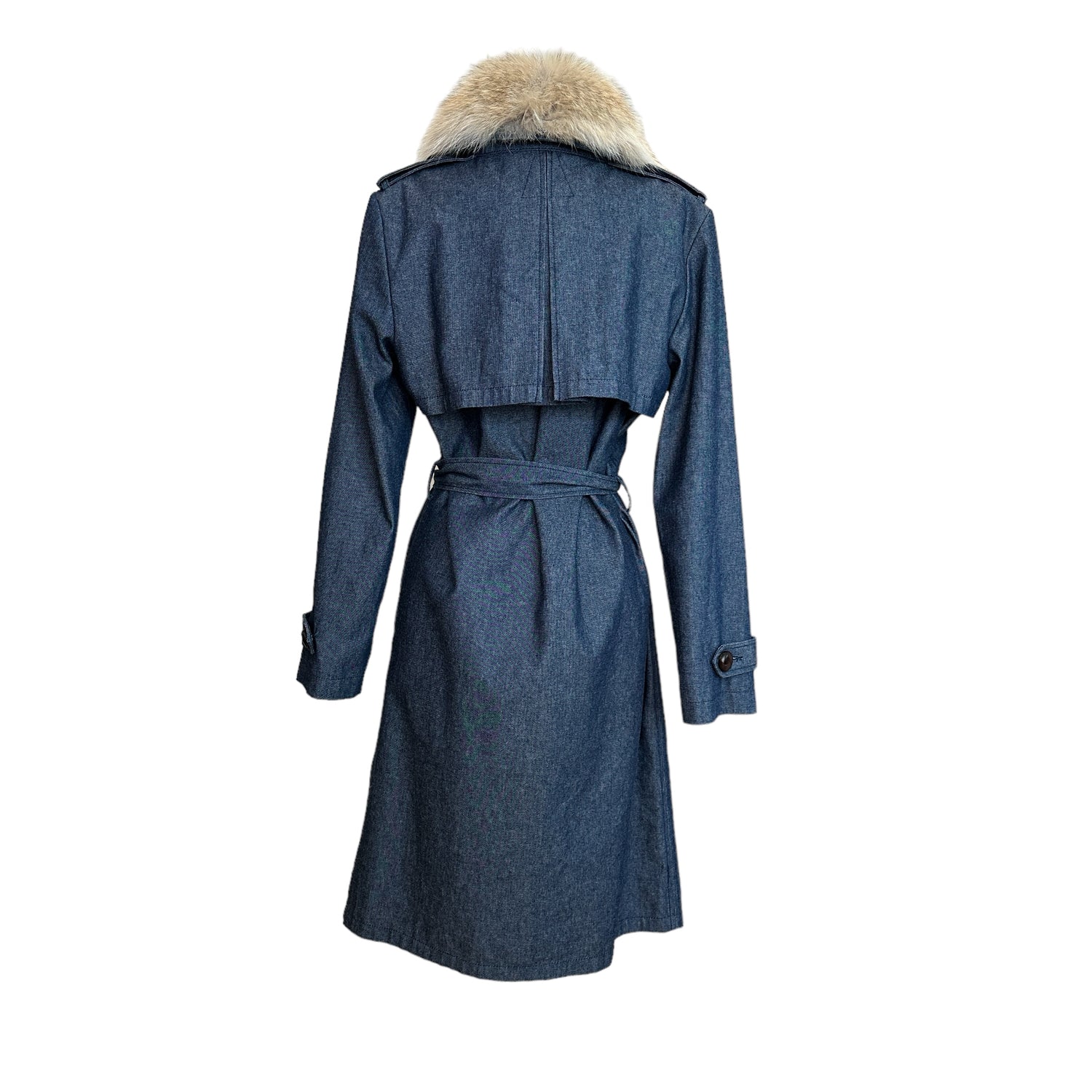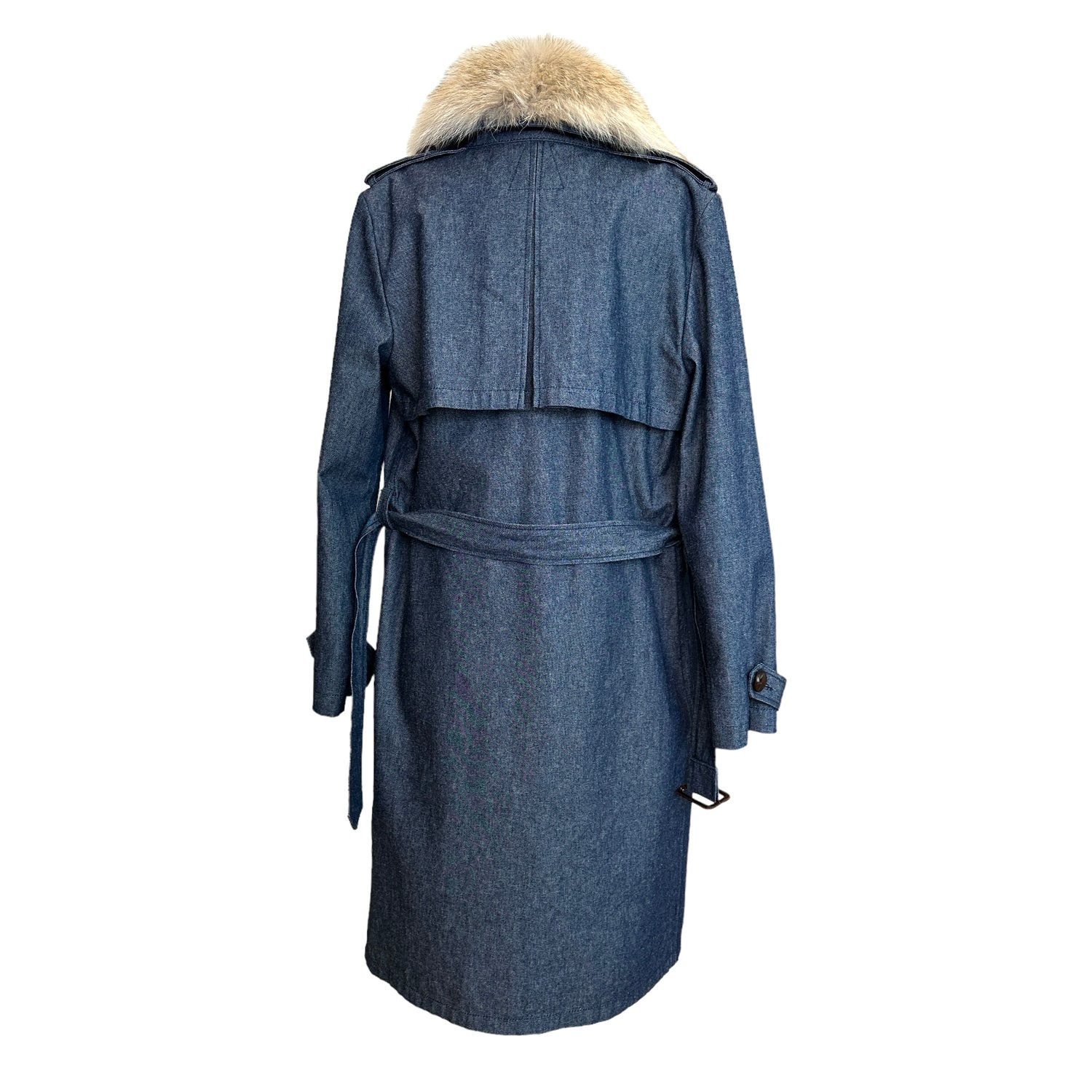 Jenni Kayne denim trench coat. Removable fur collar. Button closure at front. Removable belt. Pockets. Designer size M.