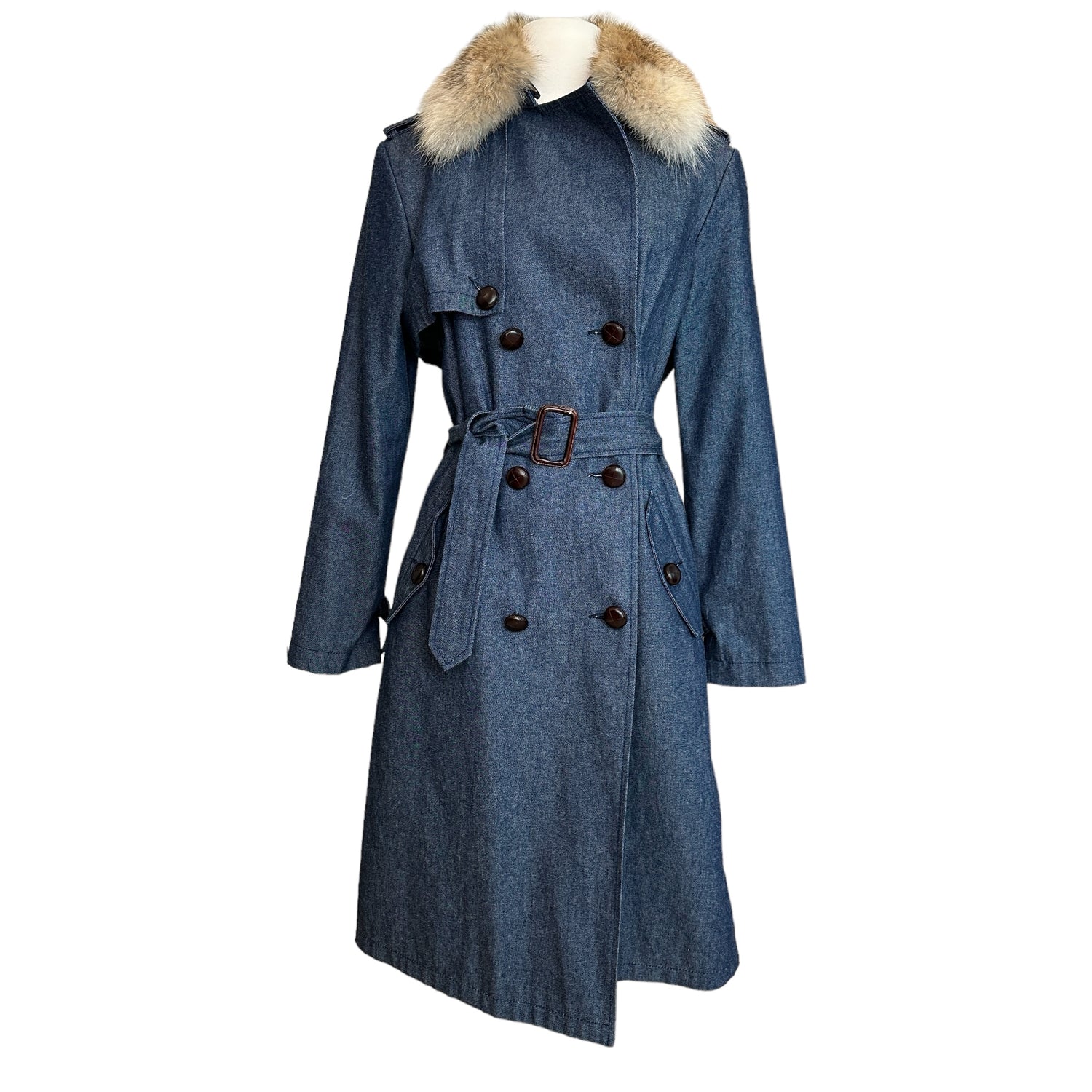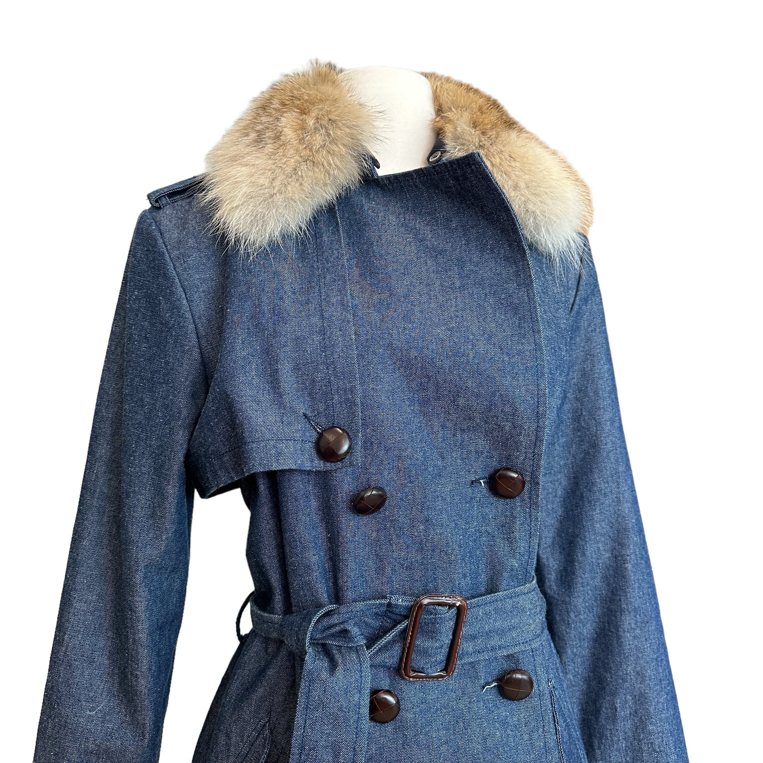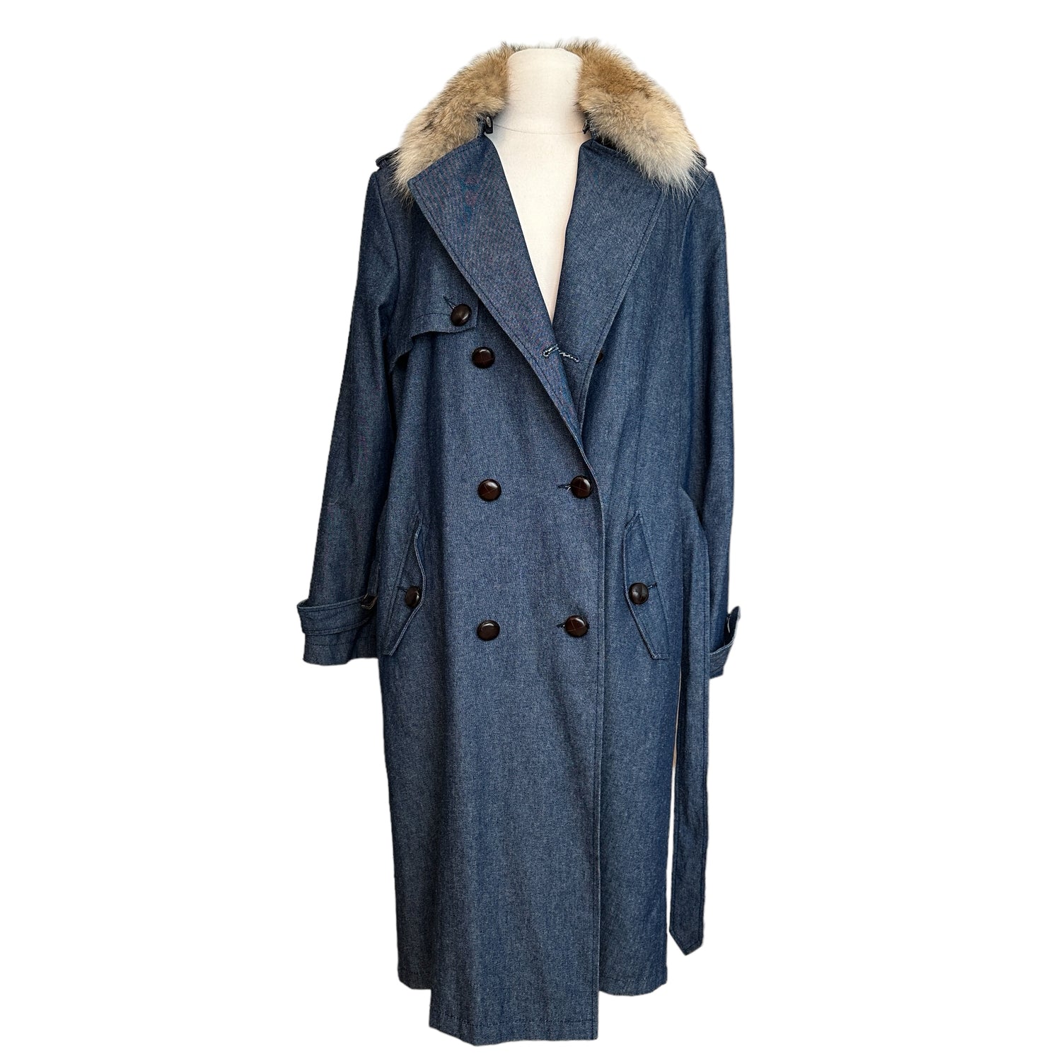 Jenni Kayne denim trench coat. Removable fur collar. Button closure at front. Removable belt. Pockets. Designer size M.