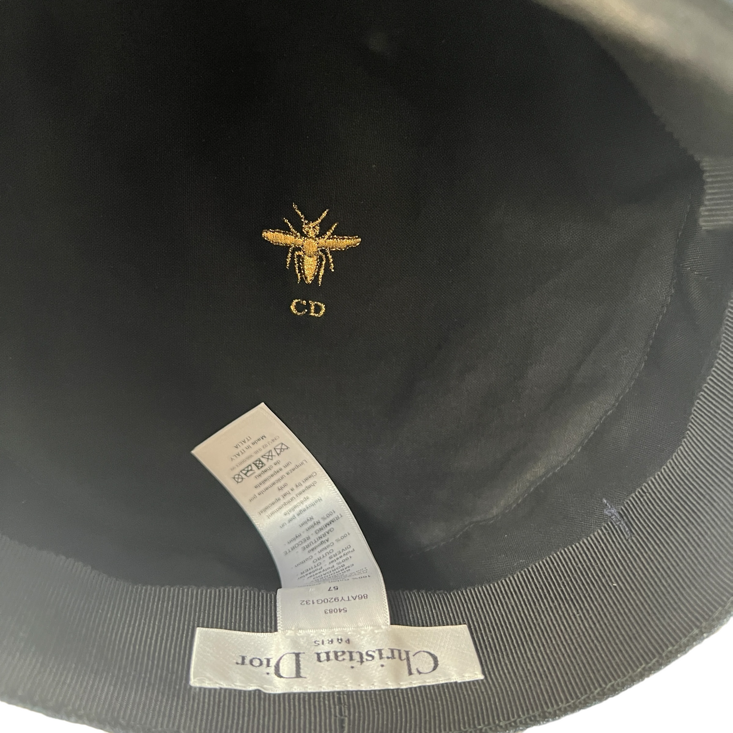Christian Dior denim hat. Mesh veil detail on top. Newsboy cap style. Dior logo in gold-tone hardware at back. Logo with bee stitched inside. Designer size 57.